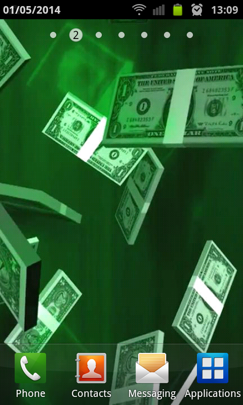 Dollar Rain Live Wallpaper Wants to be a millionaire, mobile phones fitted with this wallpaper, watching the falling money every day, maybe reality will also some day. Features: - Free. - Adjustable speed. - Does not drain your battery life time. - Option to enable / disable a stylish analog clock from live wallpaper settings( by default disabled). - Option to choose the clock color, to show / hide date, to show / hide the clock numbers, clock size etc. - Automatically resize to your resolution for the best view. - Can be moved to SD Card(App2SD support).