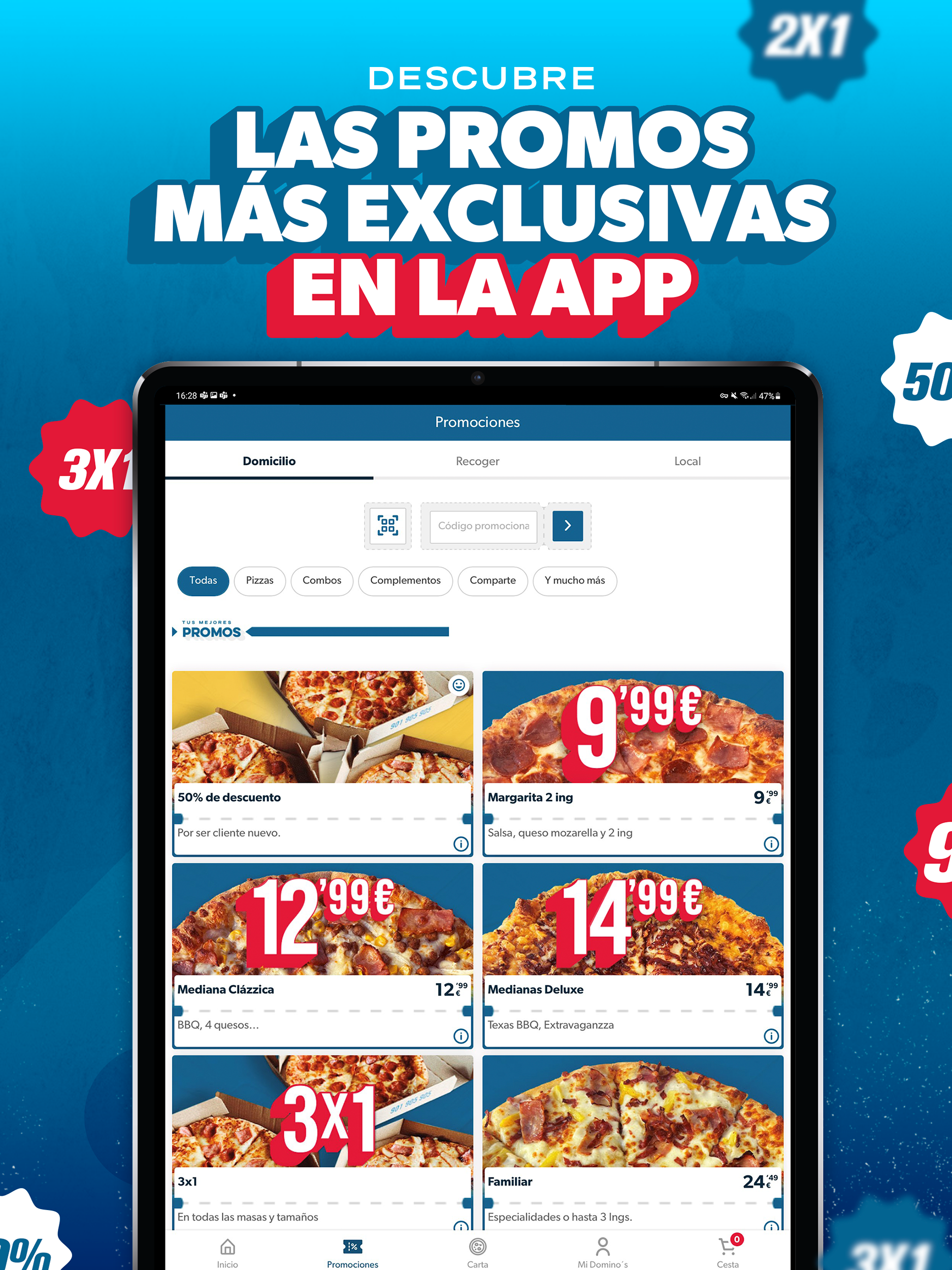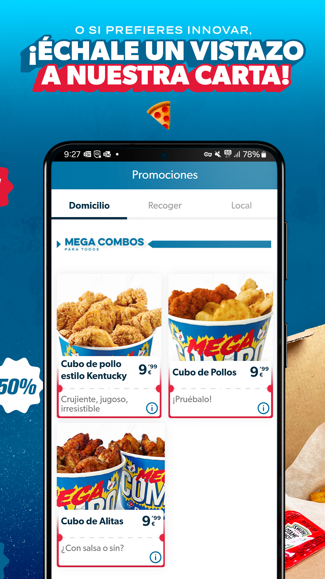 Domino's Pizza pizzas are known for their great taste and quality. Download the app to order food at home and take advantage of the most exclusive offers and promotions in food delivery and take away that you will only find in the Domino's Pizza Hot App! And also, authentic vegan pizzas! 🍕Cooked with a lot of love and affection and with the best ingredients, so you can eat it with your hands or a fork. The pizza that reaches your palate, a pizza cared for from start to finish, so you can enjoy it with or without a fork. Ordering food at home with the Domino's Pizza Hot App are only advantages! 🙌 • At Domino's you can create the pizza to your liking with personalized ingredients or order home delivery of your predefined pizza through the app and take advantage of the promotions, delivery and take away offers, coupons and exclusive discounts that You will only find it at Domino's Pizza. • Find your pizzeria for your take away orders among more than 400 Domino's Pizza pizzerias. • Follow the delivery status: Locate your pizza at home in real time with our Pizza tracker. • Schedule your delivery so that it arrives at the right time. Fast food, in a few minutes, at your home! • Repeat your food delivery orders or save your favorite pizzas. • Pay through bizum, with card or cash at your home. • Scan promotional codes with the Domino's Pizza Hot App, save addresses or reorder food at home in one click. • New sales channel. Order directly to your table from our App. Check participating stores in our legal. ARE YOU VEGAN? Order VEGAN FRIENDS, vegan pizzas for pizza lovers, without meat and animal derivatives. At good hours, green pizzas! Great variety of pizza doughs, made every day in our workshop with natural ingredients and foods. Set up your food delivery order with your favorite pizza and try the original hand-stretched dough or our cheese-filled roll doughs. You choose! Discover the crispy finizzima dough or our bread dough. Our gluten free dough, gluten-free and with all the flavor. Don't miss out on ordering food at home! Have you tried the new Croissanzzima dough? Croissant-style dough, soft and with an extra crispy edge. Finger licking good! Ordering food at home with Domino's Pizza is fast, easy and safe: 🛵Choose the nearest pizzeria (Delivery at home or take away). 🍕Order the pizza you like the most or make one with the foods you want. 🤑Apply coupons and offers and enjoy discounts on takeaway food. 💳Pay easily. 🤤Prepare your appetite for when the delivery arrives. Fast food, fast at your home. 🍴With or without a fork, eat the pizza to your liking! VEGAN? We have the ideal vegan pizza for you. Full of what you like! Try the Varvacoa Heura and Veggiña pizzas. Order food at home to enjoy pizza with the best ingredients whenever you want. We have the best delivery and take away starters and desserts to accompany the pizza and have the best experience in ordering takeaway food at home. Order food at home or delivery: 🍟Starters to whet your appetite: • Potatoes • Wings, chicken pops, nuggets, strippers and chicken kickers • Garlic breads • Hot cheddar and Camembits Combine it with your favorite sauces! 🍰Delivery food of desserts for the final touch to the palate: • Brownkie • Cookies • Vulcan • Pop Dots • Ice Cream Gluten intolerant? We have the perfect pizza with gluten free dough. The most intense flavor, gluten-free. Don't miss out on ordering food at home! Pizza, the best option to order food at home. We make pizza! The best pizzas in the world. Hungry for pizza? Download the app to order food at home or delivery and take away of the best pizzas.