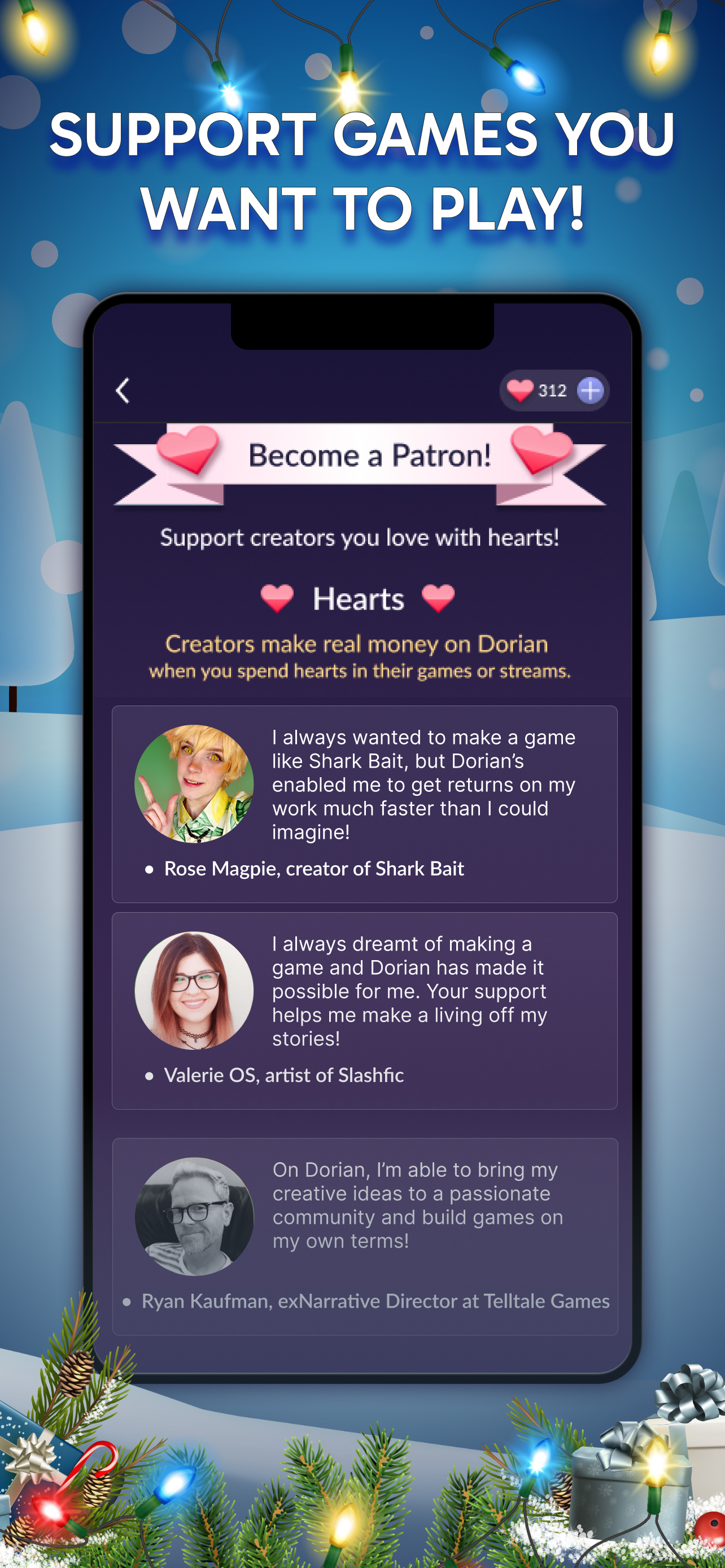 Create the world you crave: choose your ending or make your own fantasy! From LGBTQ+ romances, fantasy adventures, and spicy dramas to horror thrillers and K-pop vampire sagas — Dorian offers binge-worthy stories full of passion, mystery, and fateful choices. See which ending you’ll unlock, level up your relationships, and choose your destiny with your dream lover! Whether you’re here to play or create, Dorian makes it easy to step into worlds shaped by choice — and to support the artists, writers, voice actors, and cosplayers who bring them to life. Become a patron of emerging talent and help shape the future of storytelling! Join us in celebrating the creativity of indie developers, comic creators, and cosplayers building the next generation of interactive worlds. Here’s what you can do on the Dorian app: - PLAY story-driven games and series with rich characters, juicy twists, and real impact — where every choice changes what happens next. - CREATE your own interactive games, visual novels, or comics — no coding required. Build full-fledged games with relationship stats, branching romance routes, and complex game mechanics. - CONNECT with a global community of fans and creators. Share fan art, write fan fiction, or just chat about your favorite ships, scenes, and series. - INFLUENCE the next generation of game creators by supporting your favorites directly! - EARN from your creativity with premium choices, fan tips, character passes, and live event rewards — all built directly into the app. - GROW your fandom with tools for storytelling, monetization, and community-building. Fan-favourite hits include: - Slashfic – Flirt-to-survive horror where romance is deadly; - Shark Bait – A divine drama with shark gods and sacred kisses; - Hellbent – A devilish love story where temptation is power, and every deal burns hotter than sin; - Footnotes – A time traveling saga where you can fall for Roman soldiers or Aztec gods; - Golden Myth – A dazzling tale of gods, mortals, and destiny; - Ungodly – Become a god and rub elbows with Olympus in this gods-as-influencers murder mystery. Whether you’re here to make or immerse, Dorian is where stories become experiences — and creators become icons. Join the community: Instagram: @dorian.live; TikTok: @dorian.live Terms of Use: https://dorian.live/#terms-of-use