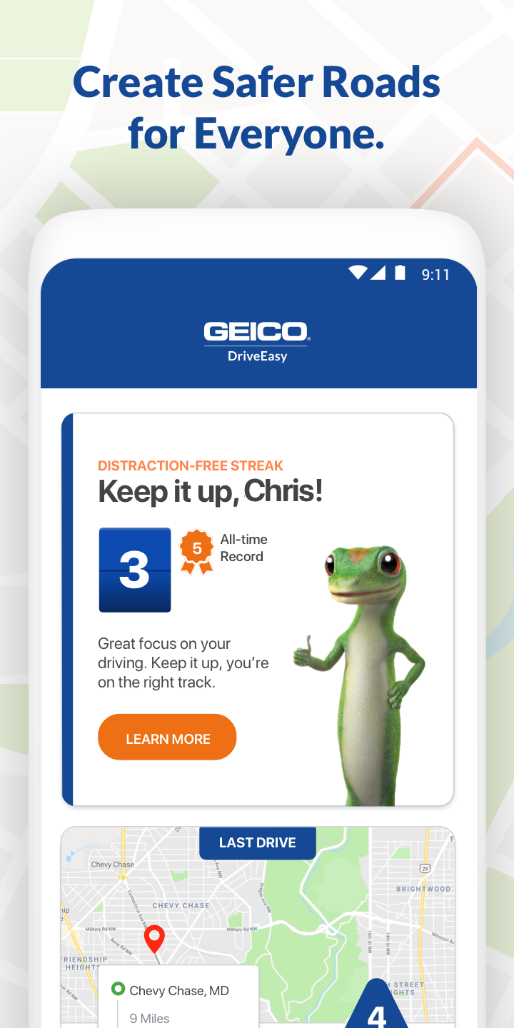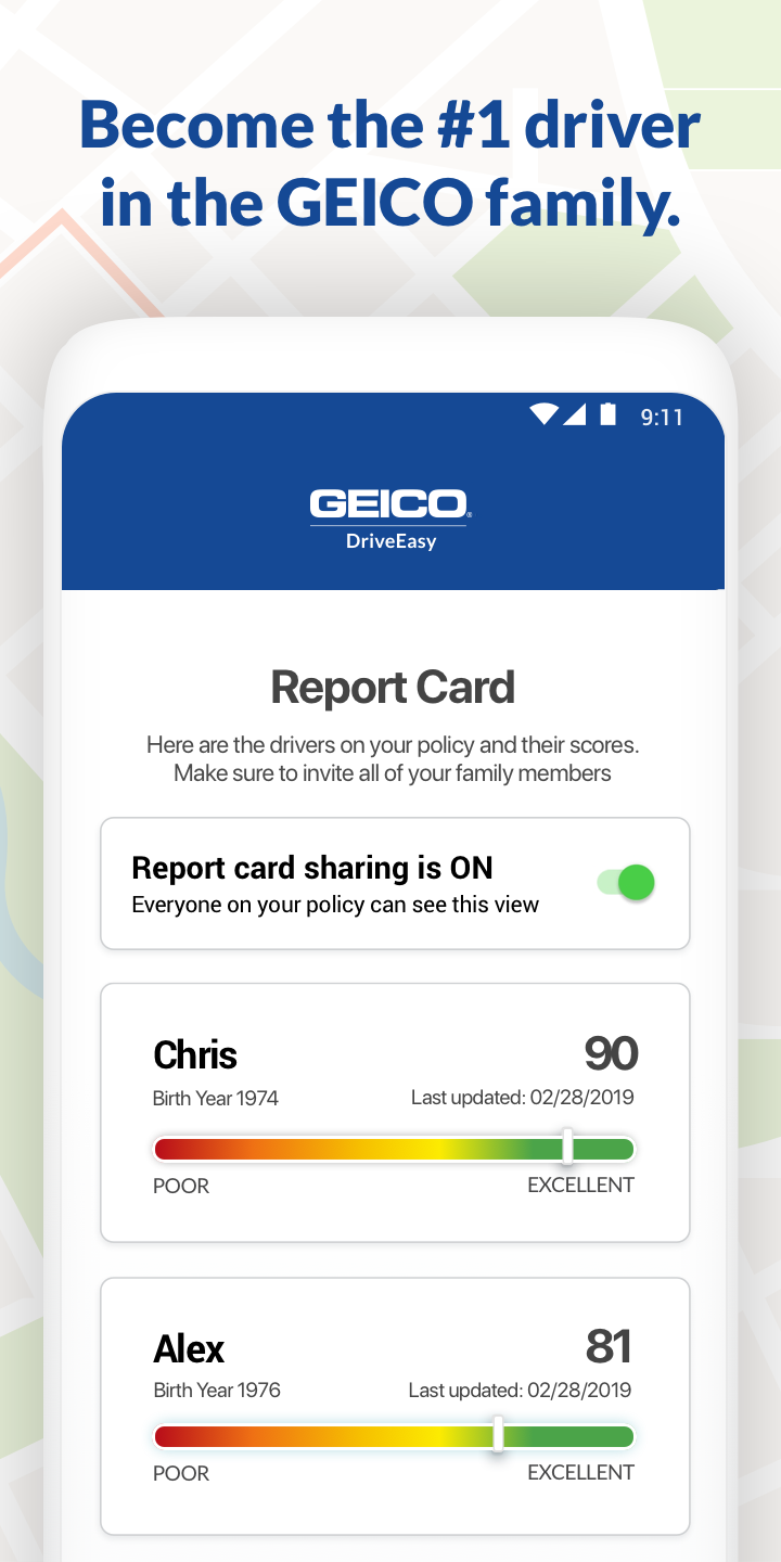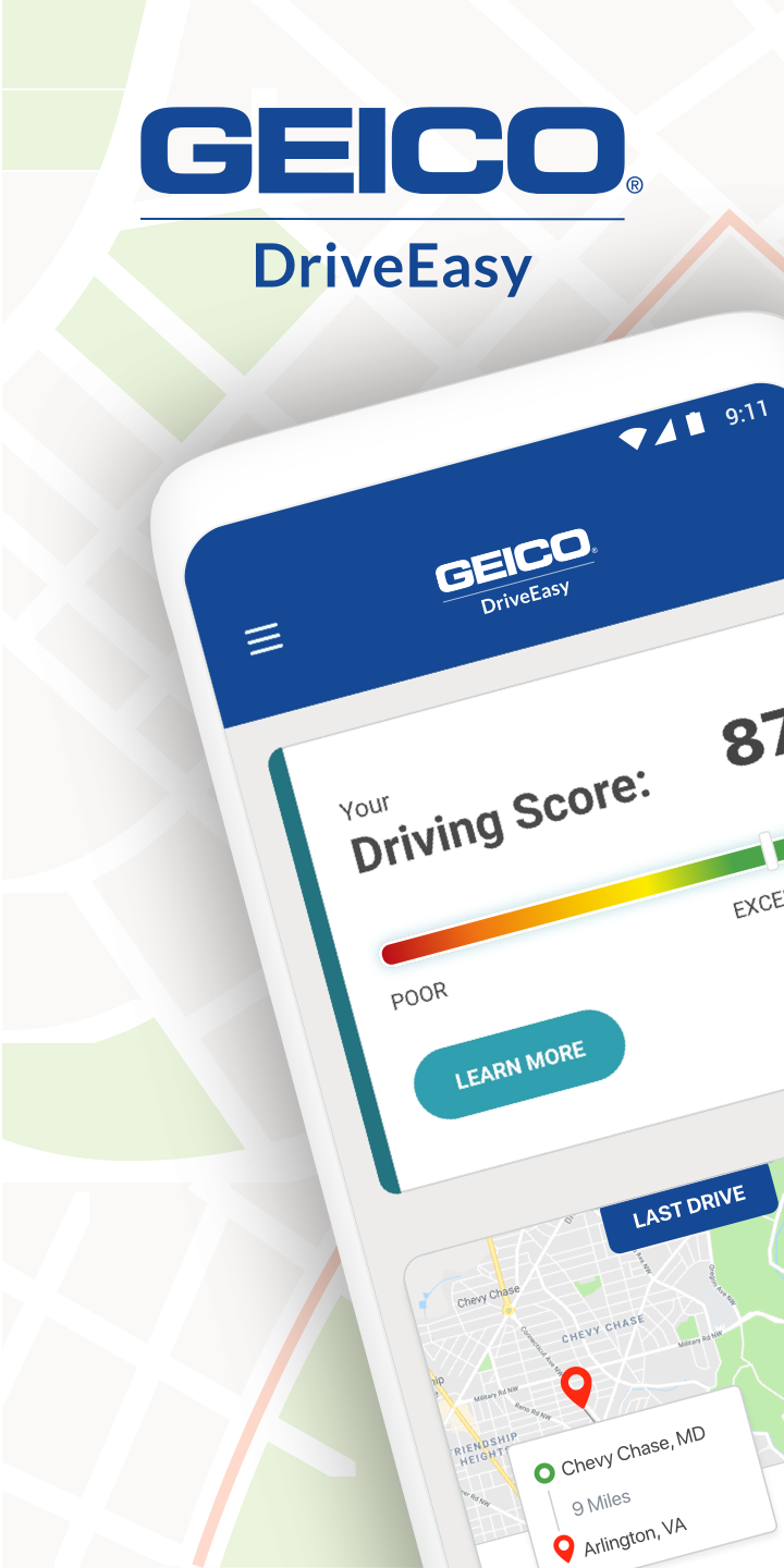 DriveEasy! By utilizing technology on your phone and working with you, we can help make the roads a little safer for everyone. Drive. Learn. Improve. Can you get a perfect score? We think you can. How does DriveEasy work? - Securely reviews your driving habits automatically from the app - See personalized info about how you’re driving - Review things like hard braking, phone handling, distance driven, and time of day - Break your record for no distractions - Beat your personal best with tips to improve your score - Invite other drivers on your policy to see who can get the best score Let’s Do This - Download the DriveEasy by GEICO app - Type your phone number - Enter the code - You’re done! A Few Notes Continued use of GPS running in the background can dramatically decrease battery life. To learn more about DriveEasy please visit geico.com/DriveEasy