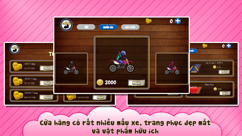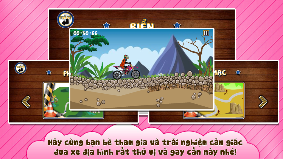 Đua motor là thể loại đua xe vô cùng thú vị với nhiều phiên bản khác nhau. Bạn hãy đến với G-Studio và cùng thử sức với phiên bản Đua xe địa hình hấp dẫn này! Mô tả: - Game có 2 kiểu chơi là Nghiêng và Chạm - Với 4 kiểu địa hình cơ bản: Cao nguyên, Biển, Sa mạc và Thành phố; bạn chỉ cần khéo léo điều chỉnh để motor vượt qua các mốc cơ bản và về đích an toàn - Game có đồ họa đẹp, âm thanh hấp dẫn cùng với các hiệu ứng hình ảnh phong phú - Cửa hàng có rất nhiều mẫu xe, trang phục đẹp mắt và vật phẩm hữu ích, bạn hãy chọn cho mình một chiếc motor sành điệu nhất để trở thành một tay đua cừ khôi. Hãy cùng bạn bè tham gia và trải nghiệm cảm giác đua xe địa hình rất thú vị và gay cấn này nhé! ***** Dua motor la the loai dua xe vo cung thu vi voi nhieu phien ban khac nhau. Ban hay den voi G-Studio va cung thu suc voi phien ban Dua xe dia hinh hap dan nay! Mo ta: - Game co 2 kieu choi la Nghieng va Cham - Voi 4 kieu dia hinh co ban: Cao nguyen, Bien, Sa mac va Thanh pho; ban chi can kheo leo dieu chinh de motor vuot qua cac moc co ban va ve dich an toan - Game co do hoa dep, am thanh hap dan cung voi cac hieu ung hinh anh phong phu - Cua hang co rat nhieu mau xe, trang phuc dep mat va vat pham huu ich, ban hay chon cho minh mot chiec motor sanh dieu nhat de tro thanh mot tay dua cu khoi. Hay cung ban be tham gia va trai nghiem cam giac dua xe dia hinh rat thu vi va gay can nay nhe!