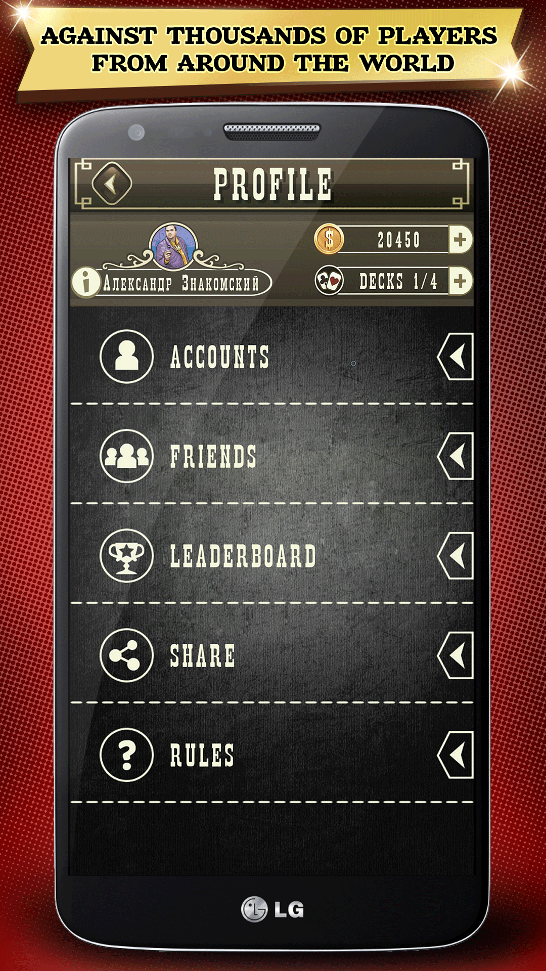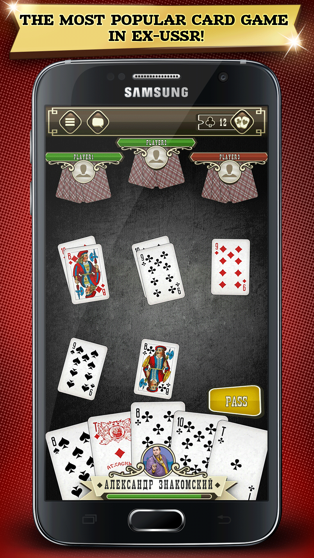 Features of the game: - three varieties of the game (classic durak, throw-in durak and passing durak) - online game lobby with room list - two, three and four players game - tournaments every day - play with your friends from social networks - game chat with emojis - six unique deck and gameboard designs - game hints (look at discard pile etc.) - private rooms, protected with password - daily bonus - ergonomic user interface - tough AI - daily, weekly, monthly, lifetime leaderboard Durak is a Russian card game that is popular in post-Soviet states. Every child and adult, if asked “What card game should we play?” will answer you without any hesitation - “Russian durak!”. There are tons of varieties of this board game: passing durak, throw-in durak, armenian durak, albanian durak, chukotian durak, and a lot of others. The object of the game is to get rid of all one's cards. At the end of the game, the last player with cards in their hand is referred to as the fool (durak). The game is typically played with a deck of 36 cards (numerical cards 2 through 5 are removed from a standard 52 card deck prior to play) and is played with two to four people. The deck is shuffled, and each player receives six cards. The top card on the remaining deck is made visible and placed at the bottom of the deck at a 90 degree angle (so that its denomination and suit are visible). This determines the trump suit, however the revealed card is actually a part of the deck, the last card to be drawn. The player with the lowest trump is the first attacker. A deck of 36 cards limits the number of players to six, although some variants allow more than one deck to be used. If multiple games have been played, often the loser of the previous game shuffles and deals. Russian durak is a very important part of board game and card game culture. This card game occupies worthy place among other famous game masterpieces. The most popular varieties are classic durak and throw-in durak. Passing durak is the most unpredictable variety of the game, will give you tons of pleasant emotions. Invite everyone and play russian durak online with friends. If you are tired of boring solitaire and checkers, too complicated chess and poker, monotonous backgammon and dominoes, than you will love russian durak online! If you have no internet on your device - challenge our smart AI, if you have internet - play durak online with friends or random opponent!