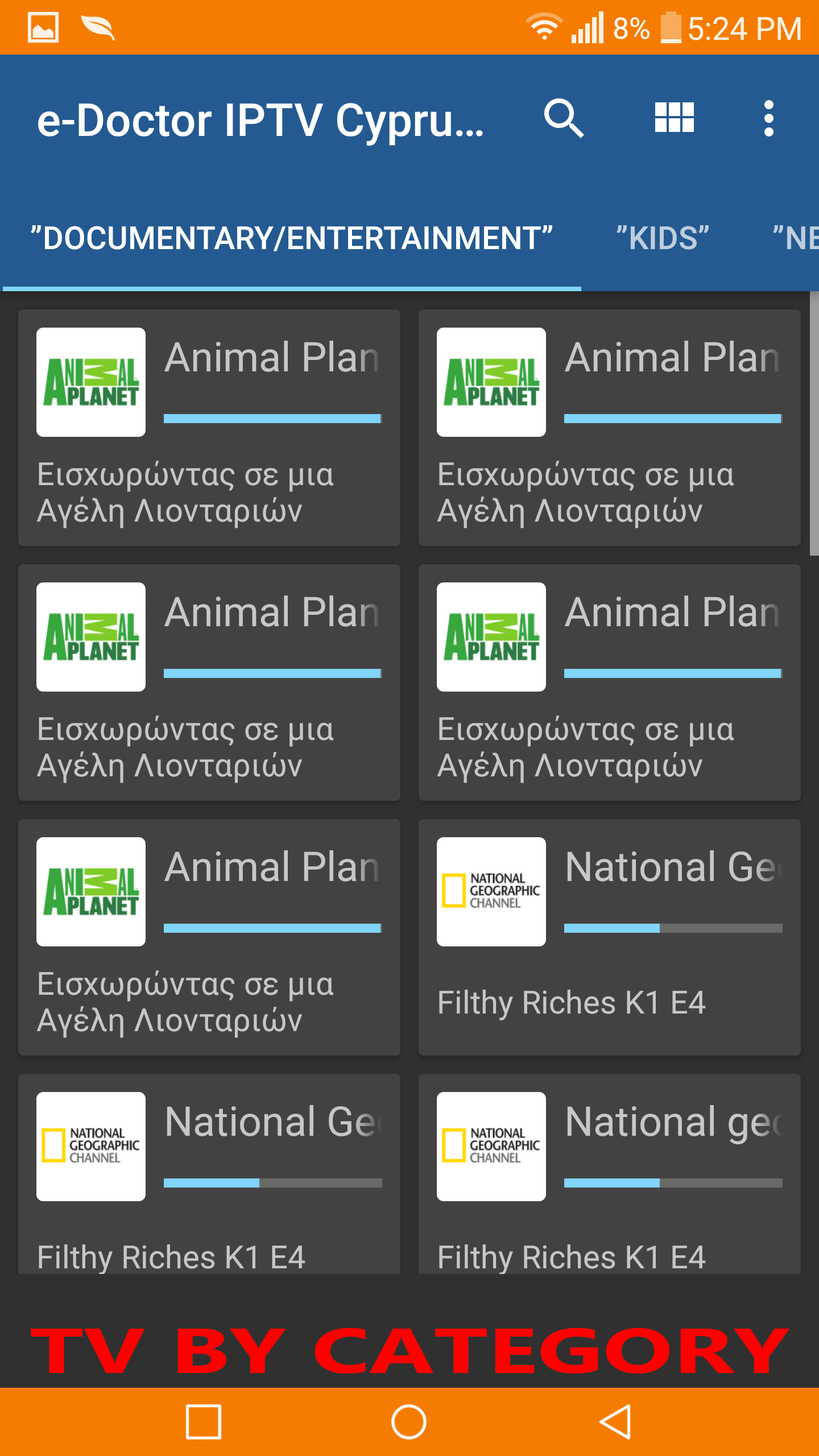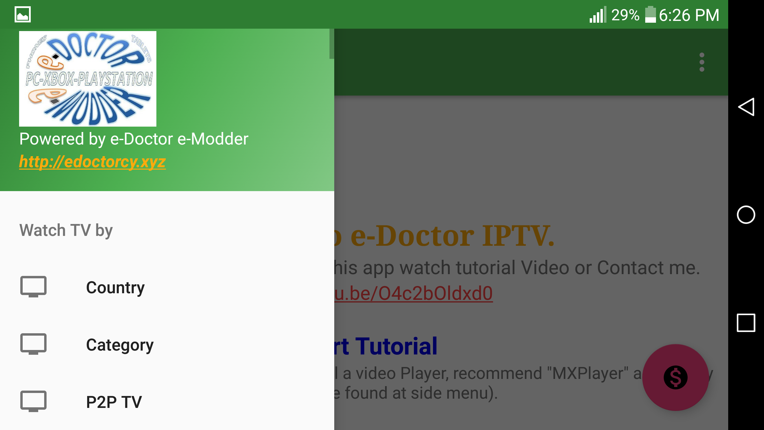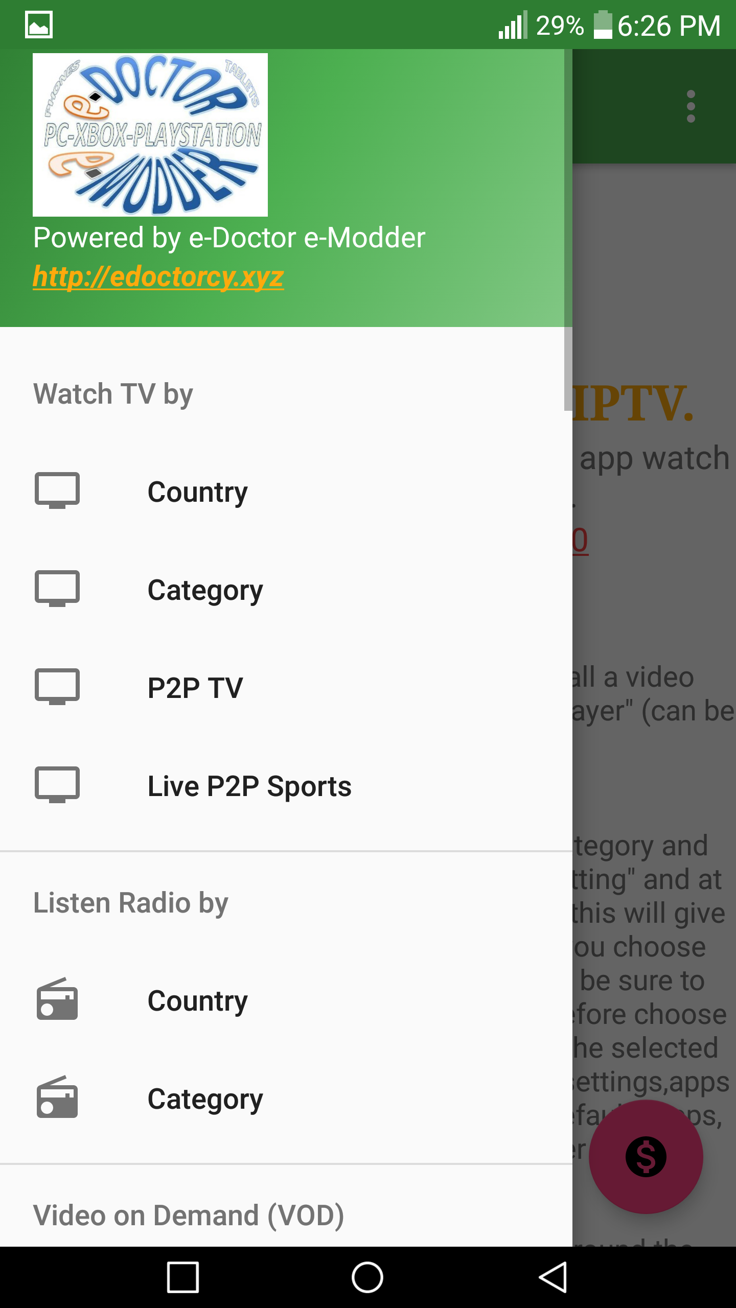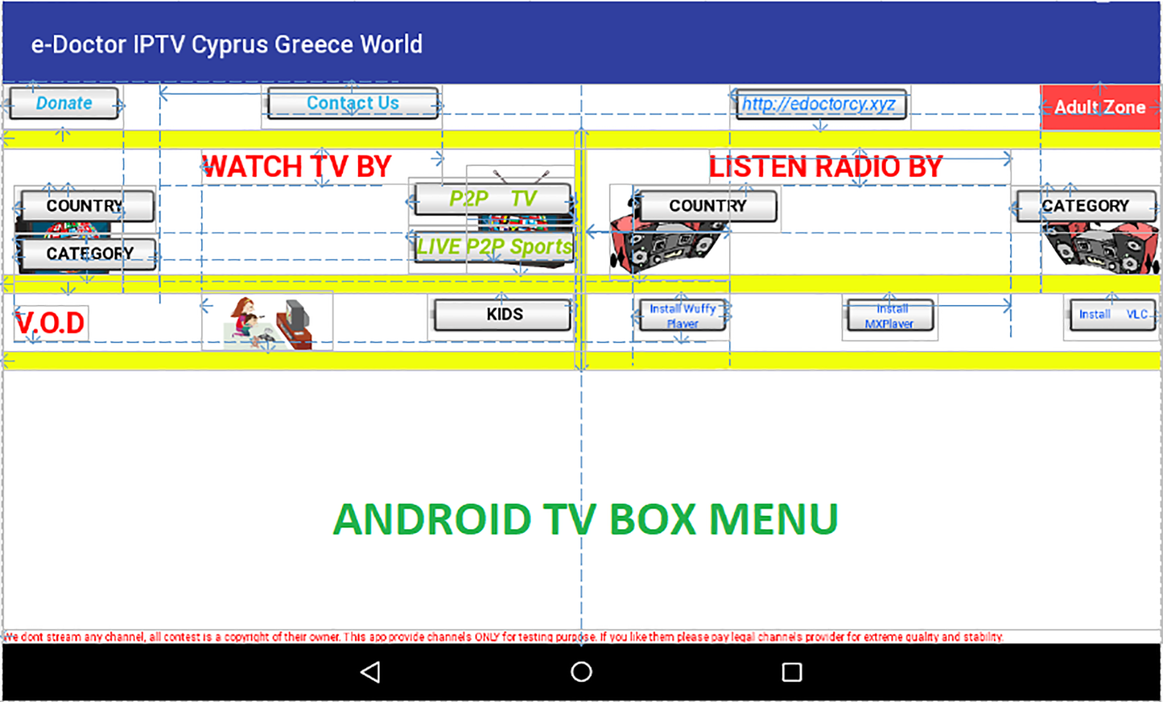 WARNING: We don't stream any channel, all contest is a copyright of their owner. This app provide channels ONLY for testing purpose. If you like them please pay legal channels provider for extreme quality and stability. We are not responsible for any non working links as is streamer decision to stop free streaming. NOTE: IPTV Core Required for this app to work (without iptvcore this app is useless). NOTE: Before you Install you agree you have to install extra apps for this app to work, otherwise don't install. NOTE: This app has ads when you start and when you choose category, if you don't like that please don't install. NOTE: Watch Tutorial Video for Help. If still Problems Contact us, we will answer you within few hours. e-Doctor IPTV is the best iptv app for watching TV, P2P TV & Sports and listening Radio through your internet connection. With automatic channel list updated you can watch TV or listen to Radio just using your phone or tablet anywhere. Even at home using android TV box directly to your TV. TV List: By country (currently Cyprus, Greece, USA,UK,France,Germany,Spain, India.... etc) (REQUIRED enable MXPLAYER "Loop one" FOR "USA_LOOP-ONE" etc.) By category (Documentation/entertainment, Kids, News, Music, Sports, Cinema) -English Language available. P2P Live Sports (Redirects you to website with updated matches) P2P TV (Romania, Bulgarian, Russian (some with English) categories) Radio List: By country (currently Cyprus, Greece, UK, Germany, Spain ) By category (Some English Music Channels by Category) VOD List: KIDS Movies Also Working EPG (electronic program guide) for Greece and Russian channels is available (Choose Tile). App requirements: - Internet connection of-course :) (at least 5MBs) - IPTV Core (install from Google Play) - Video Player (recommend MXPlayer,VLC for acestream P2P) - Youtube Player for some Channels - Acestream and Sop to Http for P2P TV and Sports. Note1: List updated every week without the need to update application. Note2: App needs a few seconds to load list and epg. Configure app to change Video Player (see last photos) - After choose category Go to settings (upper right dots) - At Streaming Player Choose System Select (will ask you which player to use for the channel you choose). Configure MXPlayer for normal Multi language support: - Go to settings - Decoder - Find "SW decoder (network)" and check the box. If you want English (or any language) as Default audio language - Go to settings - Audio - Find "Preferred audio Language" and choose your preferred language (you can choose more than one). Fix MXPlayer AC3 not supported - Download codecs from "https://forum.xda-developers.com/devdb/project/dl/?id=25033" - After download complete open MXPlayer and when prompt "codecs found use them'' click yes. MXPlayer should restart and everything should work.