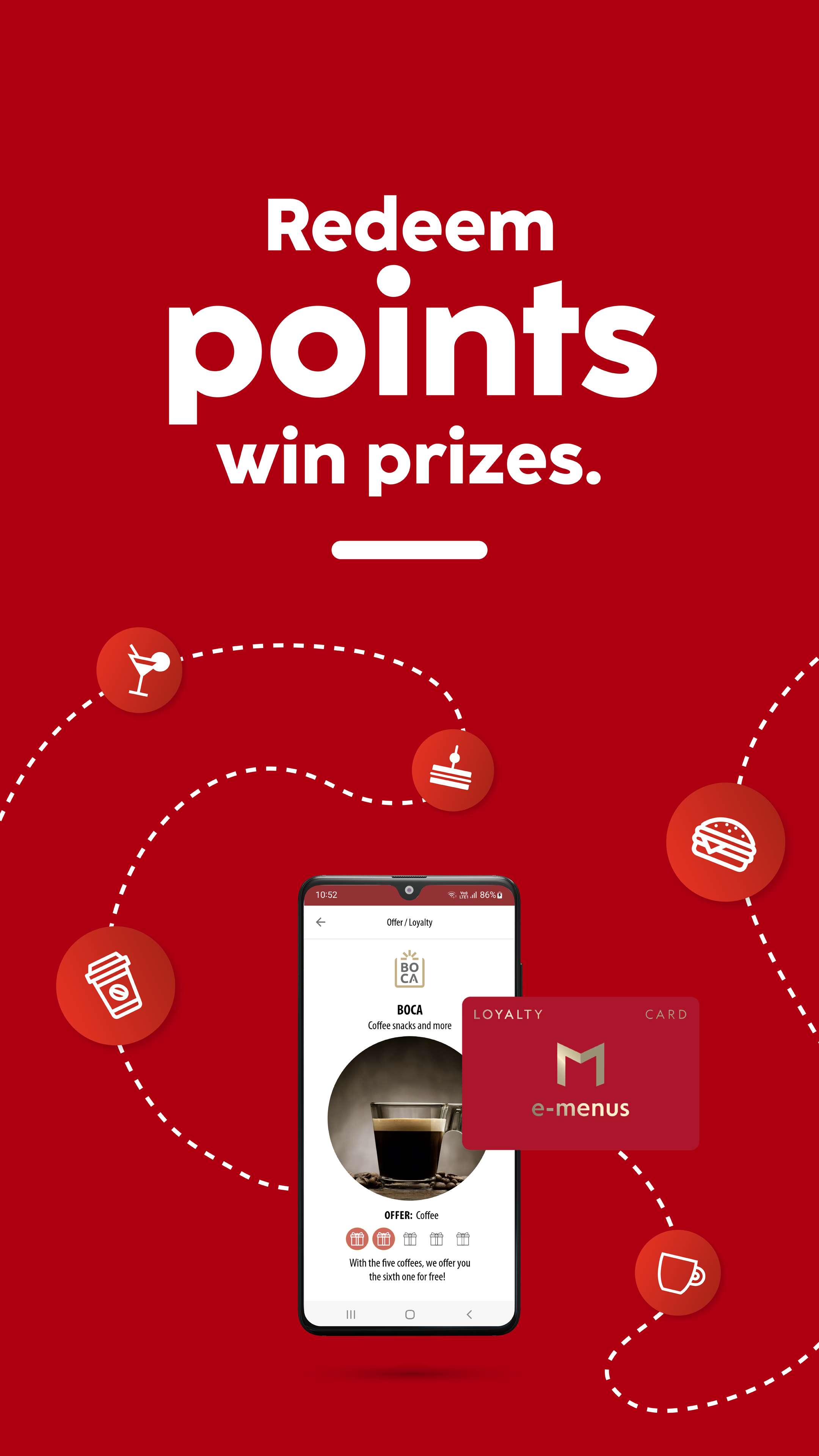 If you are a fan of good food, if you like to experiment with various cuisines, if you want to be informed about what restaurants or bars exist in your area or in other areas, the e-menus application is for you. This is what you do: Download the e-menus application on your mobile. Several catering establishments appear on your screen with all necessary details. You make your choice. You call and book a table. Via GPS you are guided you to the store. You sit with your company at the table in the restaurant, cafeteria or bar and open the app. It immediately recognizes where you are and instantly displays the menu in the safe environment of your mobile. And not only that but in the language of your mobile! You do not have to wait for the waiter to bring you multi-page catalogues that have passed through so many hands, but through the e-menus app you can safely give your order to the waiter. LOYALTY PROGRAMME The LOYALTY PROGRAM is applied by those stores who wish to reward its inhouse or takeaway customers for being regular and loyal. For the customer “fan” of a particular store the LOYALTY PROGRAM is a fun game of gathering offers and gifts. How it is “played”: - When paying at the cashier of the store, the customer, if he has downloaded the application, earns one or more "points". The"point" is the characteristic gift box. Earned points are also immediately listed in "my offers" in the app menu. - At the same time, a card, like a digital credit card, appears in the "my offers" option (in the application menu) where the customer can see his offers in the store or in the other stores he frequents. - By collecting the number of "points" set by the store, the customer has the pleasure of enjoying, for free, the store's offer, within the LOYALTY program! HAPPY HOUR PROGRAM E-menus, the unique application that enables the user to see the Happy Hour of his favorite stores instantly and enjoy discounts up to 90%! The user benefits from very low prices, while at the same time helping to avoid food waste, a problem that is of particular concern to the modern world. The E-menus application enables the entrepreneur, with three simple moves, to create Happy Hours on the days and hours he wants, to set the discount rate on the items offered and thus create mobility in his store at hours that are not particularly peak, contribute positively to his turnover and avoid food waste. This is how modern catering businesses work today! Simple as that!