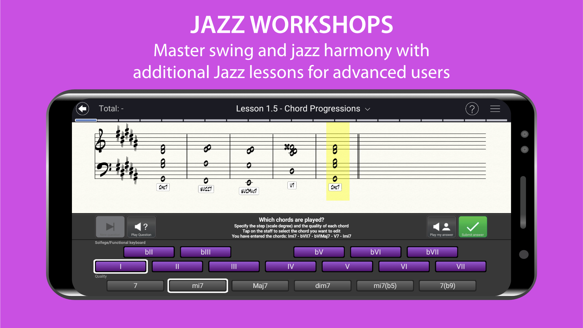 JAZZ WORKSHOPS - Exercises for advanced users with jazz chords and progressions, swing rhythms, jazz sight-singing and sing-back exercises based on jazz classics such as "After You've Gone", "Ja-Da", "St. Louis Blues", and many more.