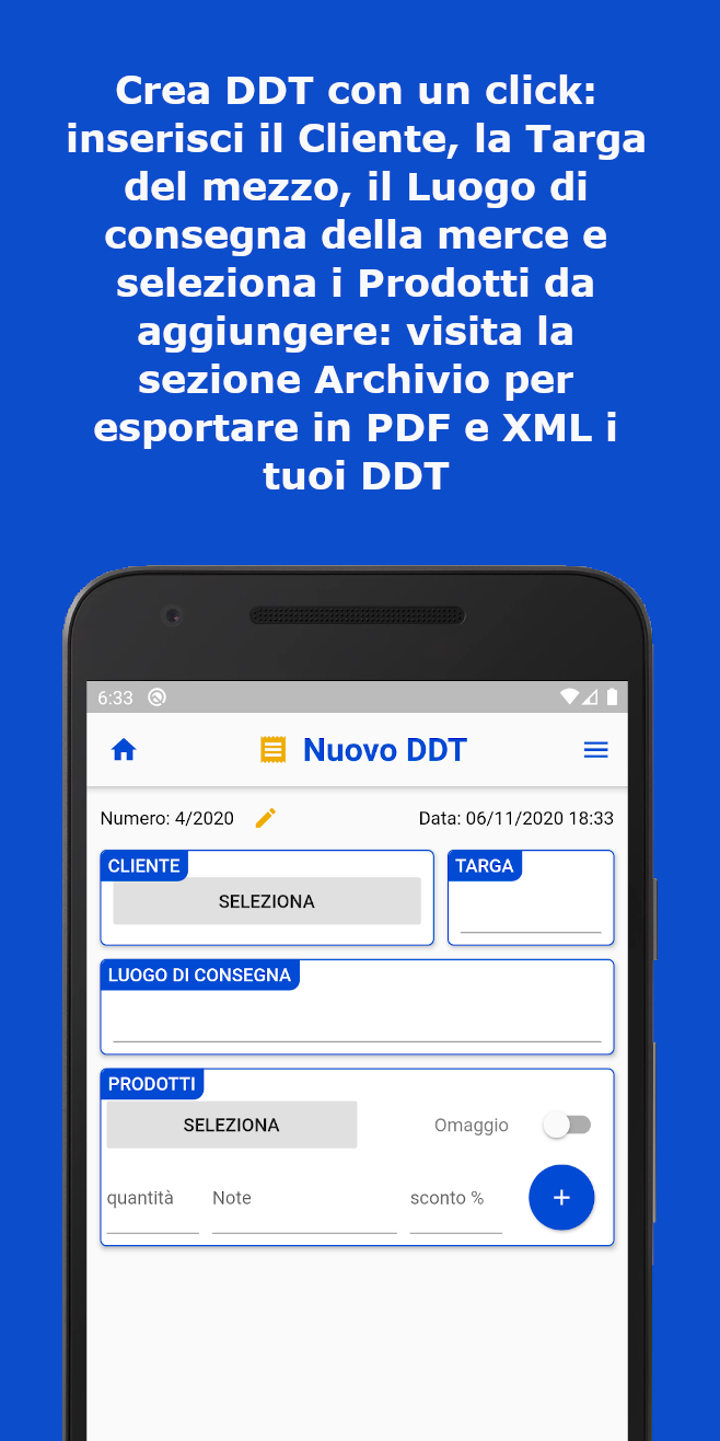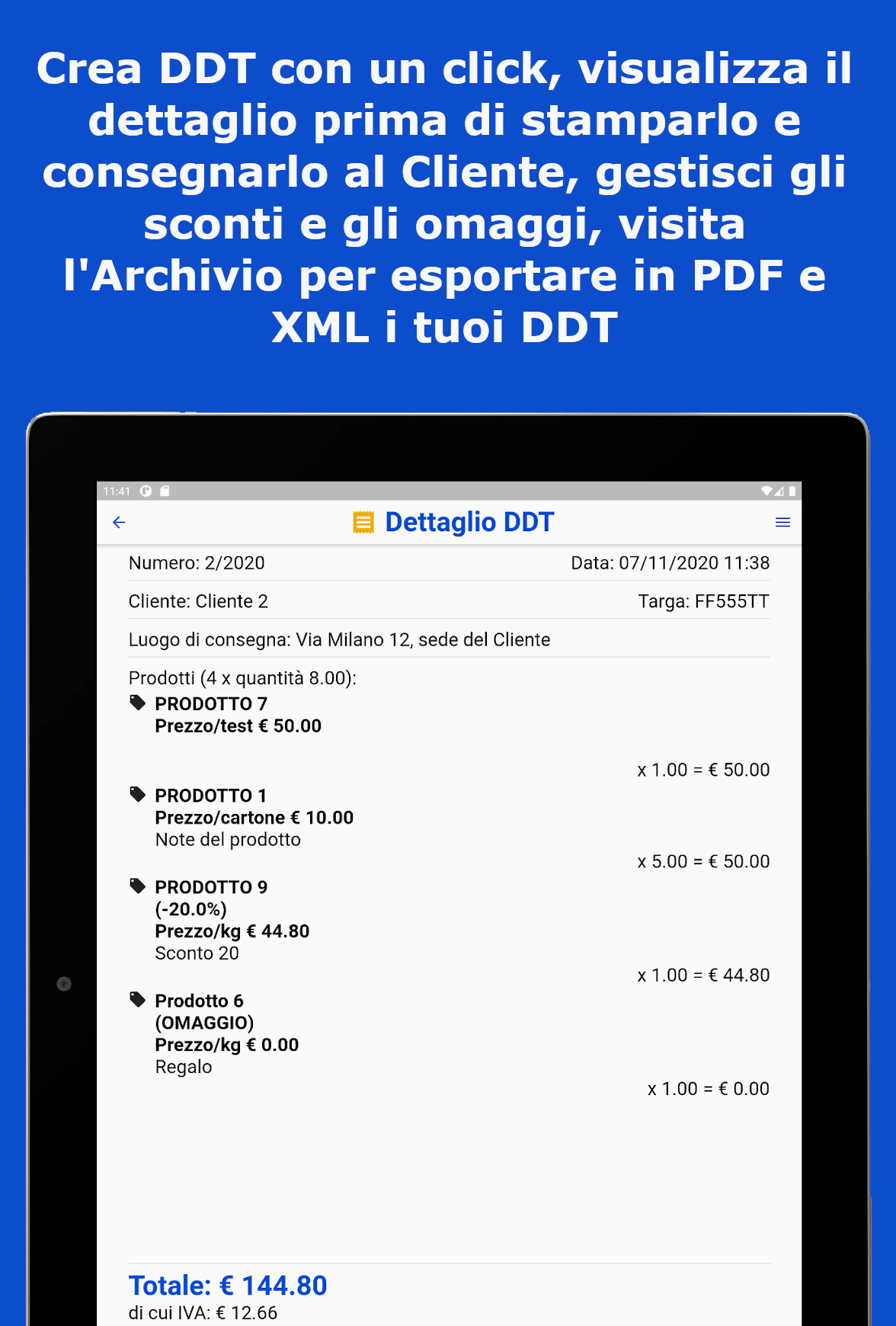 print the loading document to take with you during deliveries, export one or more transport documents generated in XML format (currently compatible with the management software