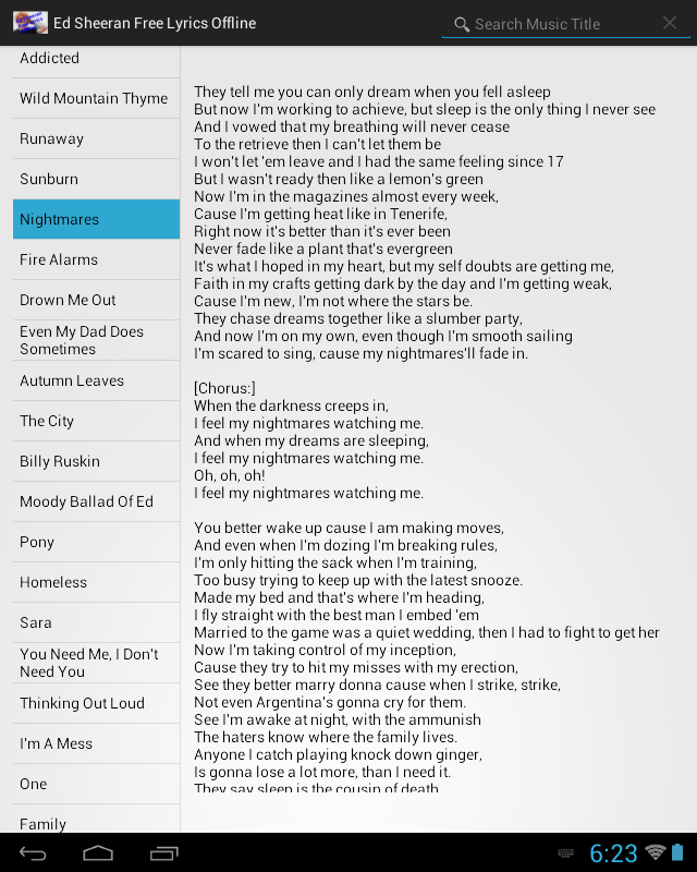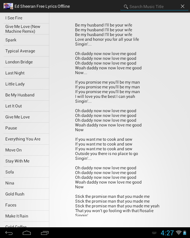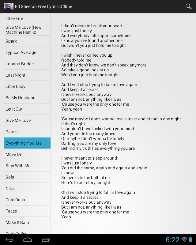 Ed Sheeran Lyrics Free Offline (Package Name: li.es) is developed by Lirika and the latest version of Ed Sheeran Lyrics Free Offline 1.2 was updated on June 26, 2017. Ed Sheeran Lyrics Free Offline is in the category of Entertainment. You can check all apps from the developer of Ed Sheeran Lyrics Free Offline. Currently this app is for free. This app can be downloaded on Android 4.0+ on APKFab or Google Play. All APK/XAPK files on APKFab.com are original and 100% safe with fast download.