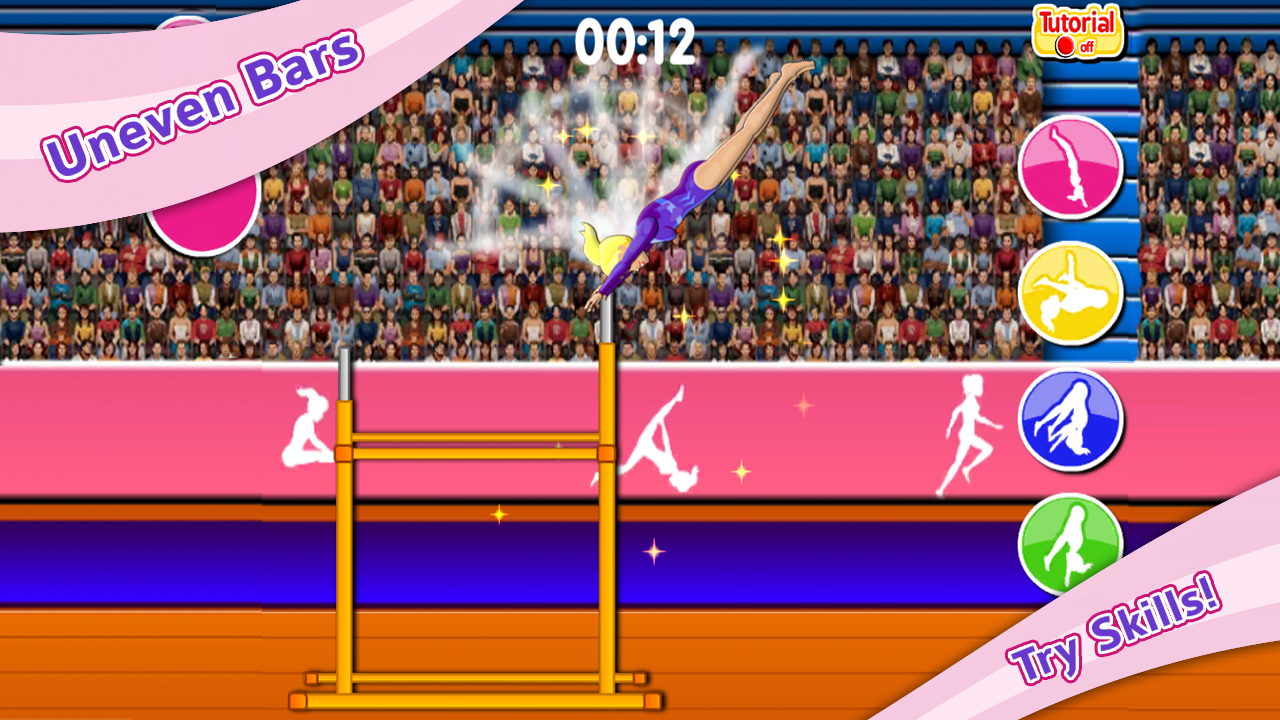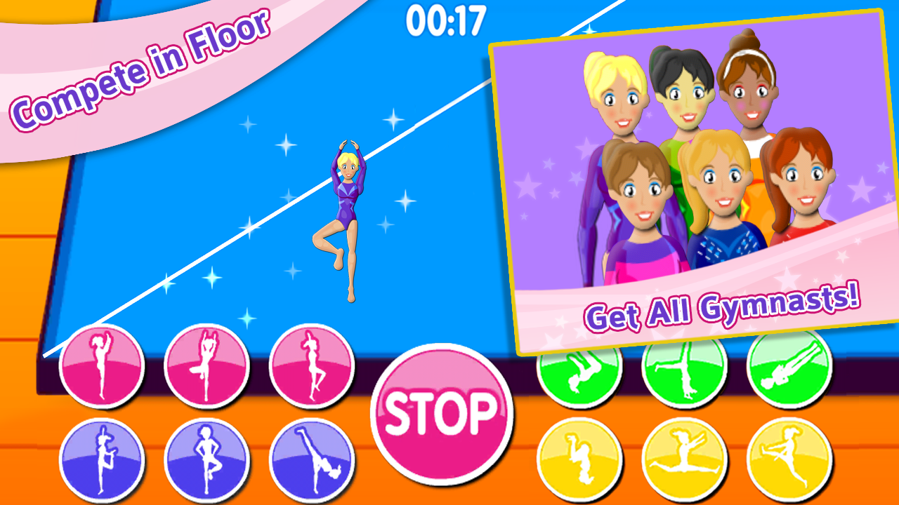 Compete on the uneven bars, rhythmic dance, balance beam, trampoline, vault, and even a floor routine! Learn tricks, moves & jumps. Practice & get high score! Earn medals.