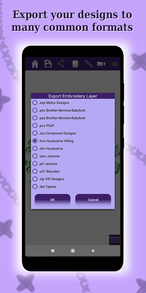 One of the key functionalities of the app is the converting and saving/sharing of emroidery files in many popular and common formats.