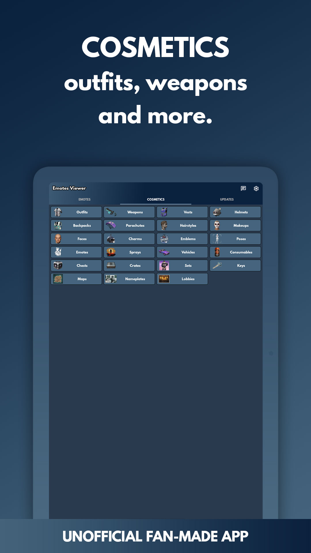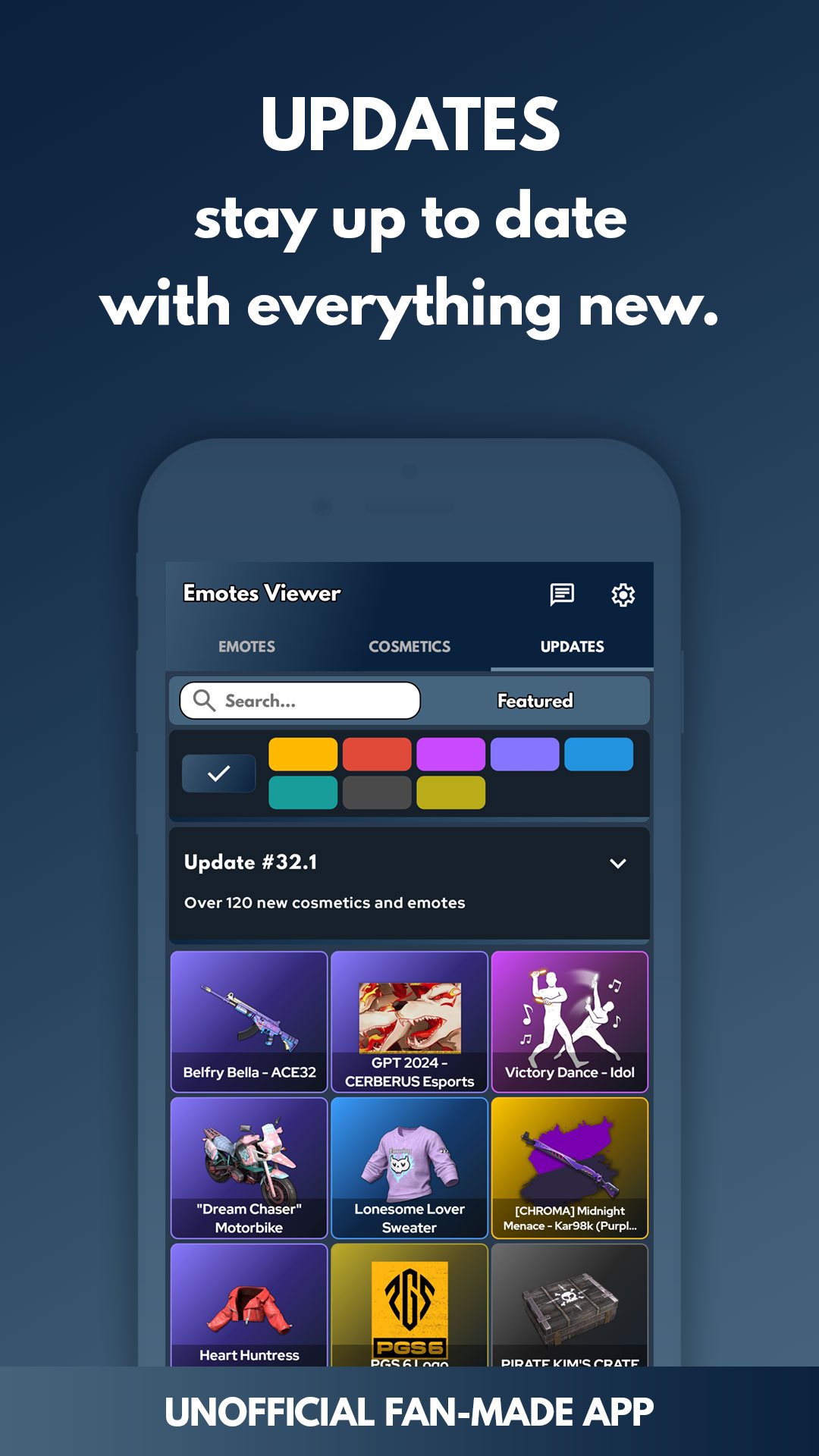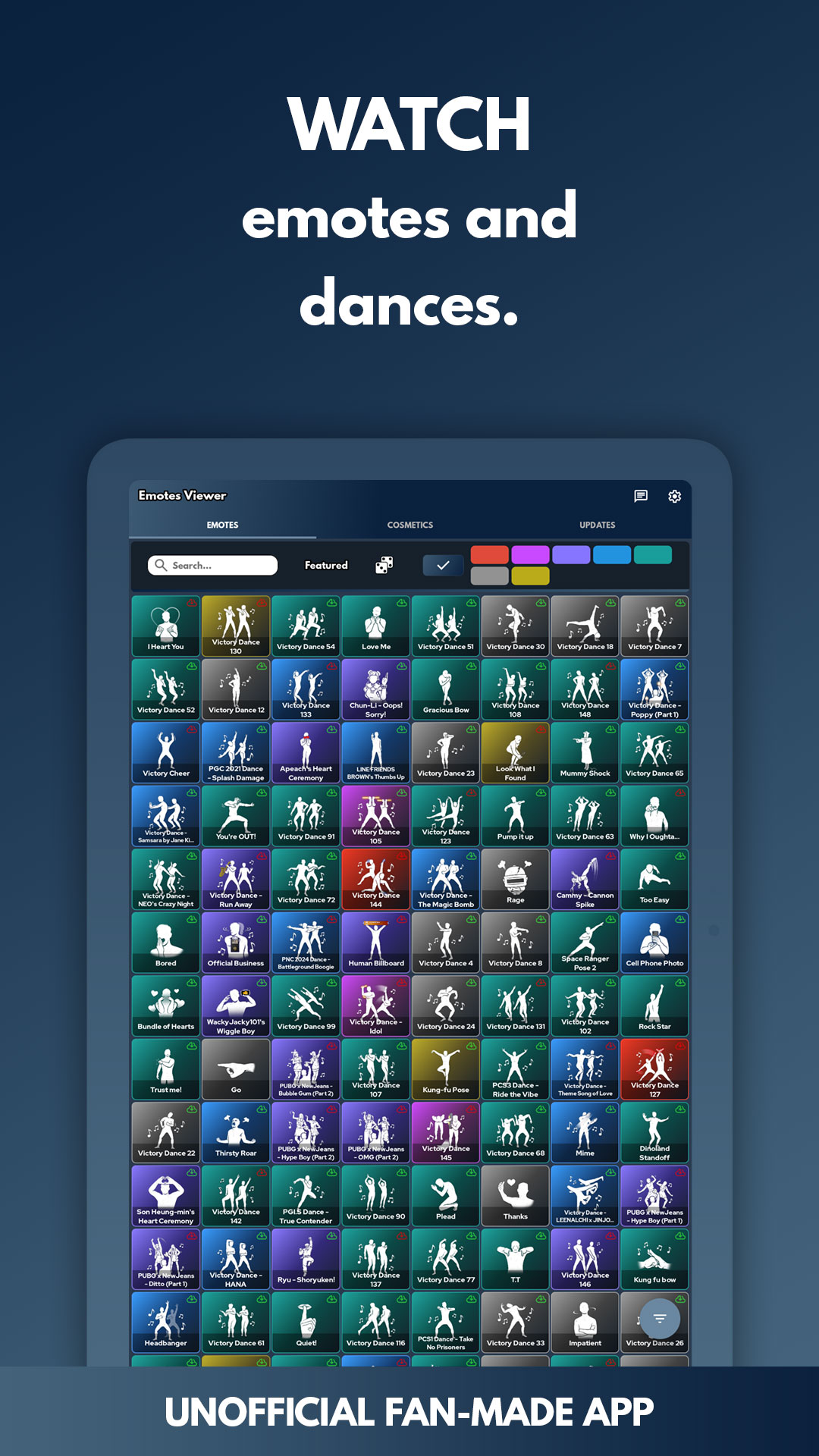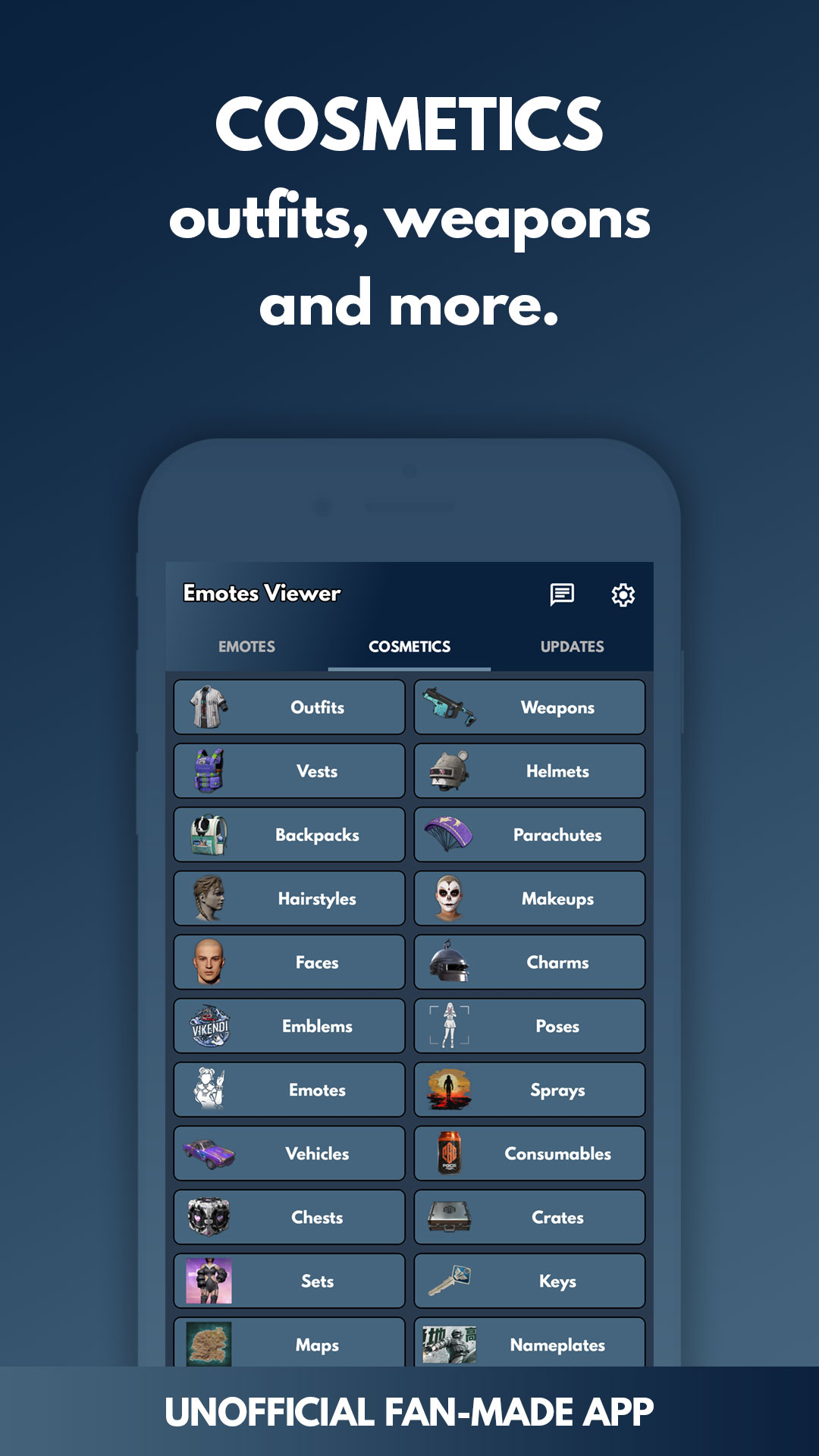 Unlock your ultimate PUBG style! 💎 Tired of guessing what a new emote or mythic outfit truly looks like in PUBG Mobile or BGMI? Imagine previewing every legendary skin and dance BEFORE spending your precious G-Coin or UC. Stop wasting your currency on surprises! Welcome to the essential PUBG companion app, your definitive toolkit and database for PUBG Mobile and Battlegrounds Mobile India. Master every cosmetic, from elusive emotes to game-changing weapon skins, and refine your unique style to secure that coveted Winner Winner Chicken Dinner! 🏆 💃 Master Every PUBG Emote & Dance Dive into the most comprehensive PUBG emote viewer and dance viewer ever created! Our constantly updated library features every single one of the latest PUBG Royale Pass emotes, rare event dances, and classic gestures from PUBG Mobile and BGMI. Experience our advanced 3D viewer to slow down moves, analyze every detail, and perfect your victory celebration. Explore the entire PUBG emote collection for free! 👕 Preview ALL PUBG Skins & Cosmetics Your ultimate PUBG skin viewer is here! Go beyond emotes and explore every aspect of PUBG character customization with unparalleled detail. * 🔫 Legendary PUBG Weapon Skins: Inspect every curve and glow of your favorite gun skins, from the newest releases to the rarest finds from the Mythic Forge and beyond. See how they truly look before you buy! * 🎒 Epic PUBG Outfits & Armor: Browse thousands of stunning outfits, tactical helmets, and stylish backpacks for PUBG Mobile and BGMI. * 🚗 Dazzling PUBG Vehicles & Gear: Check out every vehicle skin, parachute design, and other unique items. Our item viewer lets you visualize everything in your potential PUBG collection. 🧠 Your Ultimate PUBG Knowledge Hub This app transcends a mere PUBG cosmetics gallery; it's your strategic command center for all PUBG battlegrounds intelligence! * 📈 PUBG Update Tracker: Be the first to know what's new in PUBG Mobile! Get a direct feed of all current and past game updates, ensuring you're always ahead of the curve without even launching the game. * 📚 Complete PUBG Database: Quickly find and preview any PUBG cosmetic item from any season, making it the most comprehensive PUBG item database at your fingertips. * ✨ Always Current: We tirelessly track the latest PUBG updates, crates, events, and seasons to ensure your information is always fresh and accurate. Stop wasting time with unreliable online sources! Your definitive PUBG Mobile emotes list, BGMI skin database, and PUBG update tracker are all right here, packed into one powerful app. Whether you're a fresh recruit or a seasoned PUBG veteran, this is the essential companion you can't play without. 🚀 Download Emotes Viewer for PUBG (BGMI) now and claim your ultimate advantage on the battlegrounds! --- Disclaimer: This is an unofficial, fan-made application and is not affiliated with, endorsed, sponsored, or specifically approved by PUBG Studios or KRAFTON. This app adheres to the Player-Created Content Policy. Portions of the materials used are trademarks and/or copyrighted works of PUBG Studios. All rights reserved by PUBG™. For more information, please see the PUBG Player-Created Content Policy.