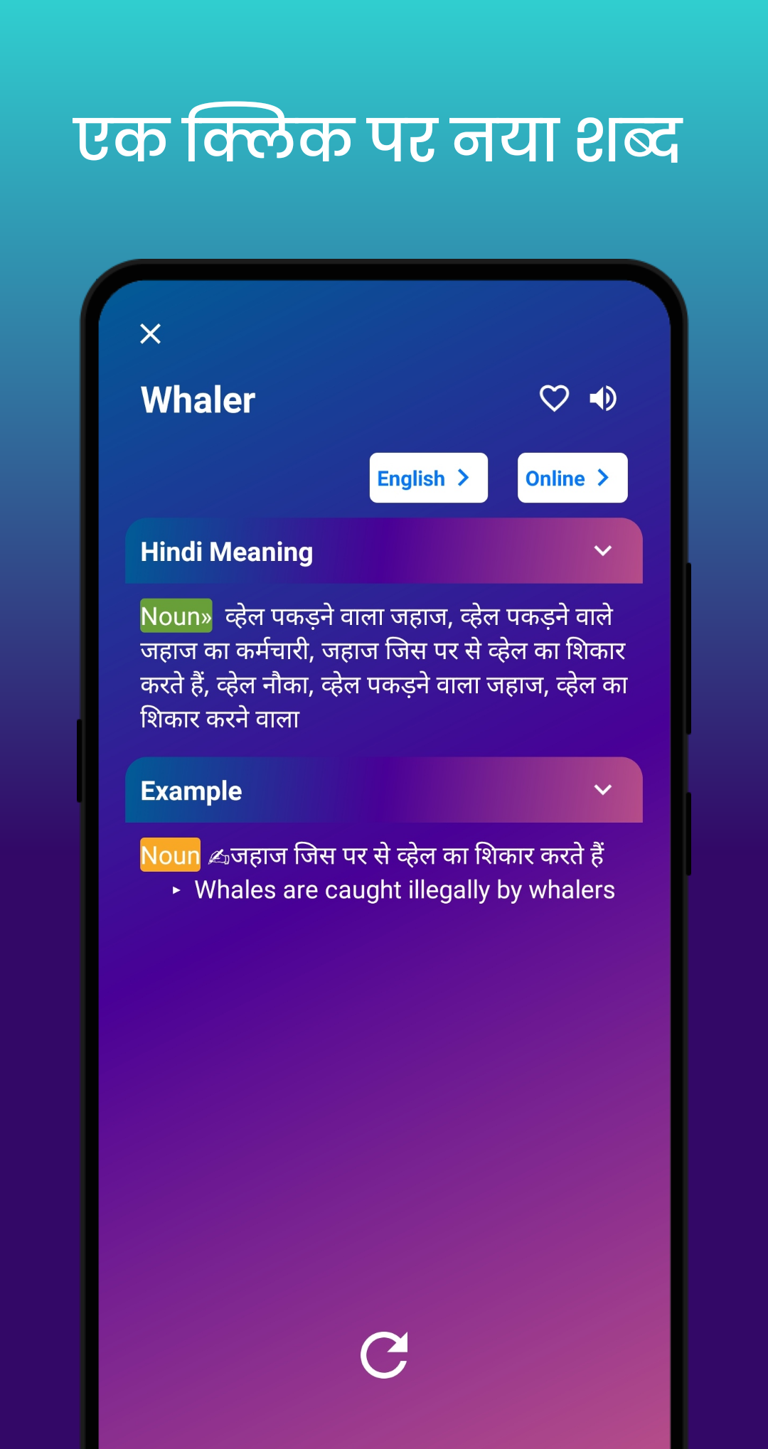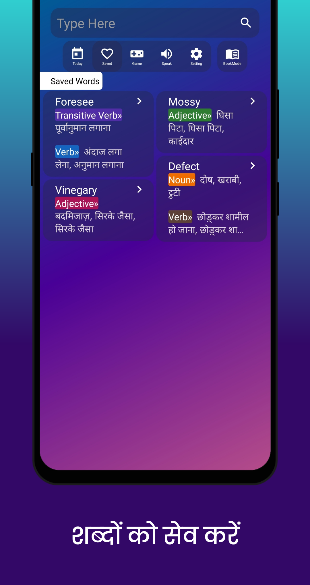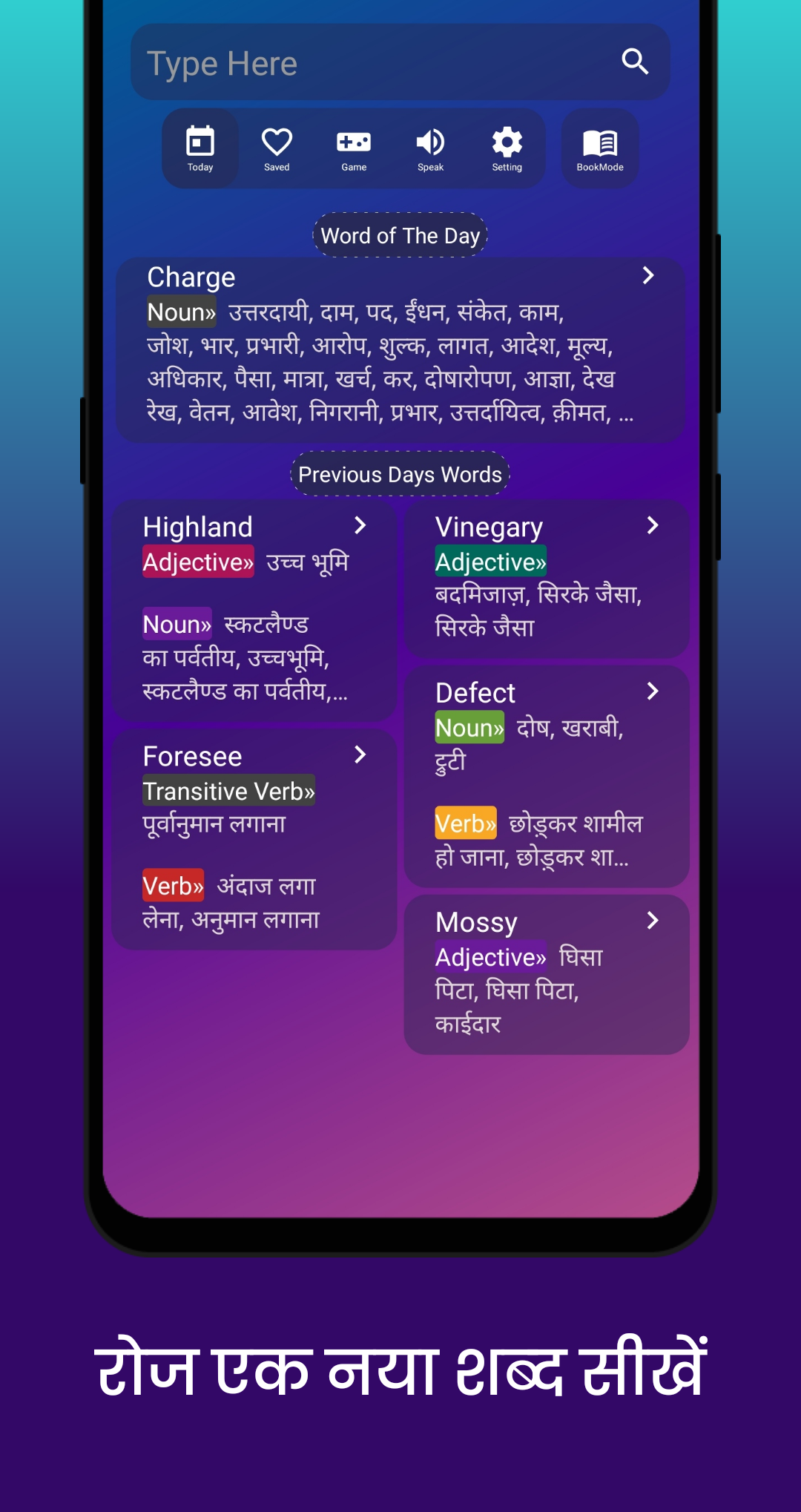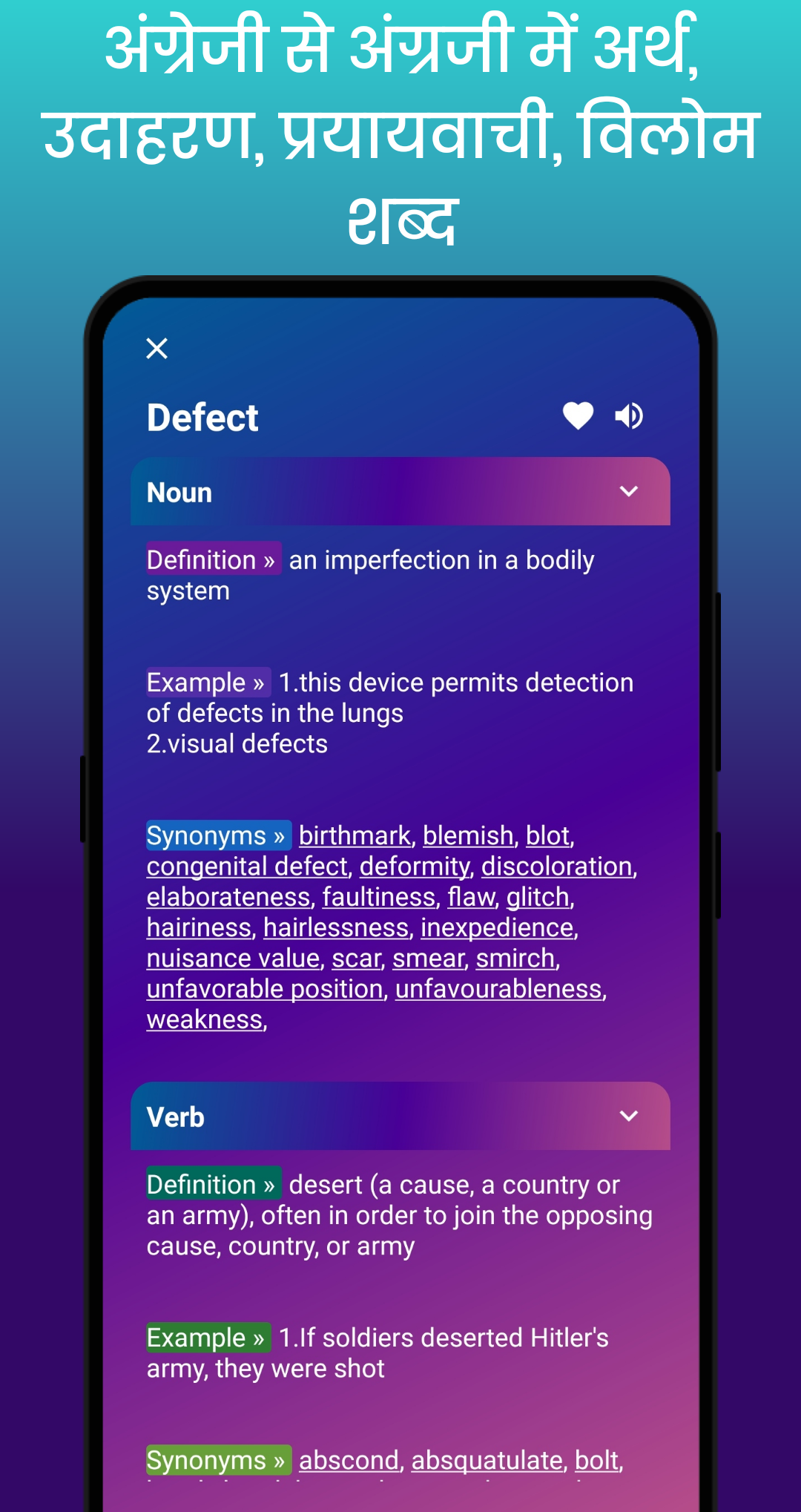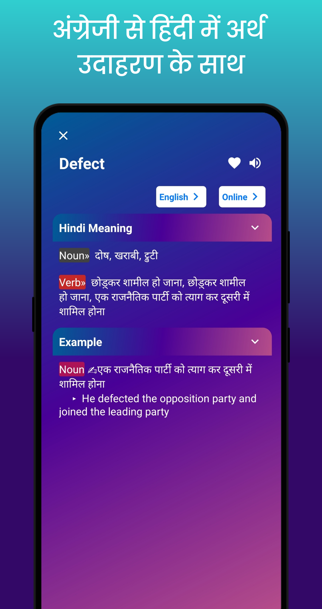 This English Hindi Dictionary app is very simple to use. This app provides you whole details of English words in Hindi and English with suitable examples, antonyms, synonyms and similar words. In this English Hindi Dictionary app, you can find words with an auto-complete suggestion list, in the suggestion list, every word has results. This Dictionary app provides you the facility to save your word in favorite. In This Dictionary you can learn a new word every day and every word of the day's words is saved in previous days' words history by this you can see the word again.