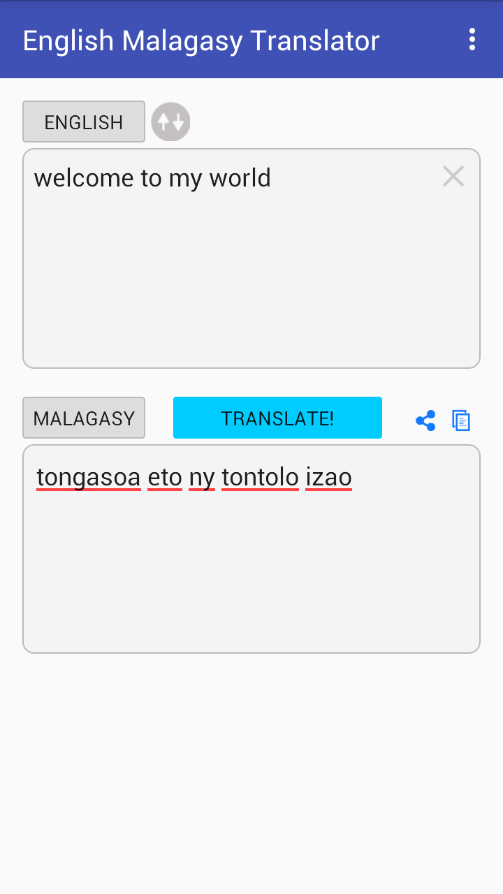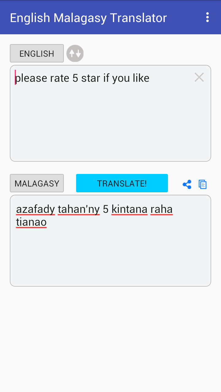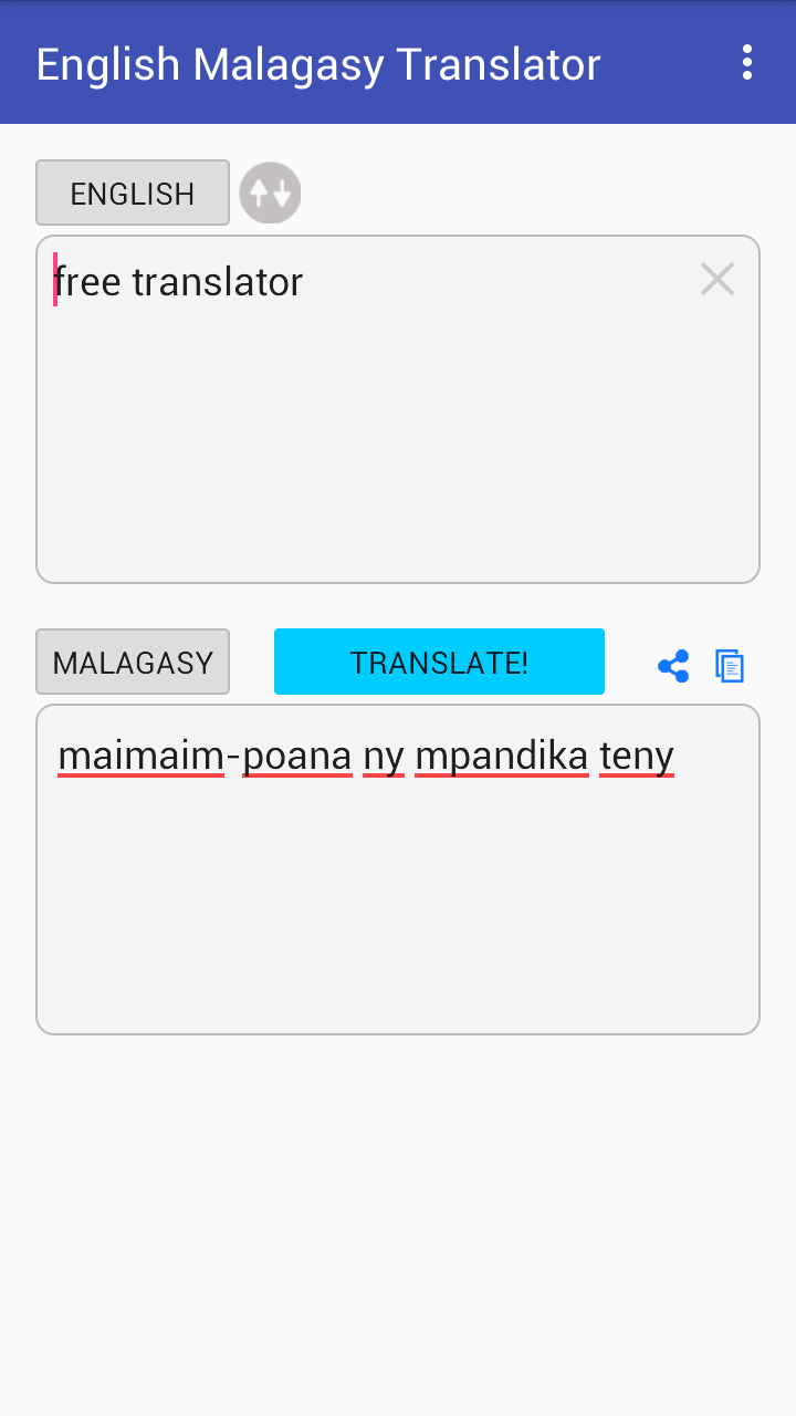 This app is free and online. English Malagasy Translator app is designed to simplify translation from English to Malagasy, and vice versa