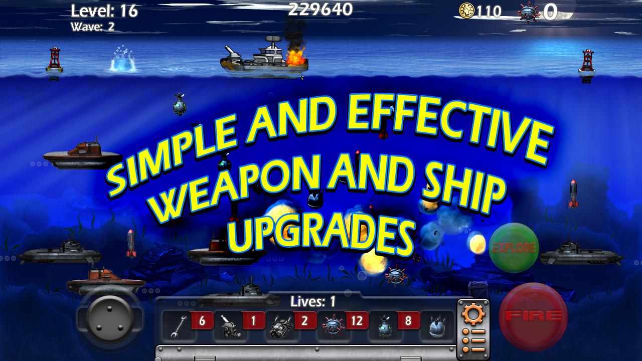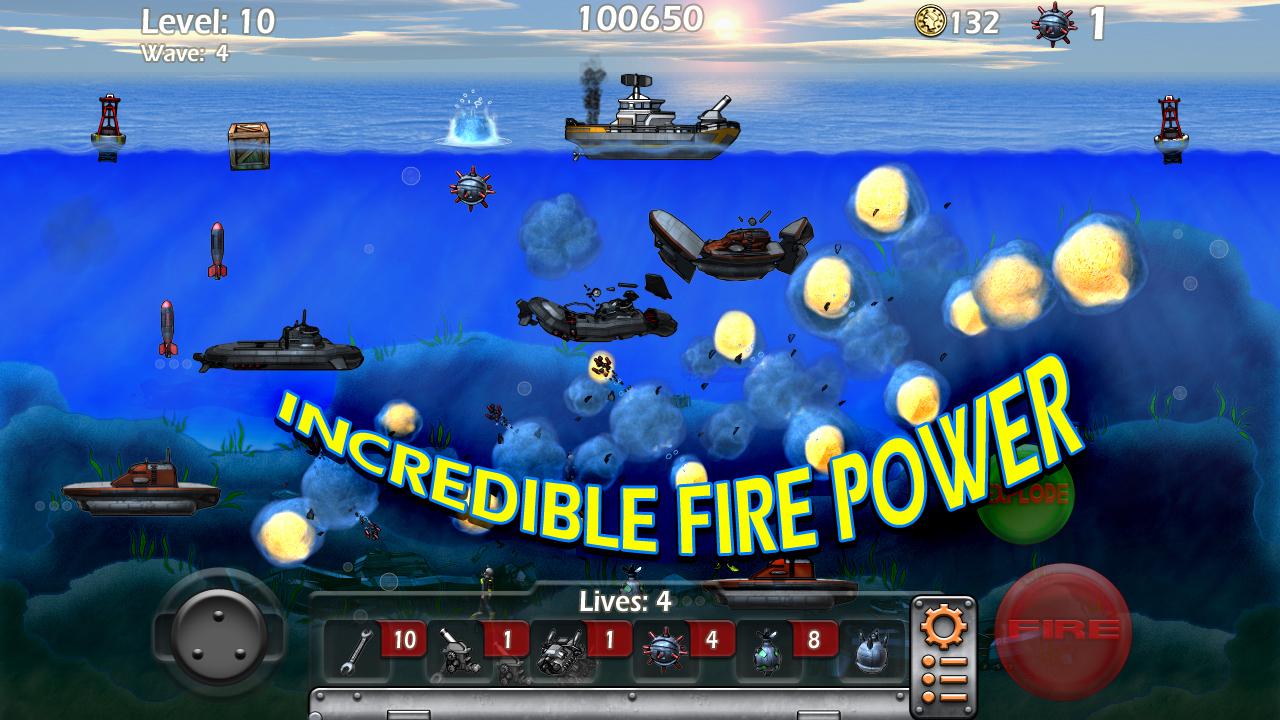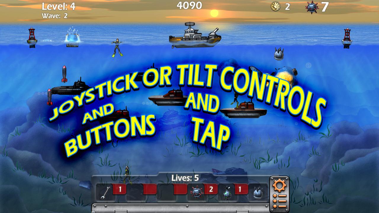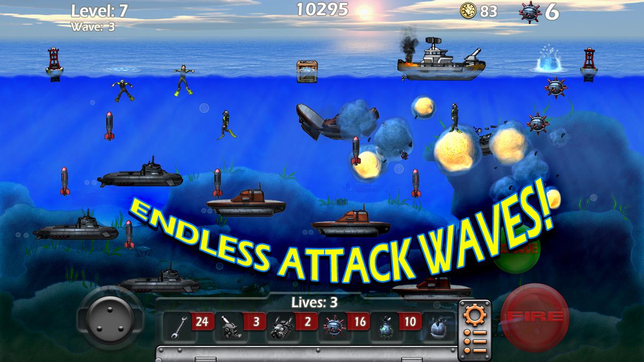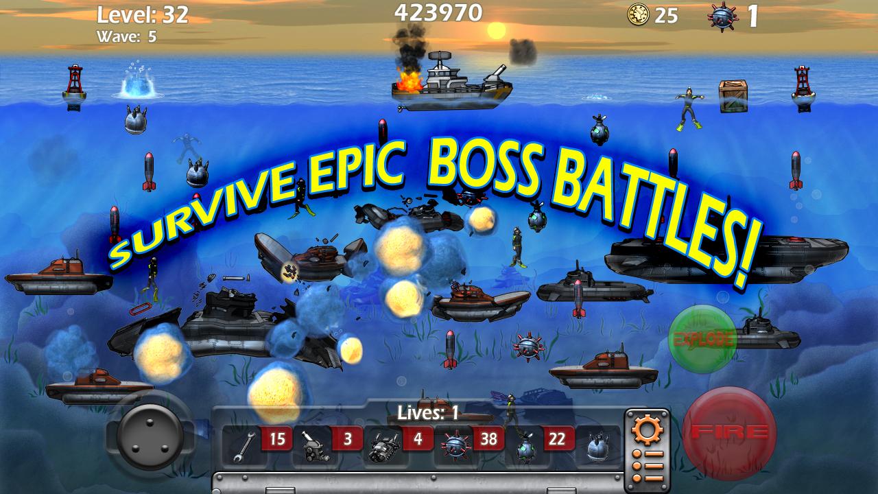 Epic Sea Battle is a balanced game, and completely free to play. Enjoy! ★ New and Incredibly fun way to play! ★ Tilt and Virtual Joystick Controls ★ Rescue Frogmen for $ ★ Continuous Level Save System ★ Endless gameplay for all Ages and Skill levels Warning! The sea is controlled by Submarine Pirates, under water is deadly, up top, the surf is treacherous. Don't plan to play in these waters, sea life wont even survive here. Massive attack waves of small subs are deployed by the Mega Sub Command Ships leaving an Under Water path of destruction throughout the globe. You pilot and control a Battle Sea Craft with the most advanced weapons and weaponry ever created to defend against such ruthlessness under the still ocean water. Command this Sea Craft loaded with Anti Sub Mines and Bombs to reclaim the waters. At your disposal is the best supply of Bombs to destroy the enemy Sub Pirate invasion, you are in a Race for survival. Free the world of under sea terror, Rescue your Scuba Divers, Earn rewards, Keep your engine Running and choose the best Mine supply for your style of play. Game-play is endless, frantic and intense. You're in a race to reduce the terror that dominates the Seven Seas. Epic Sea Battle is a throwback arcade action game of the 1980's and 90's, but this time, prepare for incredible graphics, countless waves of intense and epic battles, levels upon levels of Sub Marine Command Ships in this game as you will be properly challenged. This game is balanced for even the most inexperienced player, or the most dedicated gamers on the planet. Repair your Craft when damaged and upgrade your arsenal with Special functions and Fire Power destroy the enemy. Climb or Rule the leader board and cherish your achievements. Remember Captain; The best defense against an enemy submarine, is to deploy an advanced Mine onto one solely for the joy of seeing it descend onto the seabed below. Your Craft is worthy, are you?