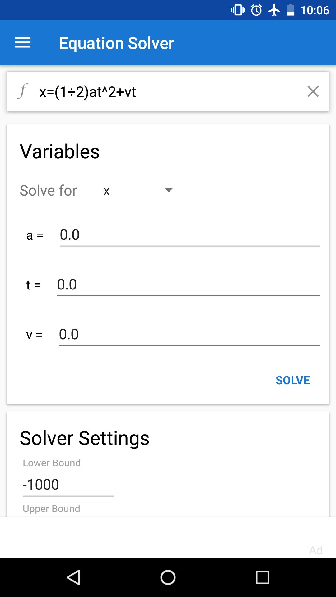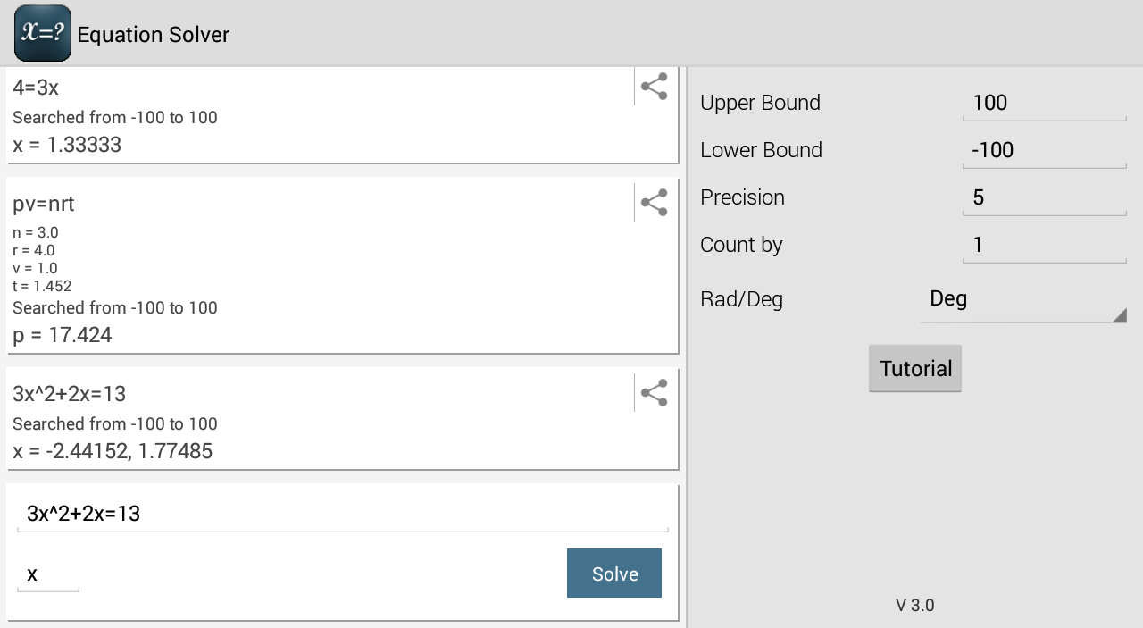 Instead of depending on hard coded formulas, Equation Solver finds the answer through a brute force method. This allows the app to solve for all sorts of problems in a relatively short amount of time!