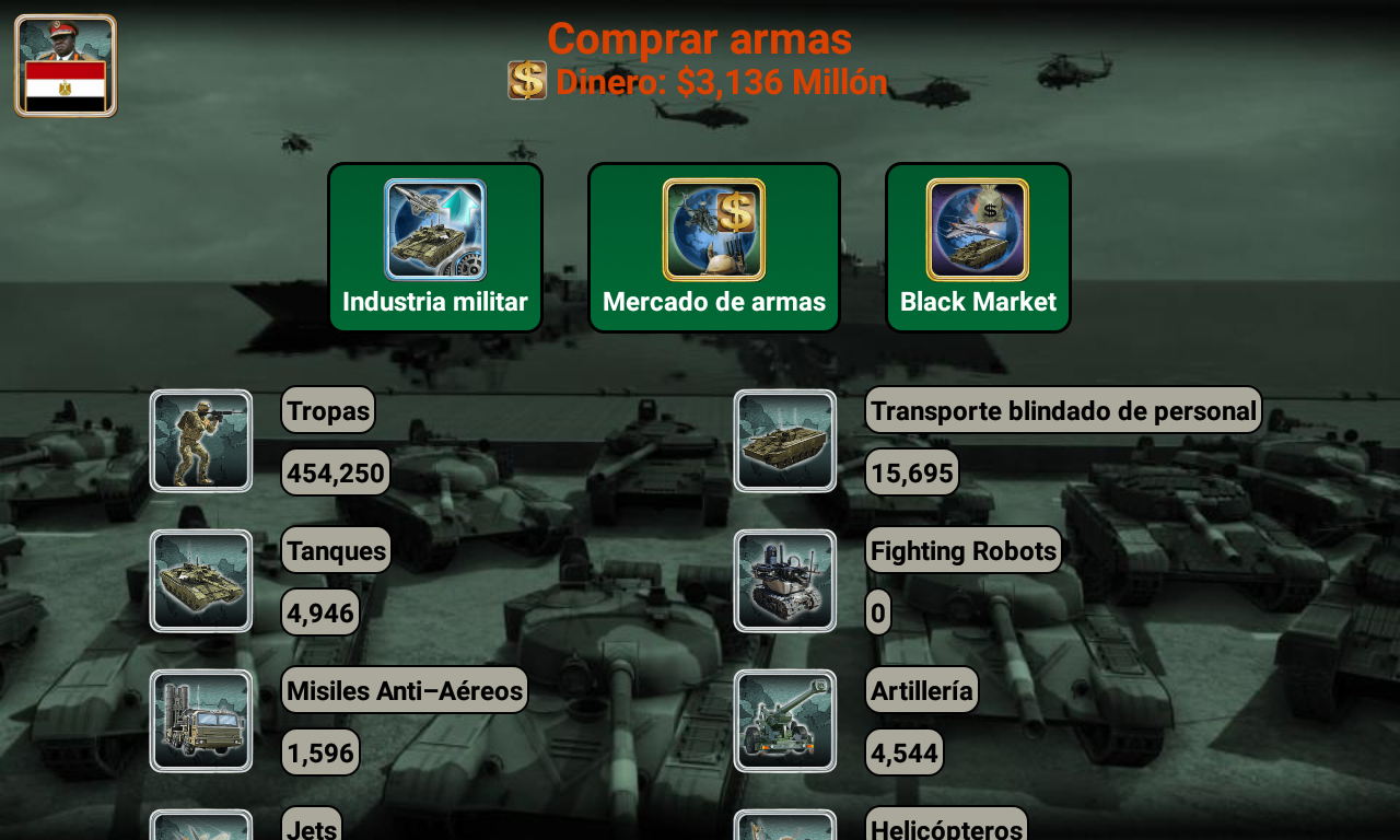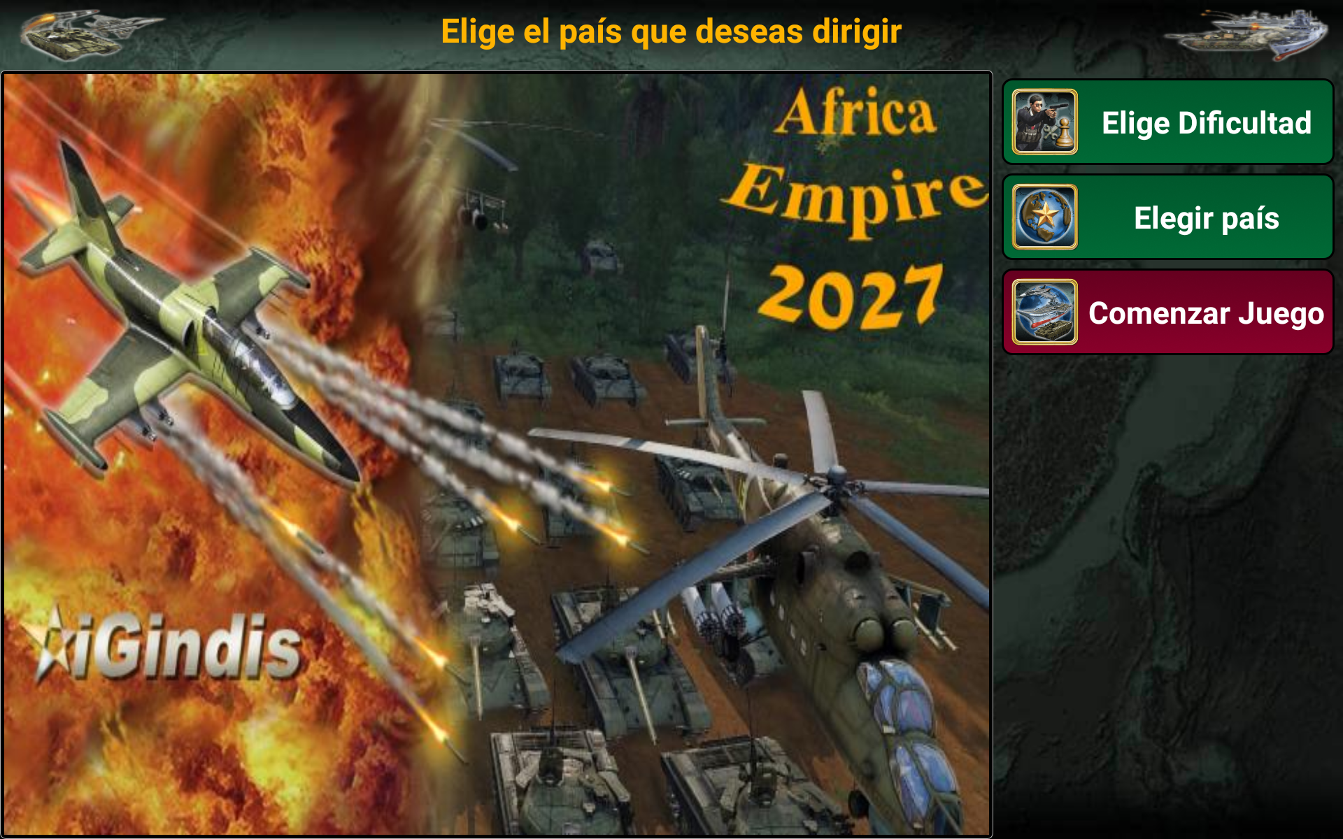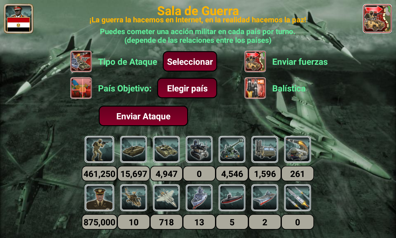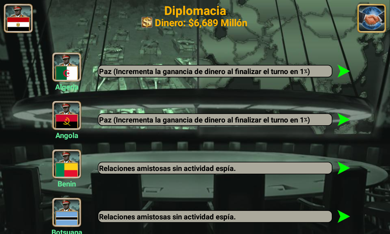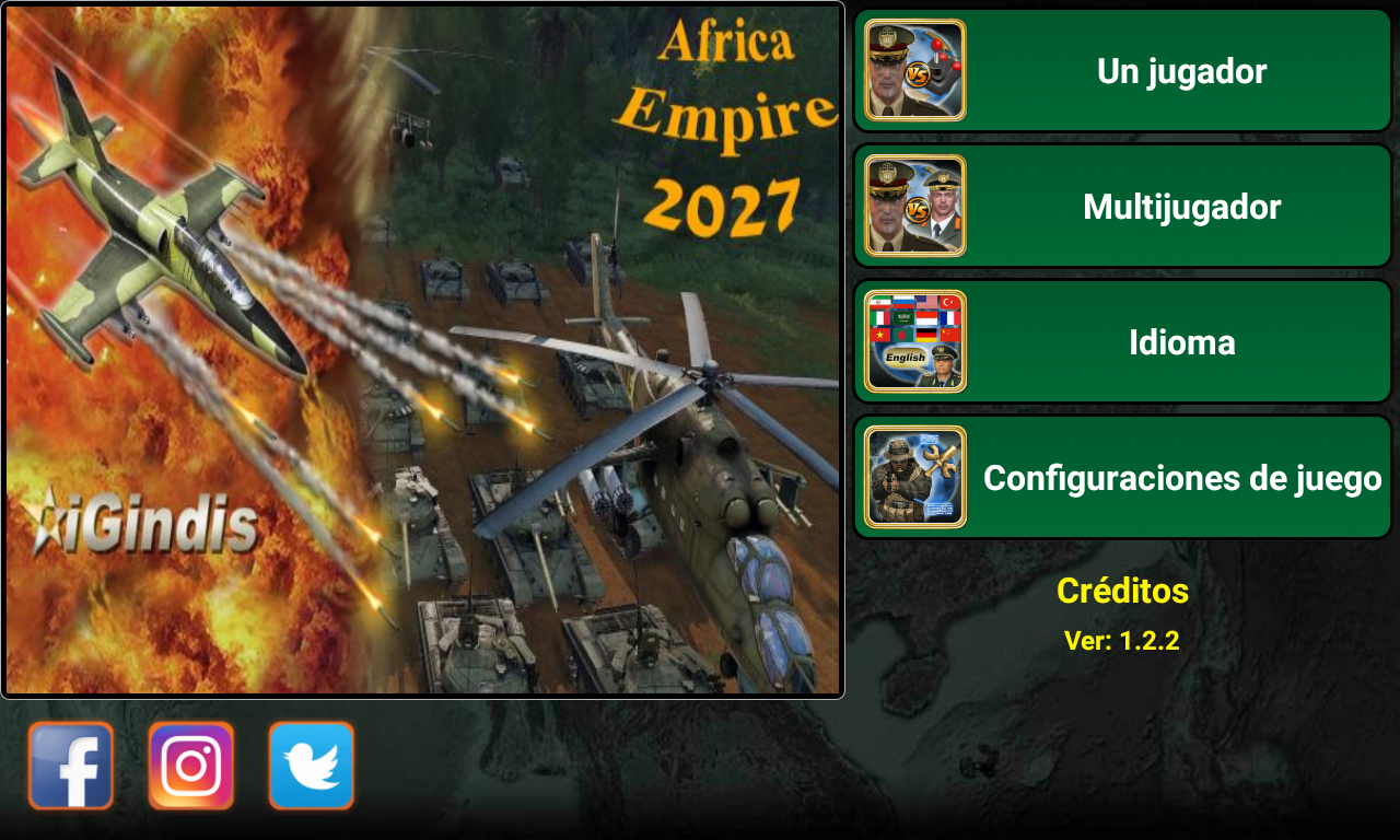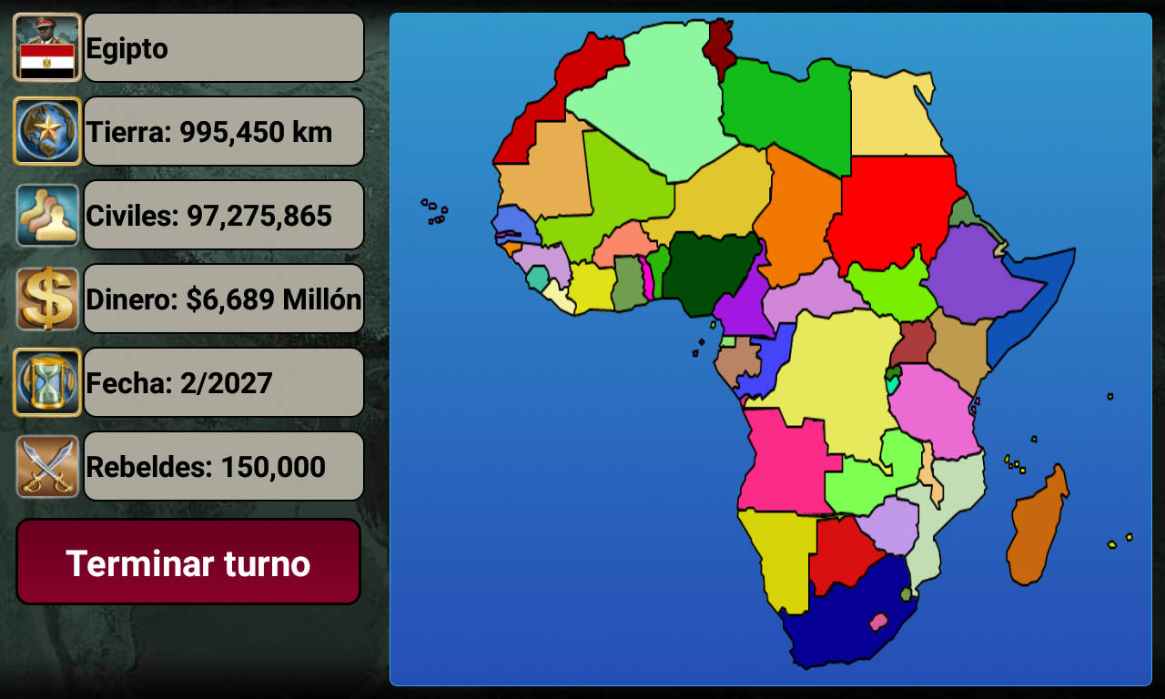 ¡Conviértete en el mejor líder de tu imperio africano! Selecciona el país que quieres liderar (¡54 países disponibles!) y compite contra la IA enemiga. Con excelentes habilidades de liderazgo, estrategia y táctica, puedes liderar tu país hacia la victoria. ¿Tienes lo que se necesita? Es el año 2027 y una gran rebelión derrocó al gobierno existente. Como líder de los rebeldes, ¡has sido elegido para ser la cabeza de tu país! Basado en datos reales, el juego está designado para pensar en miles de escenarios distintos. Usa la diplomacia o declara la guerra. ¡Todo depende de ti! Características Diplomacia y Naciones Unidas Proveedores de armas (Estados Unidos, Francia, Reino Unido, Rusia y China) Centro de espionaje Sala de guerra Noticias del mundo (Economía, relaciones, espionaje y guerra) Inteligencia artificial Armas disponibles: Mercenarios, transporte blindado de personal (APC), tanques, artillería, misiles antiaéreos, helicópteros, aviones de combate, barcos, submarinos, robots de combate, vehículos aéreos no tripulados (UAV), portaaviones y misiles balísticos. multijugador El juego también admite opciones multijugador en línea y multijugador local que te permiten jugar hasta 8 jugadores. (Crea o únete a mundos existentes) Cada jugador juega en su turno, gestiona su país y puede enviar mensajes privados a otros jugadores del juego. Mejora tus habilidades de liderazgo y haz nuevos amigos de todo el mundo. (El juego admite más de 35 idiomas) ¿Está listo para liderar, comandante supremo? Selecciona tu país y empieza a jugar. El sistema está diseñado para pensar en miles de escenarios posibles y elegir la mejor forma de ganar. Necesitas mostrar y mejorar tus habilidades de liderazgo y convertir a tu país en un imperio. Buena suerte comandante en su misión. Equipo iGindis * Los usuarios de voz en off pueden tocar tres veces con tres dedos al iniciar el juego para habilitar el modo de accesibilidad. El juego se puede jugar con deslizamientos y dobles toques después. (Asegúrate de cerrar Talk Back o cualquier programa de voz en off antes de abrir el juego)