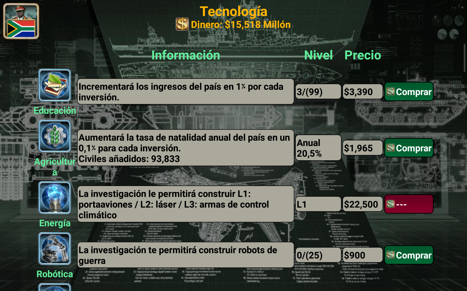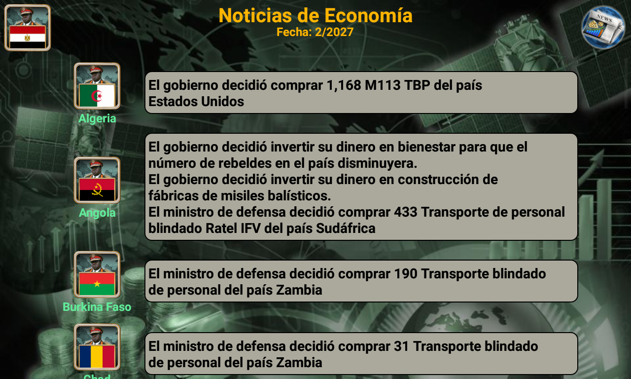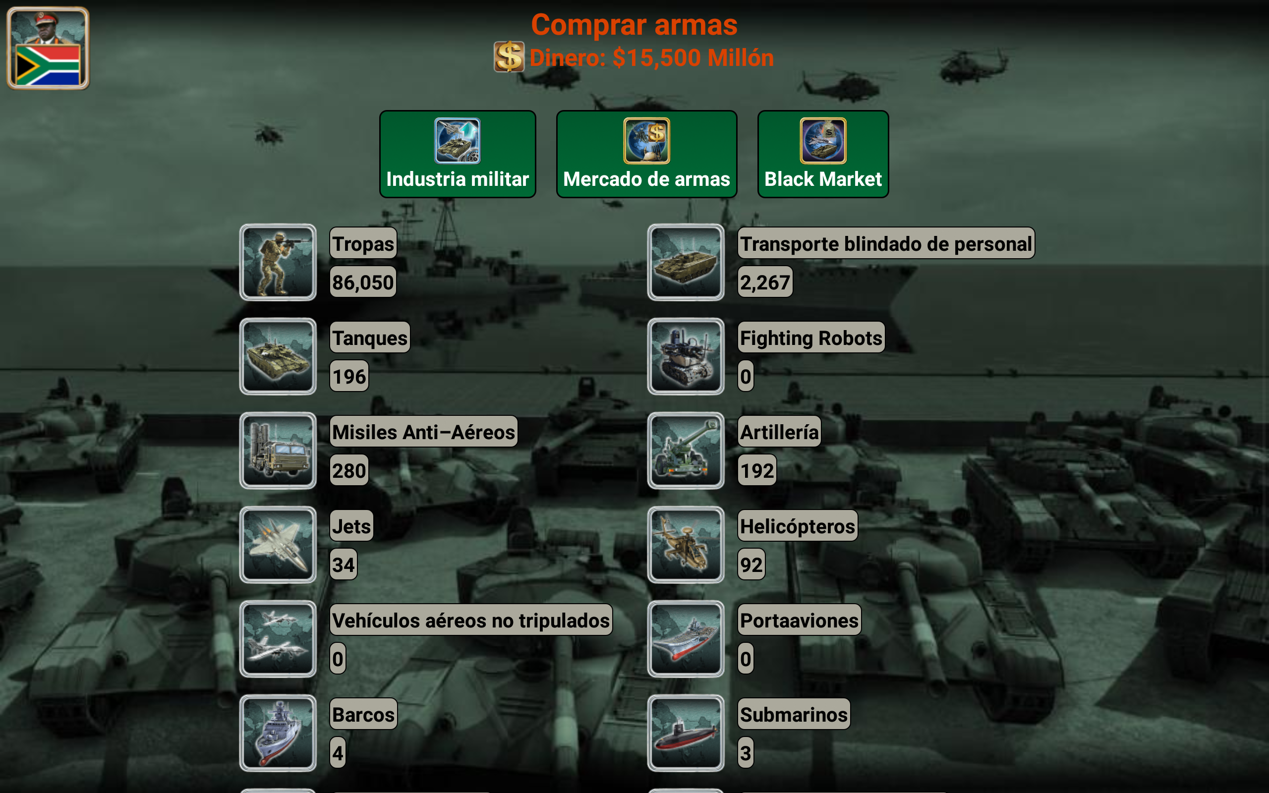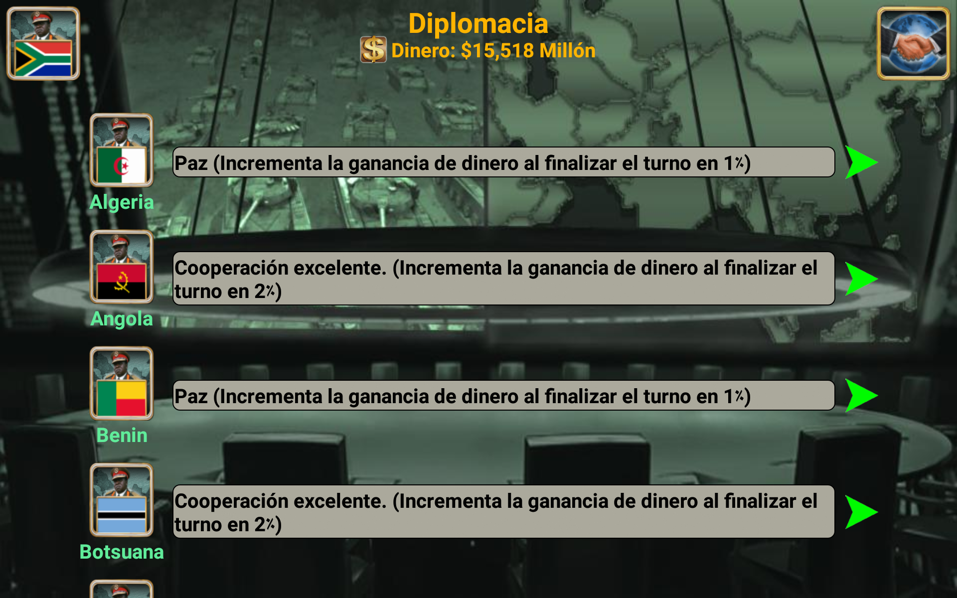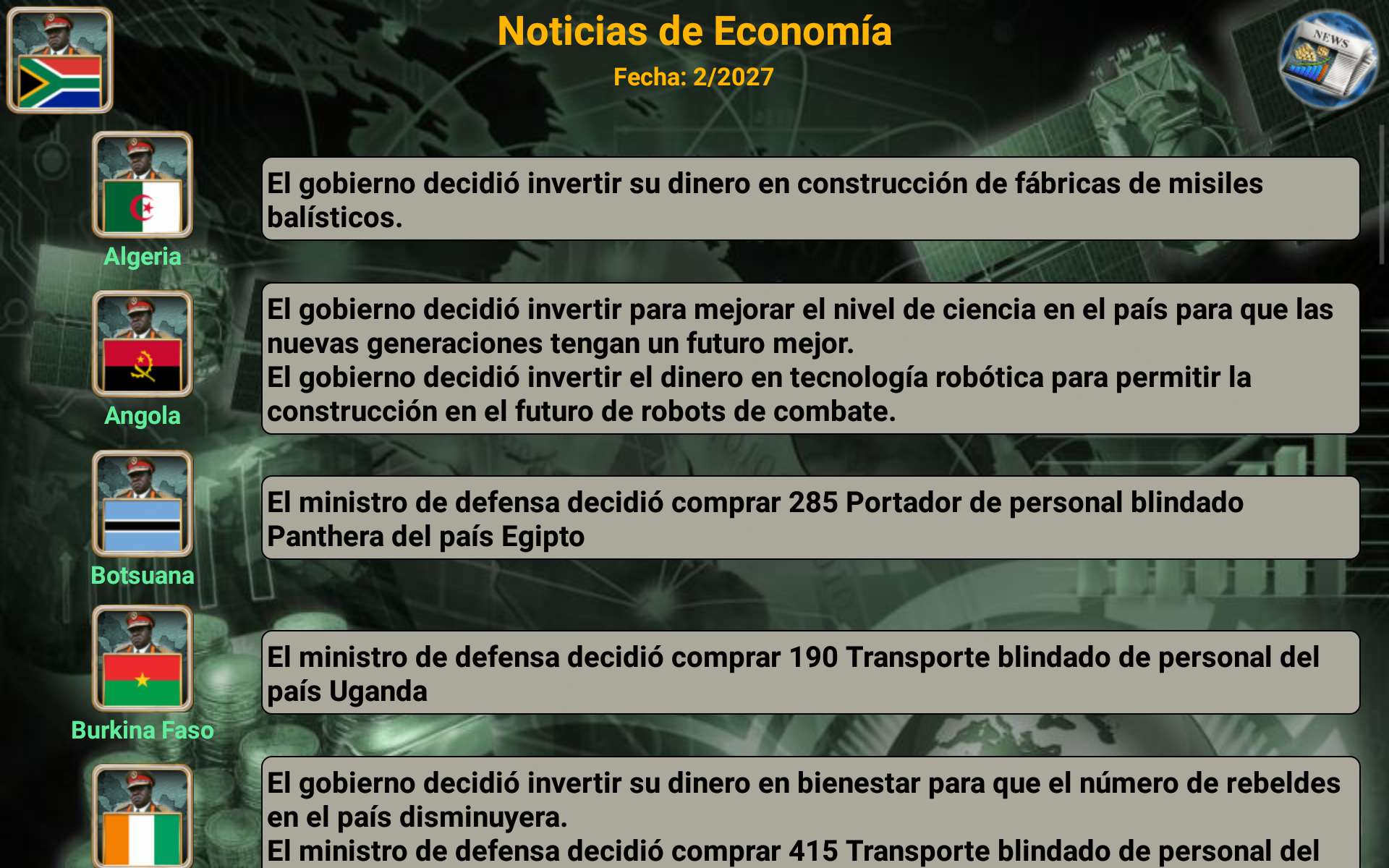 ¡Conviértete en el mejor líder de tu imperio africano! Selecciona el país que quieres liderar (¡54 países disponibles!) y compite contra la IA enemiga. Con excelentes habilidades de liderazgo, estrategia y táctica, puedes liderar tu país hacia la victoria. ¿Tienes lo que se necesita? Es el año 2027 y una gran rebelión derrocó al gobierno existente. Como líder de los rebeldes, ¡has sido elegido para ser la cabeza de tu país! Basado en datos reales, el juego está designado para pensar en miles de escenarios distintos. Usa la diplomacia o declara la guerra. ¡Todo depende de ti! Características Diplomacia y Naciones Unidas Proveedores de armas (Estados Unidos, Francia, Reino Unido, Rusia y China) Centro de espionaje Sala de guerra Noticias del mundo (Economía, relaciones, espionaje y guerra) Inteligencia artificial Armas disponibles: Mercenarios, transporte blindado de personal (APC), tanques, artillería, misiles antiaéreos, helicópteros, aviones de combate, barcos, submarinos, robots de combate, vehículos aéreos no tripulados (UAV), portaaviones y misiles balísticos. multijugador El juego también admite opciones multijugador en línea y multijugador local que te permiten jugar hasta 8 jugadores. (Crea o únete a mundos existentes) Cada jugador juega en su turno, gestiona su país y puede enviar mensajes privados a otros jugadores del juego. Mejora tus habilidades de liderazgo y haz nuevos amigos de todo el mundo. (El juego admite más de 35 idiomas) ¿Está listo para liderar, comandante supremo? Selecciona tu país y empieza a jugar. El sistema está diseñado para pensar en miles de escenarios posibles y elegir la mejor forma de ganar. Necesitas mostrar y mejorar tus habilidades de liderazgo y convertir a tu país en un imperio. Buena suerte comandante en su misión. Equipo iGindis * Los usuarios de voz en off pueden tocar tres veces con tres dedos al iniciar el juego para habilitar el modo de accesibilidad. El juego se puede jugar con deslizamientos y dobles toques después. (Asegúrate de cerrar Talk Back o cualquier programa de voz en off antes de abrir el juego)