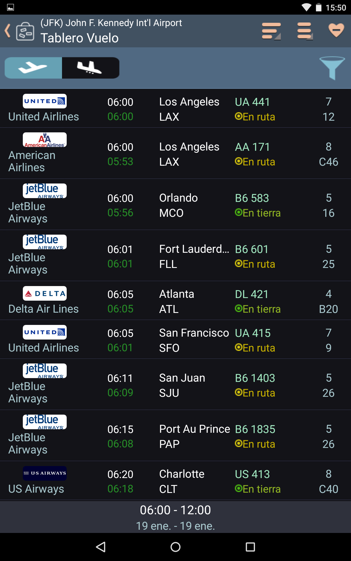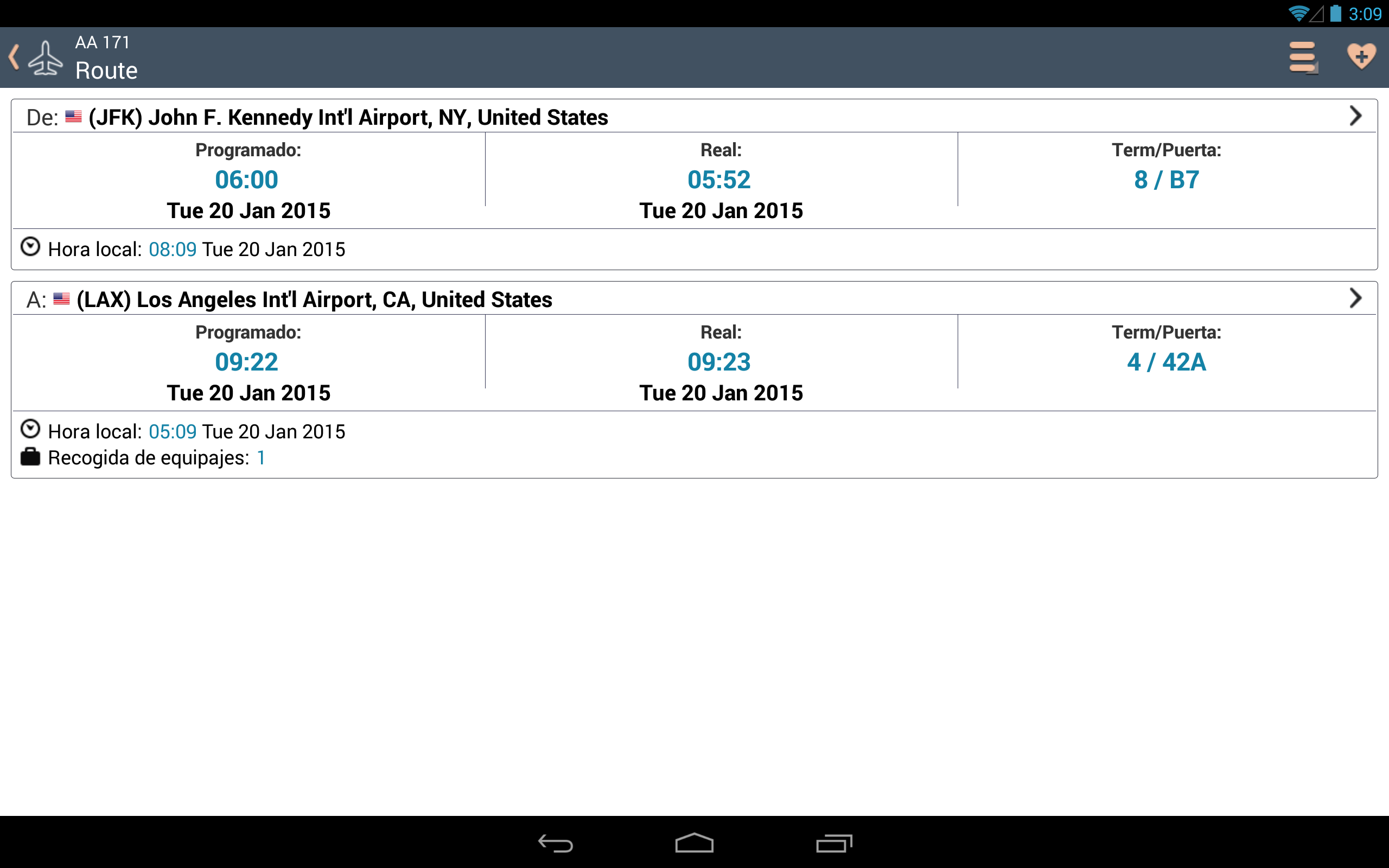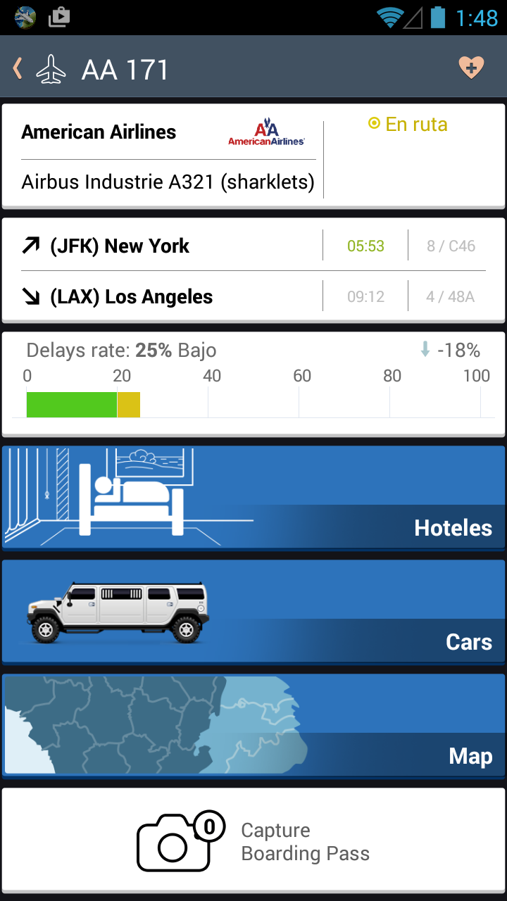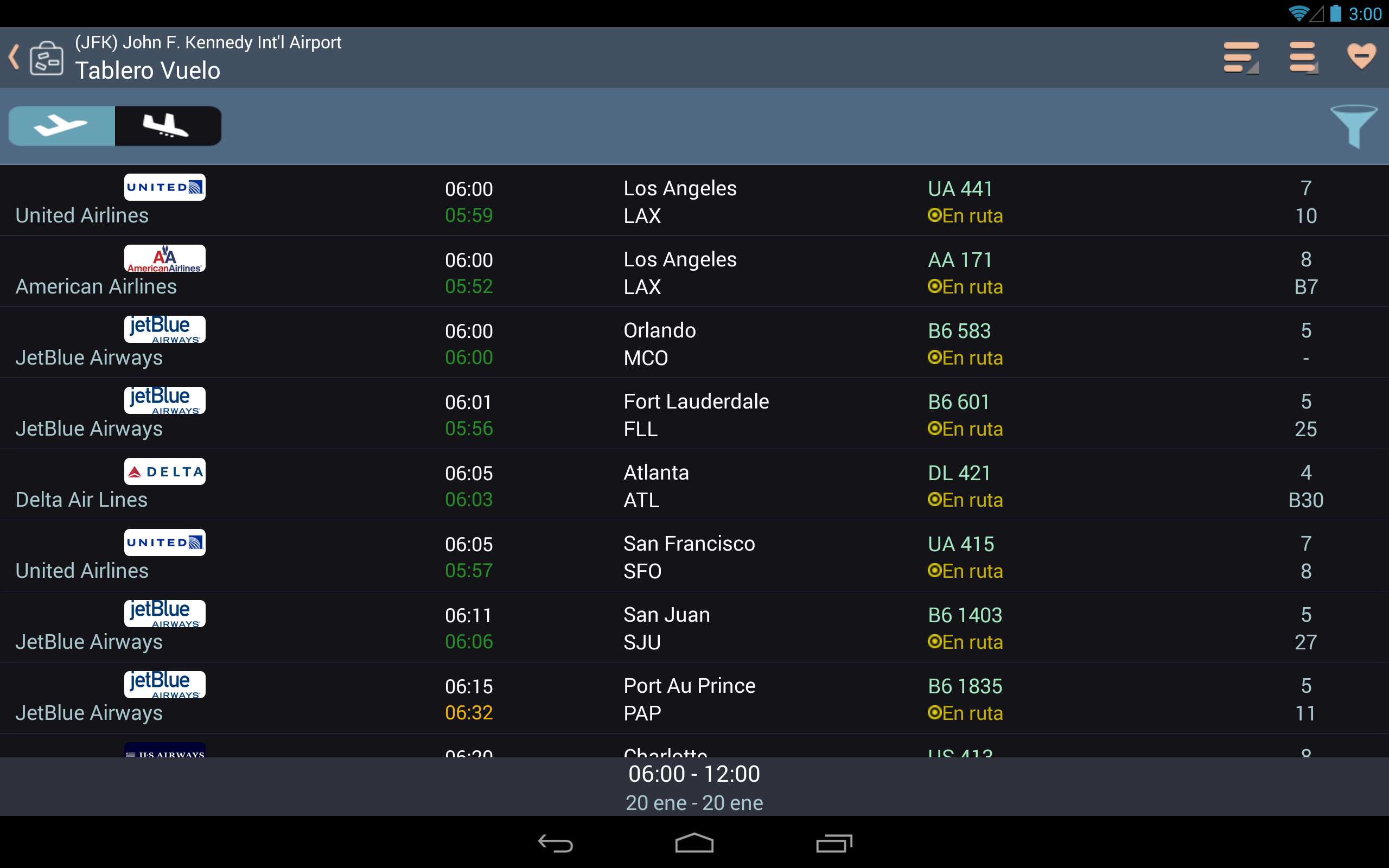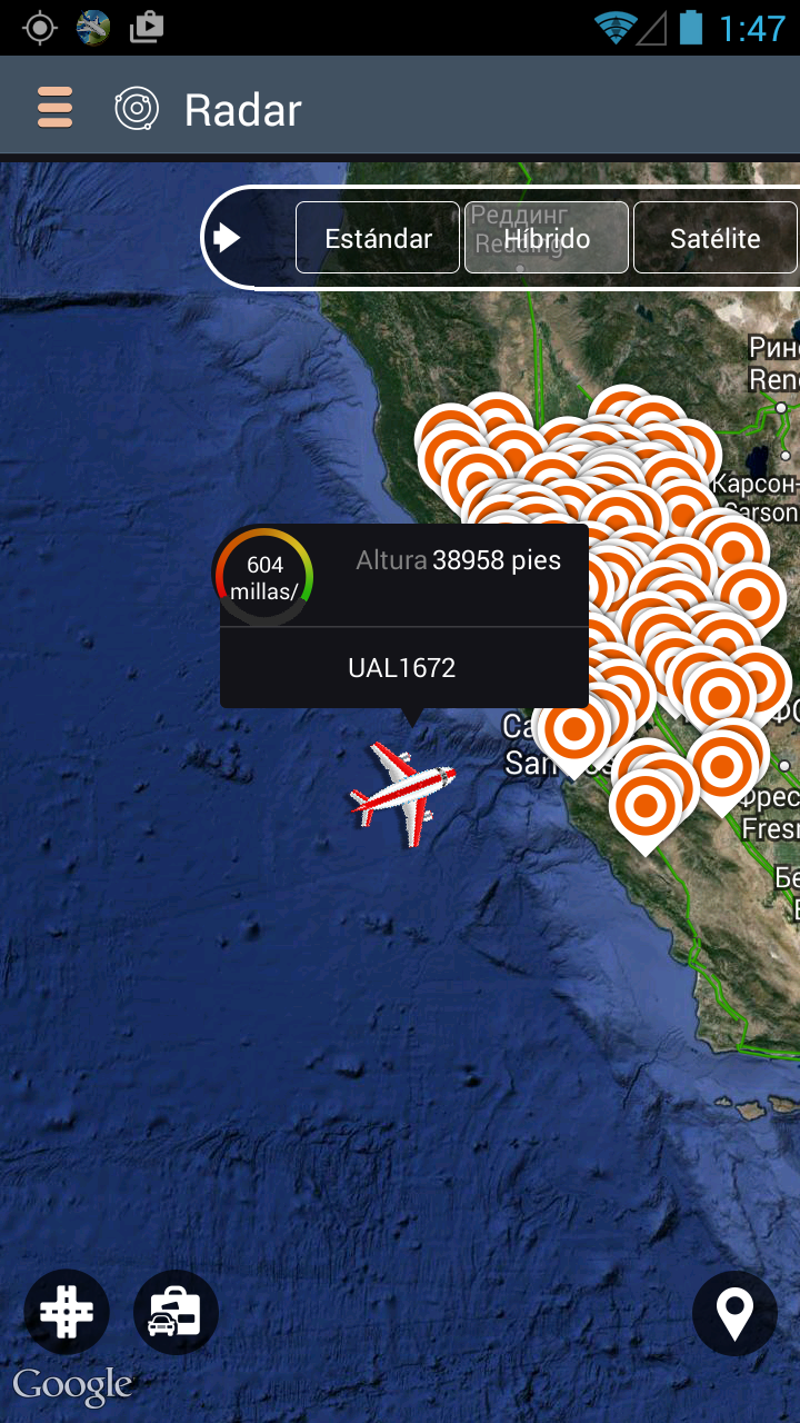 ✈ ESTADO DEL VUELO - La posición actual de la aeronave en el mapa con la velocidad real para la mayoría de los vuelos. ✈ LA COBERTURA MÁS GRANDE PARA LOS VUELOS, AEROPUERTOS y COMPAÑÍAS AÉREAS - Hay unas 1500 aerolíneas. La gran mayoría de aerolíneas son comerciales, aunque hay algunos chárters y aviones de carga: Air Europa, Iberia Airlines, Volotea, Vueling Airlines - 16500 aeropuertos en el mapa disponen de información sobre el estado de los vuelos y el tiempo - Encontrar los aeropuertos más cercanos en un radio de 200 km de su posición actual ✈ SALIDAS Y LLEGADAS DE VUELOS EN TIEMPO REAL - Advanced orden de clasificación - Filtrar la información del aeropuerto: aerolíneas, estado de los vuelos, de llegada y de salida y de información de rango de tiempo para escanear el cielo más eficaz - Intervalo de 3 días (72 horas) de tiempo para las llegadas y salidas ✈ SYNC - Calendario - TripIt ✈ PUSH-NOTIFICACIONES - Alertas sobre cambios en el estado del vuelo ✈ INFORMACIÓN SOBRE RETRASOS Y EL TIEMPO EN LOS AEROPUERTOS - Retraso en una escala de 5 puntos con el paso 0.2 - Temperatura real - La velocidad y dirección del viento - 15 días de previsión meteorológica detallada ✈ PLANES DE TERMINALES Y MAPAS DE ASIENTOS - Disponible para las principales compañías aéreas y aeropuertos. Puede descargarlo todo al mismo tiempo desde el menú "Contenido adicional" - Especificaciones para tipos de aeronaves 400+ ✈ COMPARTIR INFORMACIÓN SOBRE EL ESTADO DEL VUELO: - SMS - E-mail - Twitter - Facebook ✈ BUSCAR VUELOS - Por número de vuelo y la fecha de salida (para un año antes) - Por la ruta y la fecha de salida - Acceso directo a la lista de los 10 vuelos y aeropuertos vistos recientemente - Buscador de vuelos indirectos ✈ SERVICIOS - Explorar hoteles a través de booking.com - Alquiler de coches a través de rentalcars.com - En un lugar del aeropuerto a través de Foursquare - Radar muestra aeropuertos y vuelos cercanos ✈ FAVORITOS - Añadir los vuelos y aeropuertos por deslizar desde la derecha a la izquierda ✈ MULTILINGÜE - 29 Idiomas compatibles ✈ UNIVERSAL APP - Versión de una para los teléfonos y tabletas Android España: • Albacete (ABC) • Alguaire (LEDA) • Alicante (ALC) • Almeria (LEI) • Asturias (OVD) • Badajoz (BJZ) • Barcelona (BCN) • Bilbao (BIO) • Burgos (LEBG) • Ceuta (JCU) • Ciudad Real (CQM) • Girona (GRO) • Granada (GRX) • Ibiza (IBZ) • Jerez De La Frontera (XRY) • La Coruna (LCG) • Lanzarote (ACE) • Las Palmas (LPA) • Leon (LEN) • Logrono (RJL) • Madrid (MAD) • Malaga (AGP) • Melilla (MLN) • Menorca (MAH) • Murcia (MJV) • Palma Mallorca (PMI) • Pamplona (PNA) • Puerto del Rosario (FUE) • Reus (REU) • Salamanca (SLM) • San Sebastian (EAS) • San Sebastian de la Gomera (GMZ) • Santa Cruz De La Palma (SPC) • Santander (SDR) • Santiago De Compostela (SCQ) • Sevilla (SVQ) • Tenerife (TFN) • Tenerife (TFS) • Valencia (VLC) • Valladolid (VLL) • Valverde (VDE) • Vigo (VGO) • Vitoria (VIT) • Zaragoza (ZAZ) República Argentina: • Bahia Blanca (BHI) • Buenos Aires (AEP) • Buenos Aires (EZE) • Catamarca (CTC) • Comodoro Rivadavia (CRD) • Cordoba (COR) • Corrientes (CNQ) • El Calafate (FTE) • Esquel (EQS) • Formosa (FMA) • Gobernador Gregores (GGS) • Iguazu (IGR) • Jujuy (JUJ) • La Rioja (IRJ) • Lago Argentino (ING) • Mar Del Plata (MDQ) • Mendoza (MDZ) • Miramar (MJR) • Necochea (NEC) • Neuquen (NQN) • Parana (PRA) • Posadas (PSS) • Puerto Deseado (PUD) • Puerto Madryn (PMY) • Resistencia (RES) • Rio Gallegos (RGL) • Rio Grande (RGA) • Rosario (ROS) • Salta (SLA) • San Antonio Oeste (OES) • San Carlos de Bariloche (BRC) • San Juan (UAQ) • San Julian (ULA) • San Luis (LUQ) • San Martin De Los Andes (CPC) • San Rafael (AFA) • Santa Cruz (RZA) • Santa Fe (SFN) • Santa Rosa (RSA) • Santa Teresita (SST) • Santiago Del Estero (SDE) • Trelew (REL) • Tucuman (TUC) • Ushuaia (USH) • Viedma (VDM) • Villa Gesell (VLG) • Villa Mercedes (VME)