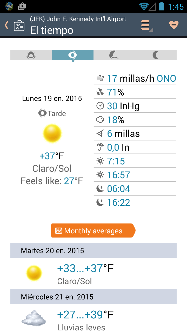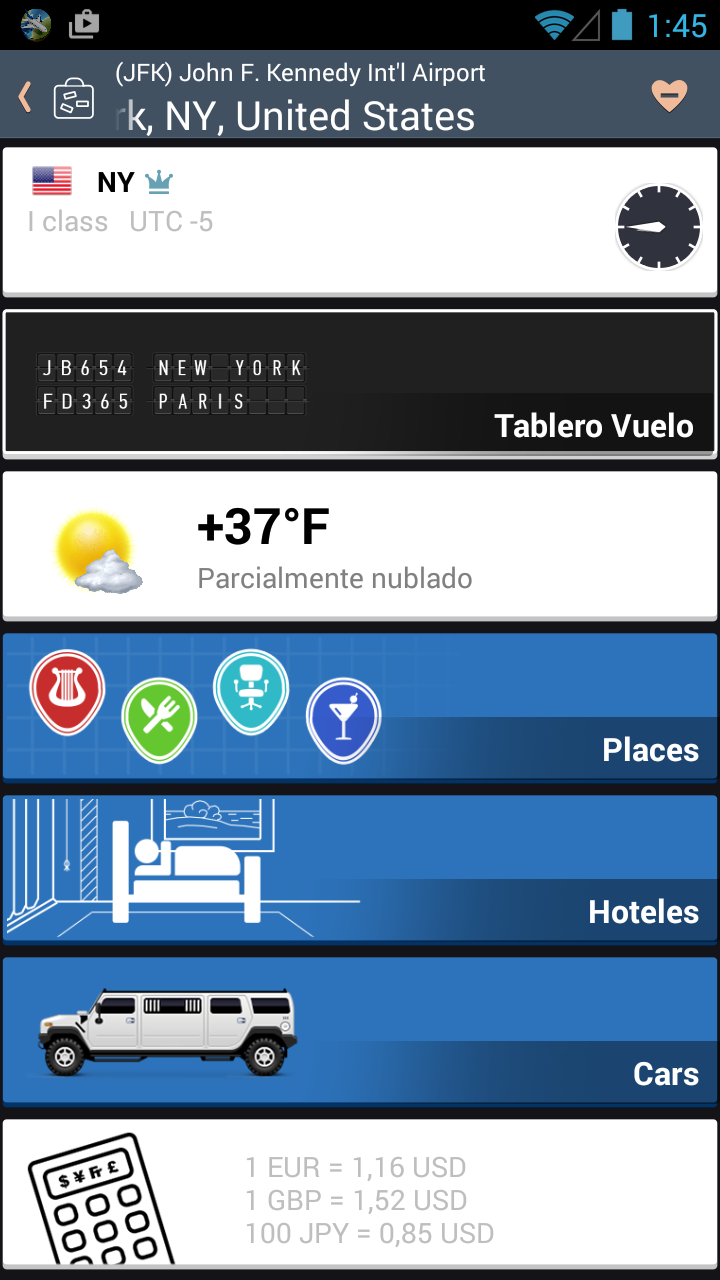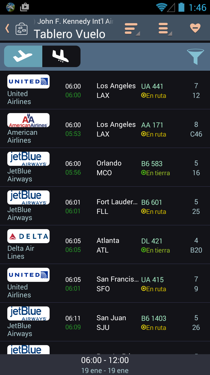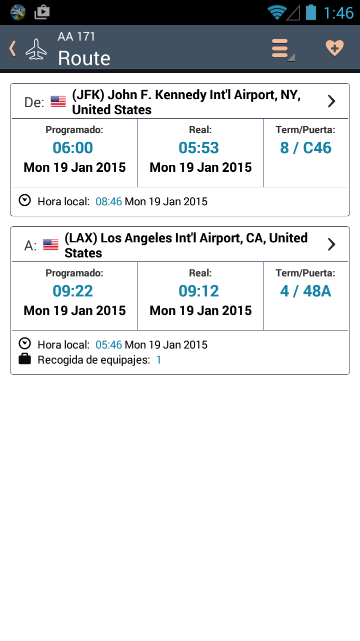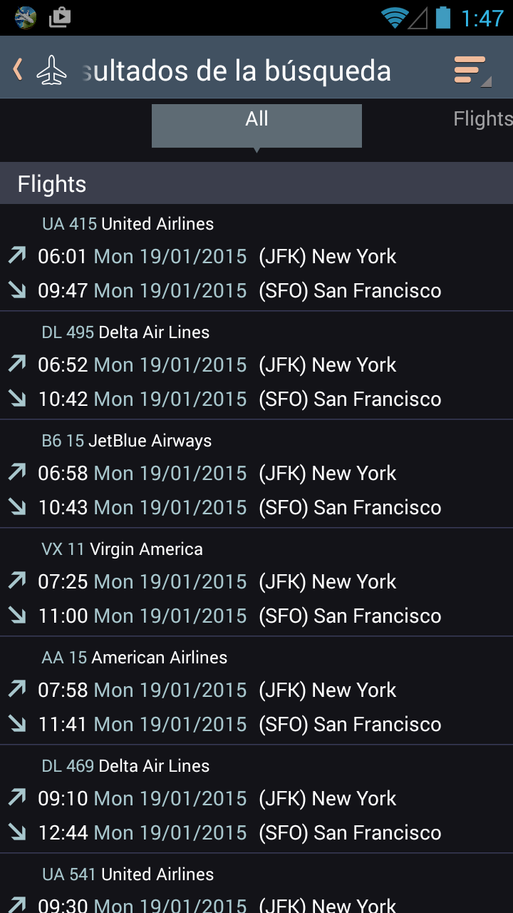 ✈ ESTADO DEL VUELO - La posición actual de la aeronave en el mapa con la velocidad real para la mayoría de los vuelos. ✈ LA COBERTURA MÁS GRANDE PARA LOS VUELOS, AEROPUERTOS y COMPAÑÍAS AÉREAS - Hay unas 1500 aerolíneas. La gran mayoría de aerolíneas son comerciales, aunque hay algunos chárters y aviones de carga: Air Europa, Iberia Airlines, Volotea, Vueling Airlines - 16500 aeropuertos en el mapa disponen de información sobre el estado de los vuelos y el tiempo - Encontrar los aeropuertos más cercanos en un radio de 200 km de su posición actual ✈ SALIDAS Y LLEGADAS DE VUELOS EN TIEMPO REAL - Advanced orden de clasificación - Filtrar la información del aeropuerto: aerolíneas, estado de los vuelos, de llegada y de salida y de información de rango de tiempo para escanear el cielo más eficaz - Intervalo de 3 días (72 horas) de tiempo para las llegadas y salidas ✈ SYNC - Calendario - TripIt ✈ PUSH-NOTIFICACIONES - Alertas sobre cambios en el estado del vuelo ✈ INFORMACIÓN SOBRE RETRASOS Y EL TIEMPO EN LOS AEROPUERTOS - Retraso en una escala de 5 puntos con el paso 0.2 - Temperatura real - La velocidad y dirección del viento - 15 días de previsión meteorológica detallada ✈ PLANES DE TERMINALES Y MAPAS DE ASIENTOS - Disponible para las principales compañías aéreas y aeropuertos. Puede descargarlo todo al mismo tiempo desde el menú "Contenido adicional" - Especificaciones para tipos de aeronaves 400+ ✈ COMPARTIR INFORMACIÓN SOBRE EL ESTADO DEL VUELO: - SMS - E-mail - Twitter - Facebook ✈ BUSCAR VUELOS - Por número de vuelo y la fecha de salida (para un año antes) - Por la ruta y la fecha de salida - Acceso directo a la lista de los 10 vuelos y aeropuertos vistos recientemente - Buscador de vuelos indirectos ✈ SERVICIOS - Explorar hoteles a través de booking.com - Alquiler de coches a través de rentalcars.com - En un lugar del aeropuerto a través de Foursquare - Radar muestra aeropuertos y vuelos cercanos ✈ FAVORITOS - Añadir los vuelos y aeropuertos por deslizar desde la derecha a la izquierda ✈ MULTILINGÜE - 29 Idiomas compatibles ✈ UNIVERSAL APP - Versión de una para los teléfonos y tabletas Android España: • Albacete (ABC) • Alguaire (LEDA) • Alicante (ALC) • Almeria (LEI) • Asturias (OVD) • Badajoz (BJZ) • Barcelona (BCN) • Bilbao (BIO) • Burgos (LEBG) • Ceuta (JCU) • Ciudad Real (CQM) • Girona (GRO) • Granada (GRX) • Ibiza (IBZ) • Jerez De La Frontera (XRY) • La Coruna (LCG) • Lanzarote (ACE) • Las Palmas (LPA) • Leon (LEN) • Logrono (RJL) • Madrid (MAD) • Malaga (AGP) • Melilla (MLN) • Menorca (MAH) • Murcia (MJV) • Palma Mallorca (PMI) • Pamplona (PNA) • Puerto del Rosario (FUE) • Reus (REU) • Salamanca (SLM) • San Sebastian (EAS) • San Sebastian de la Gomera (GMZ) • Santa Cruz De La Palma (SPC) • Santander (SDR) • Santiago De Compostela (SCQ) • Sevilla (SVQ) • Tenerife (TFN) • Tenerife (TFS) • Valencia (VLC) • Valladolid (VLL) • Valverde (VDE) • Vigo (VGO) • Vitoria (VIT) • Zaragoza (ZAZ) República Argentina: • Bahia Blanca (BHI) • Buenos Aires (AEP) • Buenos Aires (EZE) • Catamarca (CTC) • Comodoro Rivadavia (CRD) • Cordoba (COR) • Corrientes (CNQ) • El Calafate (FTE) • Esquel (EQS) • Formosa (FMA) • Gobernador Gregores (GGS) • Iguazu (IGR) • Jujuy (JUJ) • La Rioja (IRJ) • Lago Argentino (ING) • Mar Del Plata (MDQ) • Mendoza (MDZ) • Miramar (MJR) • Necochea (NEC) • Neuquen (NQN) • Parana (PRA) • Posadas (PSS) • Puerto Deseado (PUD) • Puerto Madryn (PMY) • Resistencia (RES) • Rio Gallegos (RGL) • Rio Grande (RGA) • Rosario (ROS) • Salta (SLA) • San Antonio Oeste (OES) • San Carlos de Bariloche (BRC) • San Juan (UAQ) • San Julian (ULA) • San Luis (LUQ) • San Martin De Los Andes (CPC) • San Rafael (AFA) • Santa Cruz (RZA) • Santa Fe (SFN) • Santa Rosa (RSA) • Santa Teresita (SST) • Santiago Del Estero (SDE) • Trelew (REL) • Tucuman (TUC) • Ushuaia (USH) • Viedma (VDM) • Villa Gesell (VLG) • Villa Mercedes (VME)