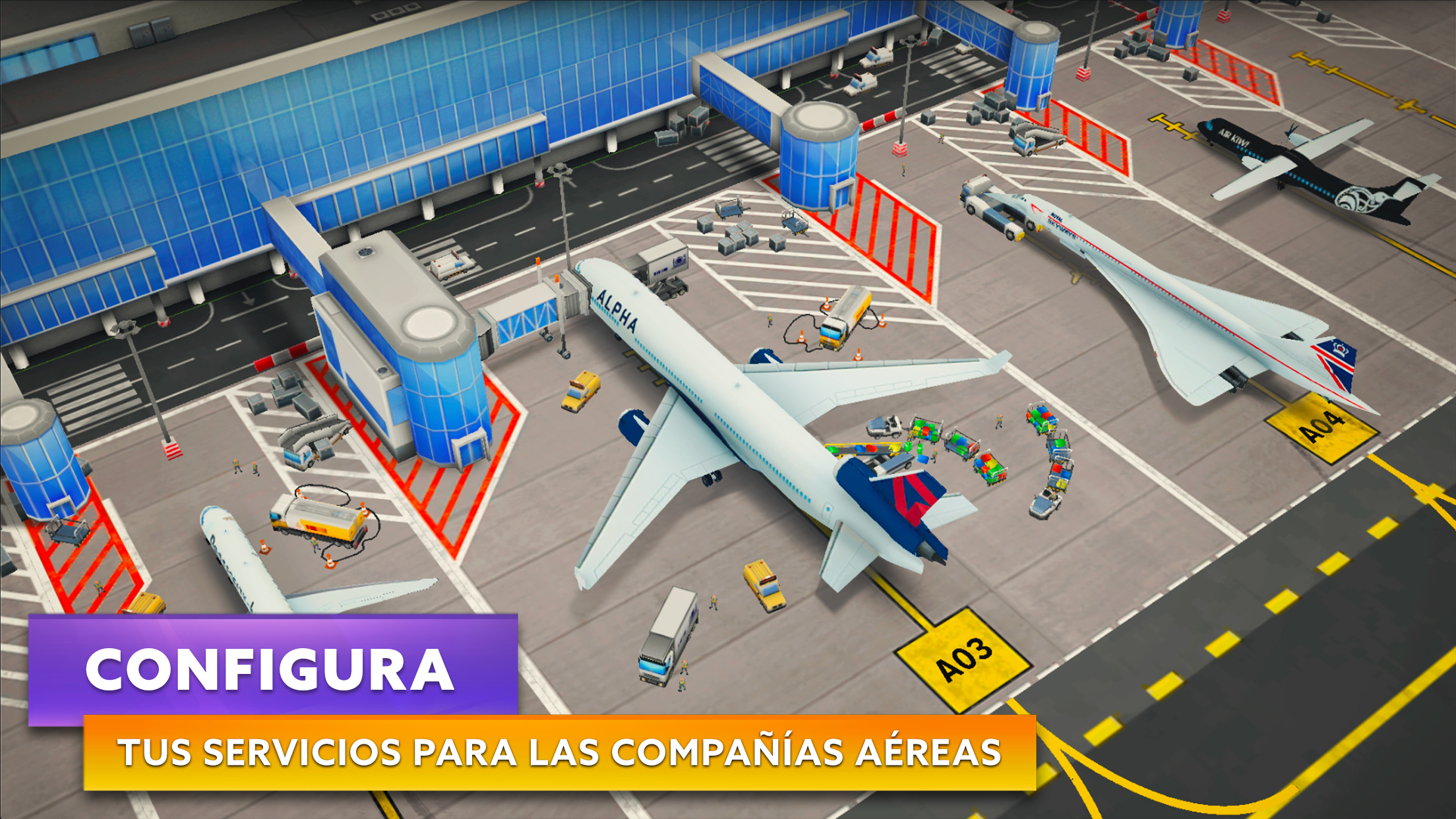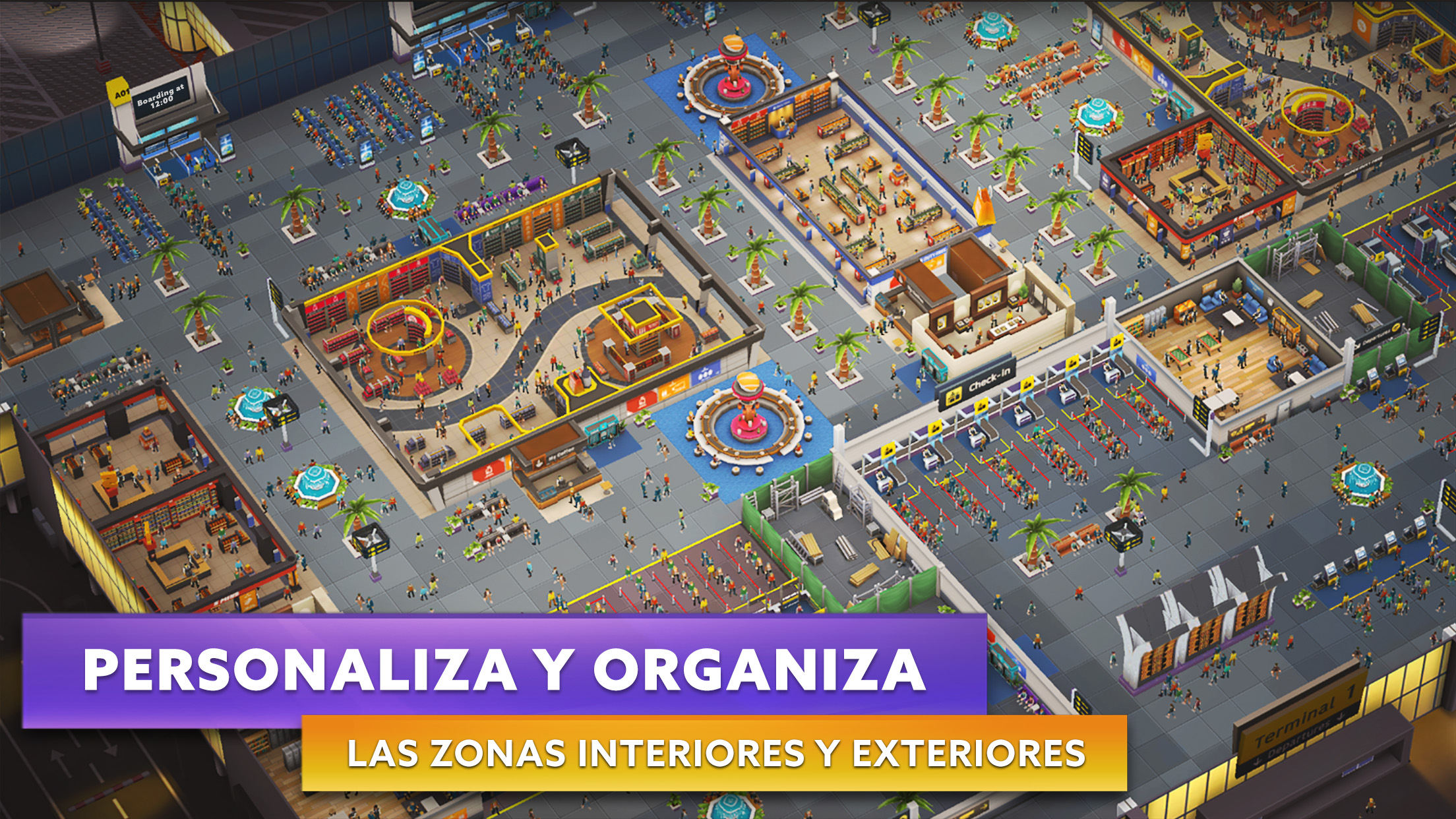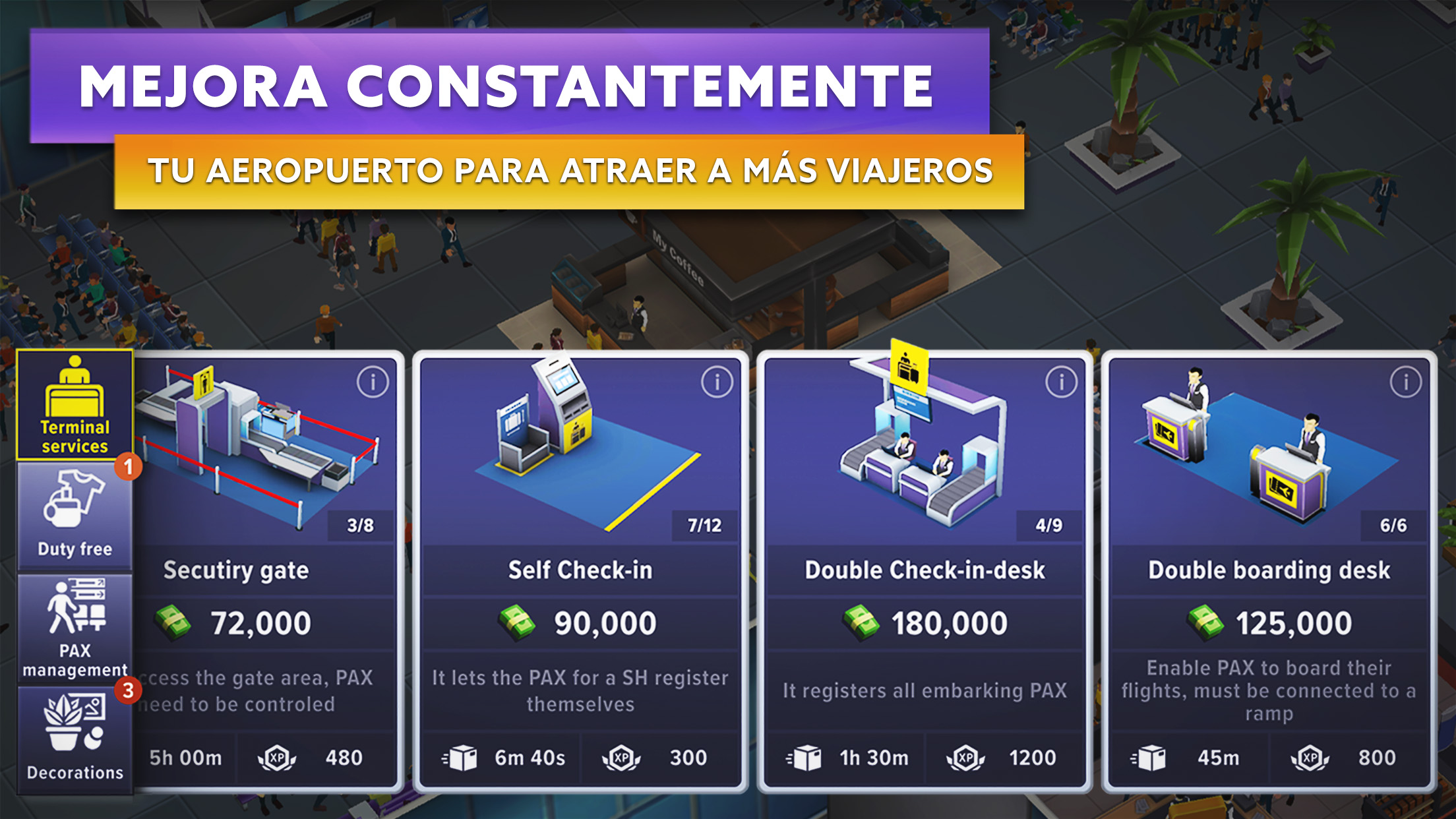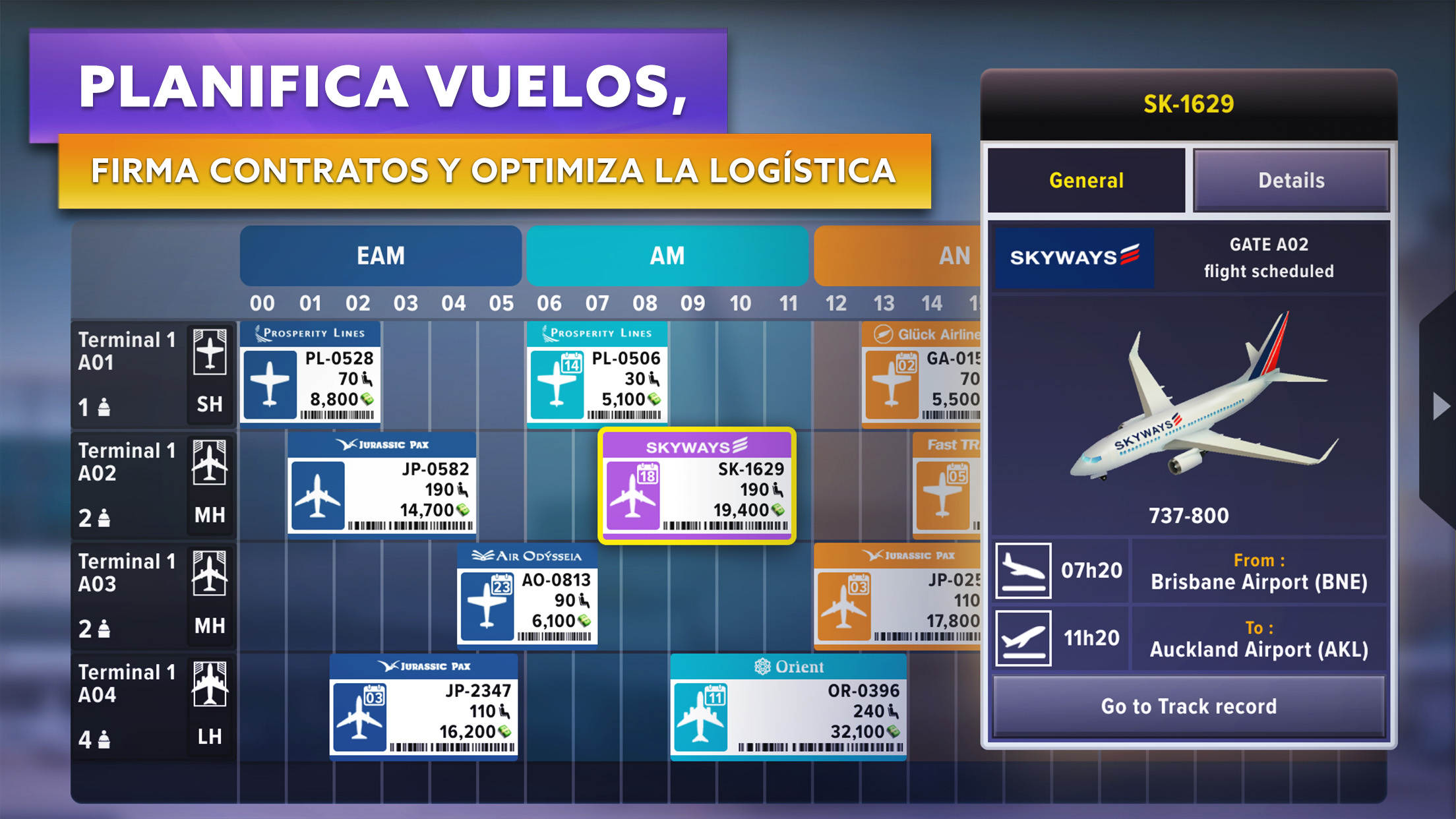 Desarrollado por los creadores de Airlines Manager Tycoon, Airport Simulator: First Class es un juego de estrategia, gestión y construcción. Serás el director de un aeropuerto: construye y organiza las zonas interiores y exteriores, firma y gestiona colaboraciones con compañías aéreas, y controla el flujo de pasajeros y su satisfacción. ✈ El aeropuerto es una ciudad en sí misma. Para recibir aviones, tendrás que construir, desarrollar y modernizar tus infraestructuras aeroportuarias. ✈ Define tu estrategia, firma y gestiona diversos contratos con compañías aéreas y desarrolla el nivel de relación con tus socios. ✈ ¡Tus pasajeros vienen de la ciudad! Gestiona el flujo de pasajeros desde su llegada al aeropuerto, ofréceles infraestructuras cómodas y tiendas en las que puedan comprar. Aumentarás su gasto y tu aeropuerto será más rentable. ¿Lograrás satisfacerlos? ✈ Controla todo, desde el flujo de pasajeros hasta el control del tráfico aéreo, pasando por la organización del embarque: facturación, mostrador de embarque, seguridad, planificación de vuelos, abastecimiento de los aviones, etc. DA VIDA A TU AEROPUERTO Y PERSONALÍZALO A TU IMAGEN ✈Organiza estratégicamente las infraestructuras de tu aeropuerto. Desde el terminal hasta la plataforma, pasando por las pistas de rodaje, las pistas de despegue, las estaciones de combustible, los edificios de restauración, los mostradores de facturación, los puestos de seguridad, las puertas de embarque, los puntos de control de pasaportes, las cafeterías, las tiendas o hasta la decoración... ¡Construye un aeropuerto a tu imagen! ✈Asegúrate de que la organización de tu aeropuerto responda a las necesidades de los pasajeros. Mejora tus servicios para garantizar unos procesos más rápidos, una mayor rentabilidad o simplemente una mayor comodidad. Esto tendrá un impacto en tu relación con las aerolíneas colaboradoras. ¡El aeropuerto es como una ciudad que hay que gestionar! ELABORA UNA ESTRATEGIA Y ESTABLECE COLABORACIONES ✈ Define tu estrategia aeroportuaria y elige el tipo de vuelos y aviones que necesitarás: vuelos de bajo presupuesto, premium, regulares, chárter, de corta o media distancia... Incluso tendrás la posibilidad de abrir rutas de aviación general. ✈Firma colaboraciones para determinar el número de vuelos en tu aeropuerto. Cada vez que contrates vuelos adicionales en el marco de un contrato existente, reforzarás tu relación con la aerolínea colaboradora. ✈Desarrolla colaboraciones: cada vuelo adicional te aportará una bonificación de firma. ¡Pero ten cuidado de no firmar demasiados vuelos! Si eres incapaz de gestionarlos, corres el riesgo de romper la relación con tus socios, lo que conllevará la rescisión del contrato. ✈Elige entre nuestros modelos de aviones en 3D para cumplir con tus obligaciones contractuales. ✈Elabora tu planificación sobre una base de 24 horas y planifica vuelos con hasta 2 semanas de antelación. GESTIÓN DE LA FLOTA Y DE LOS PASAJEROS ✈La satisfacción de tus pasajeros repercutirá en tus colaboraciones. Para ganar puntos con las compañías aéreas, asegúrate de que tus servicios, tus pistas, tu planificación de vuelos, tu flota y tu personal sean irreprochables en todo momento. ✈Vigila la relación entre el número de facturaciones y el número de pasajeros embarcados: ¿Ha habido retrasos? ✈¡Respeta los horarios! Asegúrate de que tus pistas estén en buen estado para no retrasar el despegue o el aterrizaje de los aviones, y organízate para que tus pasajeros embarquen y desembarquen a la hora prevista. ✈Planifica correctamente los servicios aeroportuarios (combustible, restauración, equipaje, etc.) para no provocar retrasos en la planificación de vuelos. ¿Tu avión ha cargado combustible a tiempo? ¿Tu servicio de catering cuenta con un número de camiones suficiente para abastecer a todos los aviones? ¿Tus aerolíneas colaboradoras están satisfechas con los servicios prestados? ¡Construye tu aeropuerto y conviértete en el mejor director aeroportuario AHORA!