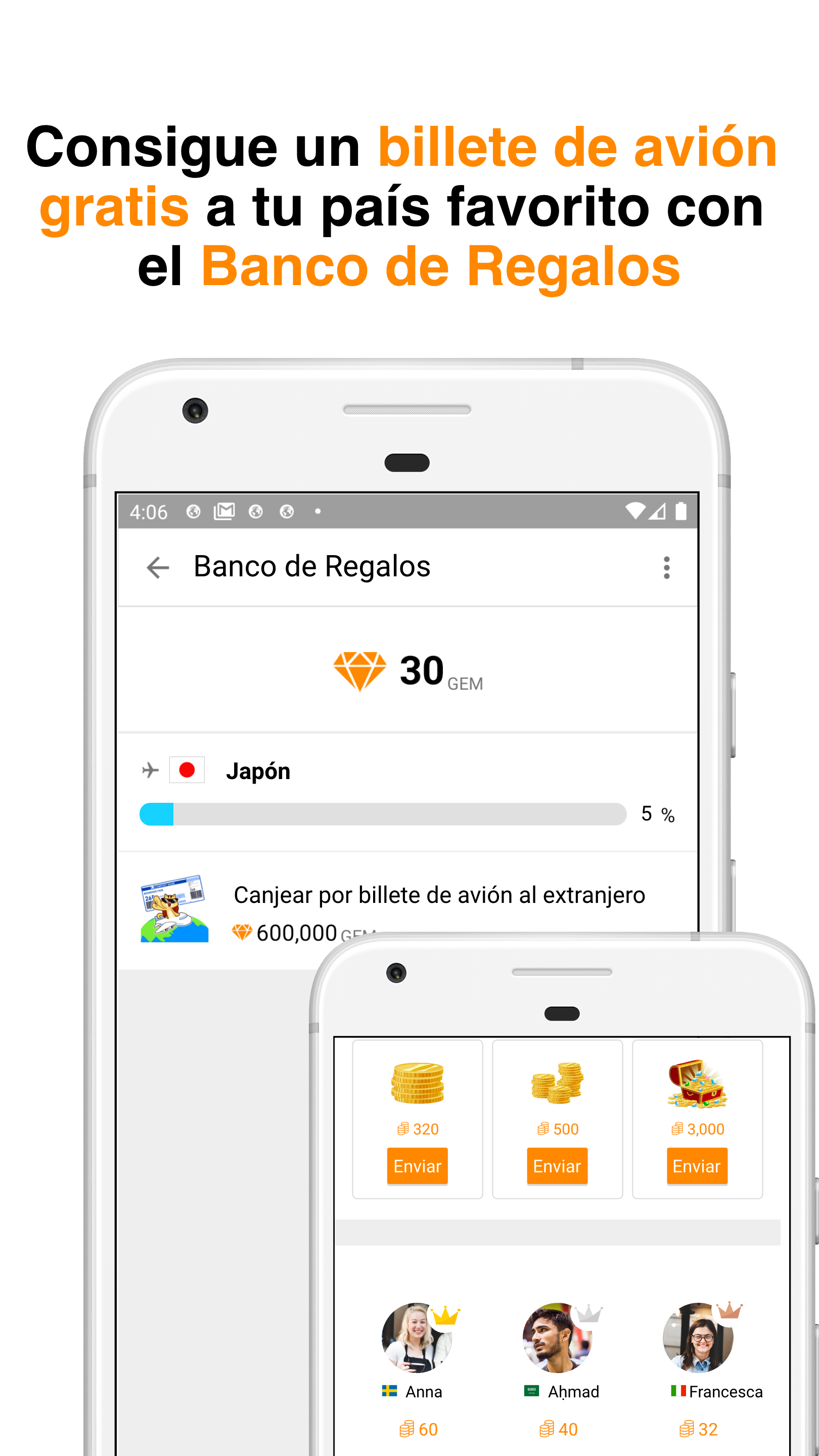 -Los Regalos recibidos se acumulan en el "Banco de Regalos" y una vez alcanzas el objetivo establecido conseguirás un billete de avión al país que hayas elegido.