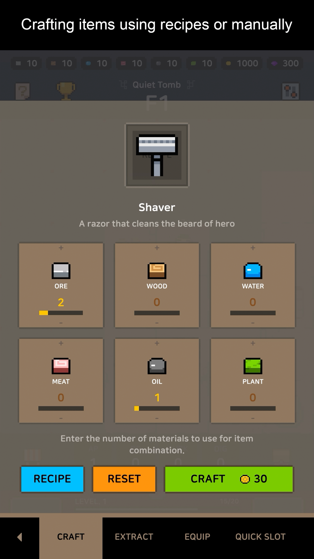 Crea artículos con alquimia con los materiales que recolectas. Los alquimistas en esta mazmorra están extrañamente creando spam, tapas de ollas, pelotas de béisbol, monederos, navajas de afeitar, etc., pero son suficientes para usarlos como poderosas armas o escudos. Haz y usa pociones de recuperación que aparecen en cualquier juego de rol, y haz y usa monedas y gemas. Alchemy puede crear cualquier cosa que necesites. Puedes derrotar fácilmente a los monstruos oscuros haciendo y equipando objetos con las estadísticas adecuadas. El poder de ataque se muestra en la parte superior izquierda de todos los monstruos y el poder de defensa se muestra en la parte superior derecha. Puedes predecir el resultado de la batalla equipando elementos y comparando las estadísticas del jugador con las estadísticas del monstruo. En Alchemy Rumble, cuantos más elementos crees, más fácil será explorar la mazmorra. Hay 6 tipos de materiales necesarios para hacer cosas: metal, madera, agua, carne, aceite y plantas. Para hacer una poderosa espada bastarda, por supuesto, necesitas mucho metal, y si haces zapatos de cuero, por supuesto que necesitas mucho cuero, ¿no? El petróleo se usa para hacer objetos de plástico y las bebidas requieren agua y materiales vegetales. Una dieta que aumenta la resistencia definitivamente requiere ingredientes cárnicos. Ahora, conviértete en el protagonista de la Gran Guerra de la Alquimia y crea objetos inimaginables en esos días. Cómo jugar * Derrota a los monstruos que se esconden bajo tierra y recoge materiales. * Excava rocas y charcos de agua para obtener ingredientes o recetas de alquimia. * Fabrica varios objetos usando los materiales recogidos en el escritorio del laboratorio. * En el escritorio del laboratorio, si conoce la cantidad de materiales necesarios para hacer un artículo, puede ingresarlos directamente para hacer un artículo, y si usa una receta, puede ingresar el número automáticamente. * Cuando necesite una receta con urgencia, puede utilizar la máquina expendedora de recetas. * Todos los objetos hechos con alquimia tienen sus propias estadísticas, que se pueden equipar para mejorar aún más las estadísticas del jugador. * La comida o bebida preparada también puede disfrutar de los efectos de armas y escudos de acuerdo con sus estadísticas únicas, y puede usarse como elemento de recuperación al adjuntarlo a una ranura rápida. . * En batalla, consume energía igual a la capacidad del arma para atacar, y si la energía es insuficiente, consume HP en lugar de atacar. * Al mismo tiempo que el ataque, el monstruo también será atacado, así que ten cuidado con el consumo de energía.