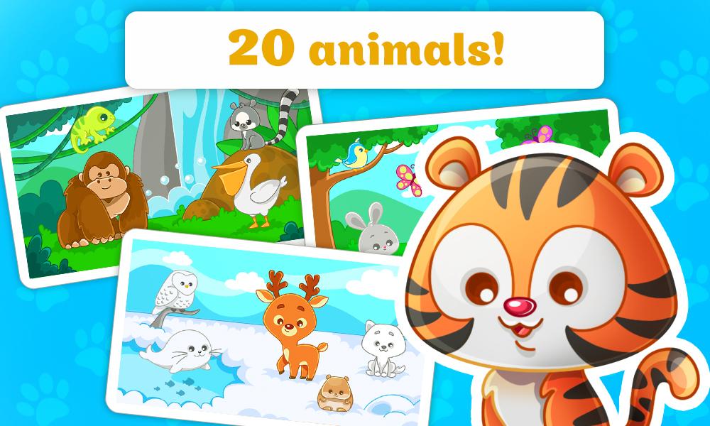 - Cientos de puzzles en modo de fichas didácticas le esperan al pequeño jugador para ayudarle a descubrir el maravilloso mundo de la naturaleza y animales salvajes que han venido a saludarle desde los rincones más lejanos del planeta. Entre ellos, un simpático elefante, una cebra juguetona, un león risueño, un loro parlanchín y una valiente iguana acróbata que trepa los árboles del bosque sin miedo a caer. Les hacen compañía una tortuga viajera que ha recorrido el mundo en busca de nuevos amigos, un camello aventurero que se atreve a cruzar cualquier desierto por más grande que sea, una morsa nadadora que adora tomar el sol en la playa, un flamenco rosa que pasa el día apoyado en una pata, un oso muy goloso que ama la miel y un pequeño erizo que no teme plantar cara al enemigo. También estarán presentes un búfalo, lobo, ballena, cervus, zorro, rinoceronte, serpiente, perezoso, cocodrilo, mono, tigre, lémur, búho, hipopótamo, liebre, zorro, tapir, rana, gato, pingüinos, mariposas, pájaros y peces de colores.