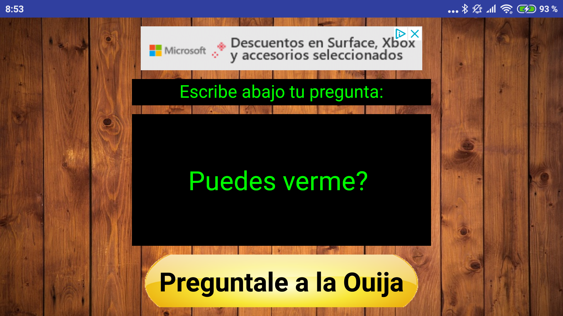 La aplicación Pregunta a Ouija responde a cualquier pregunta que haga, siempre dirá "sí" o "no". Haz cualquier pregunta y responde comunicándote con espíritu y fantasía. ¿Te atreves? Instrucciones: * Concéntrate * Escribe una pregunta cuya respuesta mar "sí" o "no" y pulsa el botón para ver la respuesta de la Ouija. Puedes hacer tantas preguntas como quieras. Nota: La aplicación Pregunta a Ouija es una aplicación para divertirse. Los resultados no son confiables, así que no los tomes demasiado en serio.