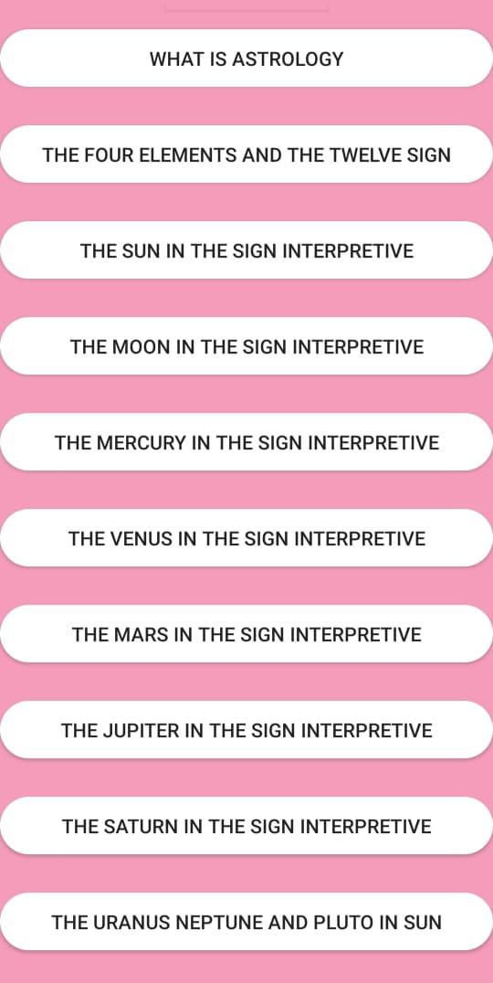 La astrología es una gran ciencia que, en sí misma, ha contenido un misterio misterioso en sí misma, desde la antigüedad, a través de nuestro método astrológico Sage, podemos decir fácilmente sobre el futuro, la metodología astrológica se basó completamente en las constelaciones de las casas. El método matemático que se puede contar sobre el futuro de los movimientos planetarios y los eventos que ocurren en el futuro. La astrología se basa en 9 planetas. Un método matemático que puede ser conocido sobre los eventos que ocurren en el futuro sobre la base de esto y la influencia considerable de estos planetas en la vida de la persona. Los siguientes contenidos están en esta aplicación * ¿Qué es la astrología? * Los cuatro elementos y el signo de los doce * El sol en el signo interpretativo. * La Luna en el Signo Interpretativo. * El mercurio en el signo interpretativo. * La Venus en el Signo Interpretativo. * El Marte en el Signo Interpretativo. * El Júpiter en el Signo Interpretativo. * El Saturno en el Signo Interpretativo. * Urano Neptuno y Plutón en Sol * Ascendente y Midheaven * Interpretando el Ascendente * Las casas interpretativas. * Entendiendo la colocación de la casa * Comprender los aspectos planetarios * Aspectos con el sol. * Aspectos con la luna. * Aspectos con el mercurio. * Aspectos con la Venus. * Aspectos con el Marte. * Aspectos con el Jupiter. * Aspectos con el Saturno. * Aspectos del Ascendente. * Aspectos con los planetas exteriores. * Síntesis de la carta