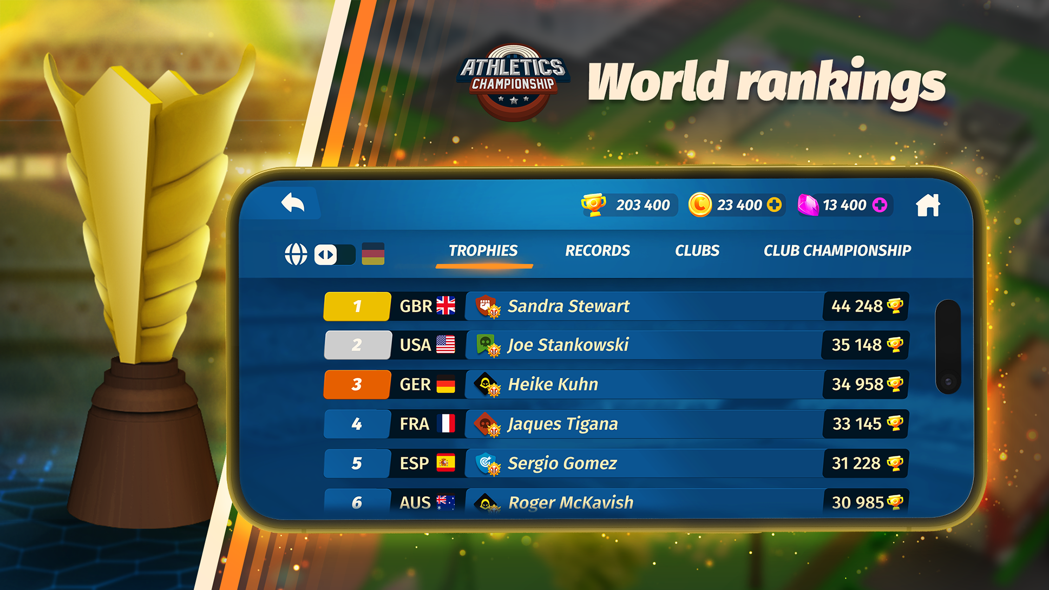 Compite en todos los escenarios reales en uno de los mejores juegos de atletismo del mundo. ¡Dirige a tu atleta, a tu equipo y llévalos a la victoria! Únete a la competición en 20 disciplinas de atletismo como 100 m, lanzamiento de peso, salto de longitud y más. ¡Personaliza a tu atleta, elige el mejor equipo y entrenadores para lograr la victoria! Construye tu propio centro de entrenamiento, participa en torneos y conéctate con otros jugadores en clubes. ¡Competir por el oro nunca ha sido tan divertido! Se requiere una conexión de red. CARACTERÍSTICAS: ● Enfréntate a jugadores de todo el mundo en competiciones de atletismo y llévate sus trofeos ● Gana cofres para desbloquear recompensas, recoge nuevas y poderosas cartas con equipo y actualiza las existentes ● Progresa a través de múltiples arenas hasta llegar a la cima ● Forma un equipo para construir tu propia comunidad ● Completa tareas diarias para obtener grandes recompensas ● 20 disciplinas de atletismo: 100 m, 200 m, 400 m, 800 m, 1500 m, 5000 m, 10000 m, maratón, 110 m con vallas, 400 m con vallas, 3000 m con obstáculos, salto de longitud, triple salto, salto de altura, salto con pértiga, lanzamiento de peso, disco, martillo, jabalina, decatlón