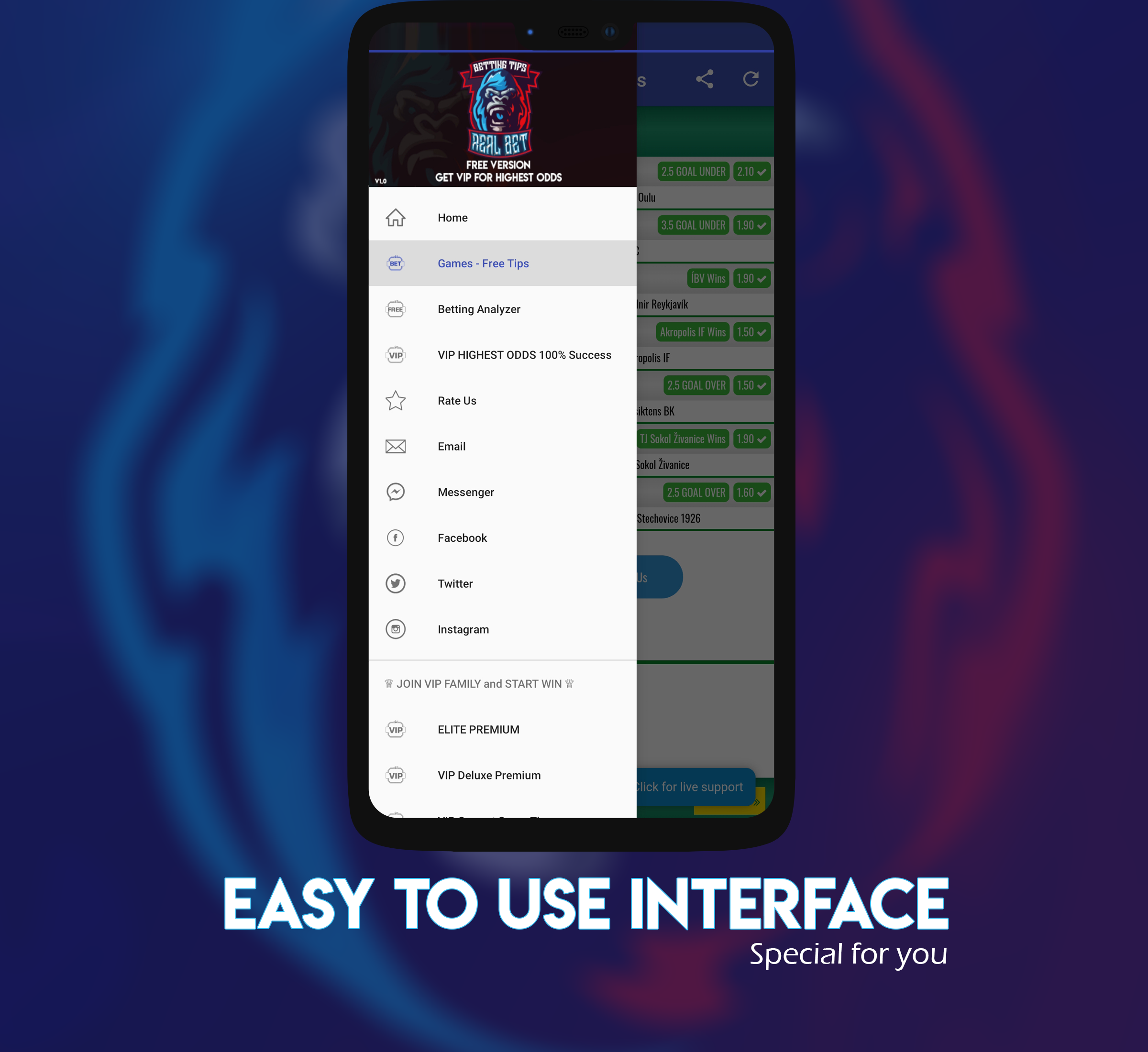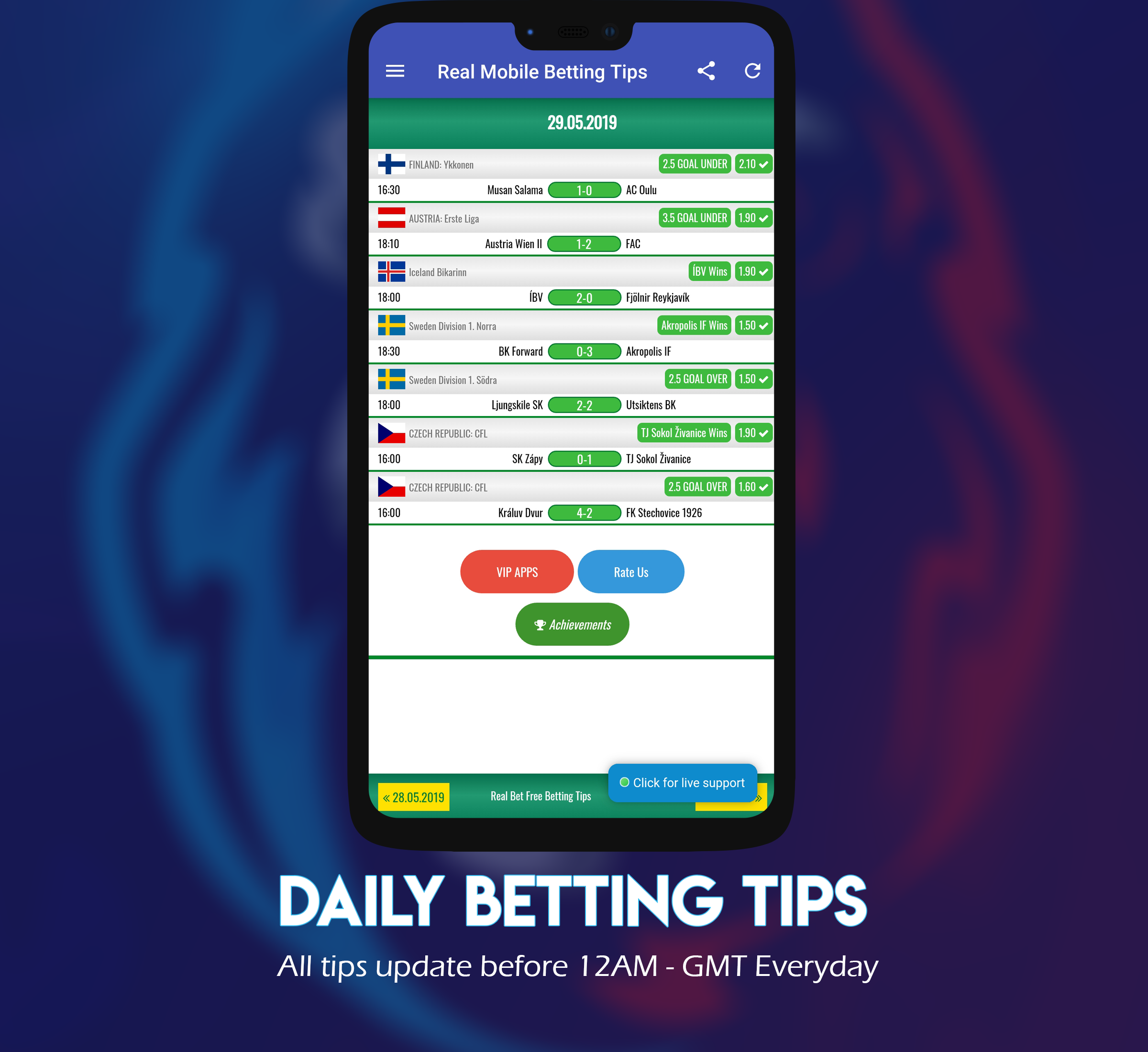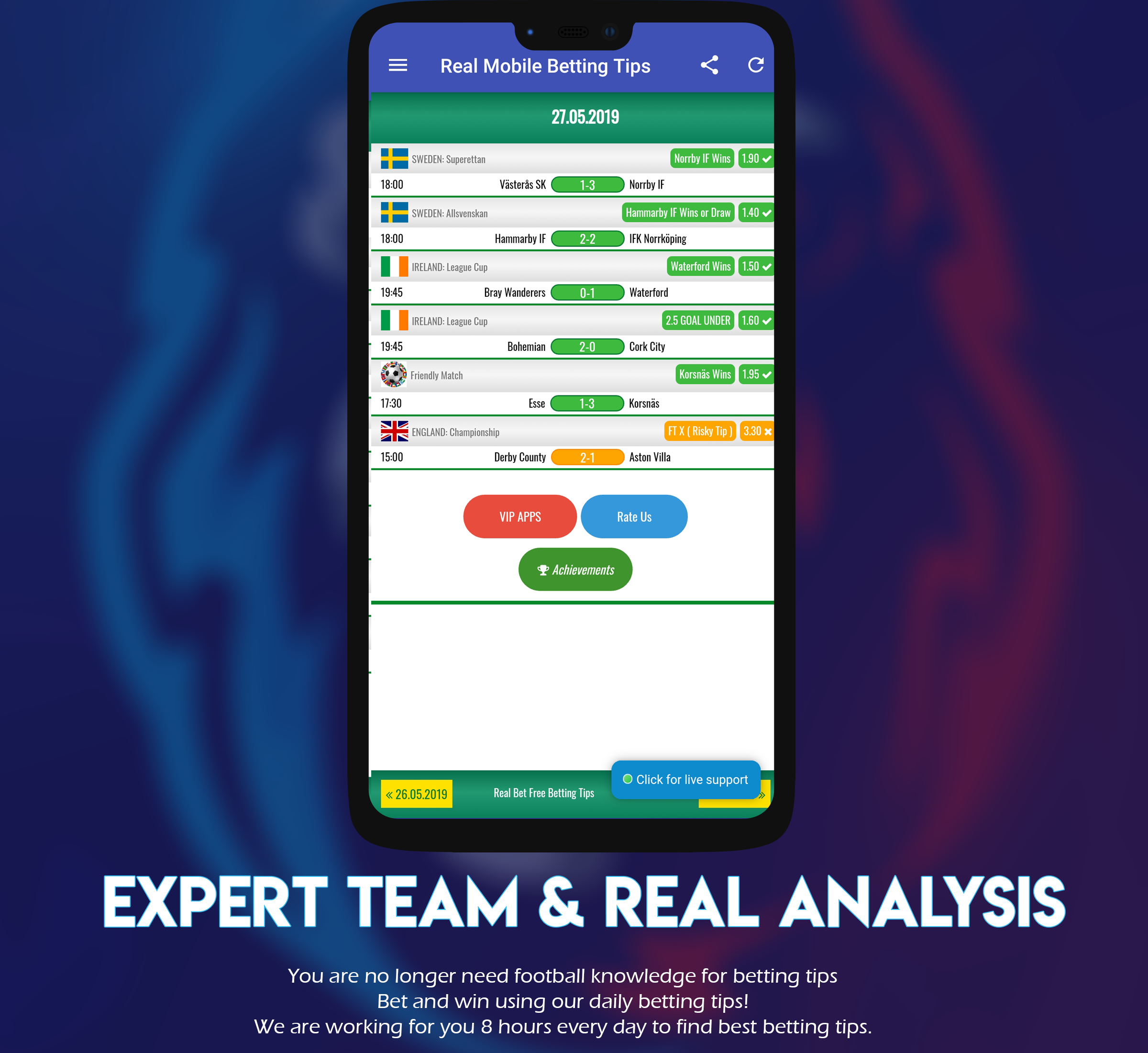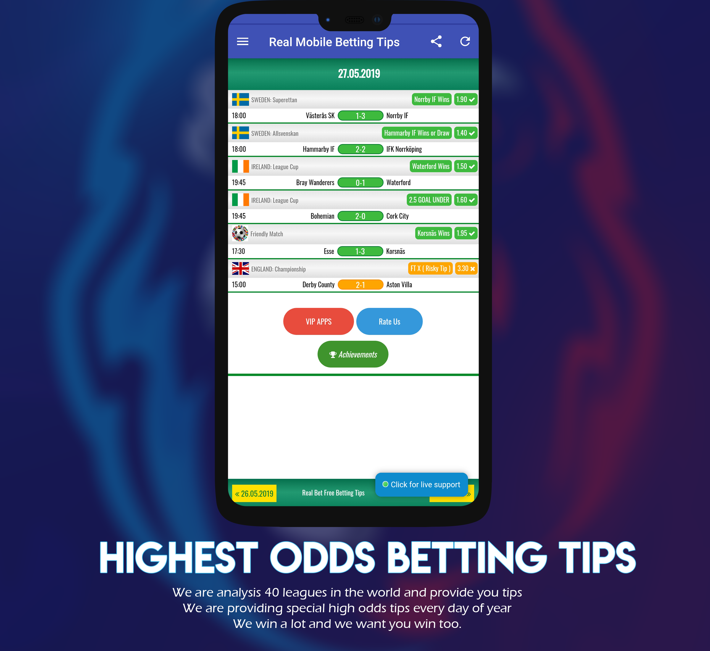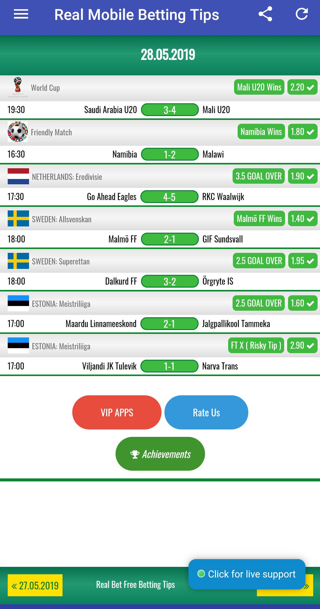 Si desea tener probabilidades altas, puede comprar una vez nuestra aplicación de consejos de apuestas VIP y usarla de por vida. La aplicación de consejos de apuestas VIP proporciona consejos de apuestas seguros y siempre gana.