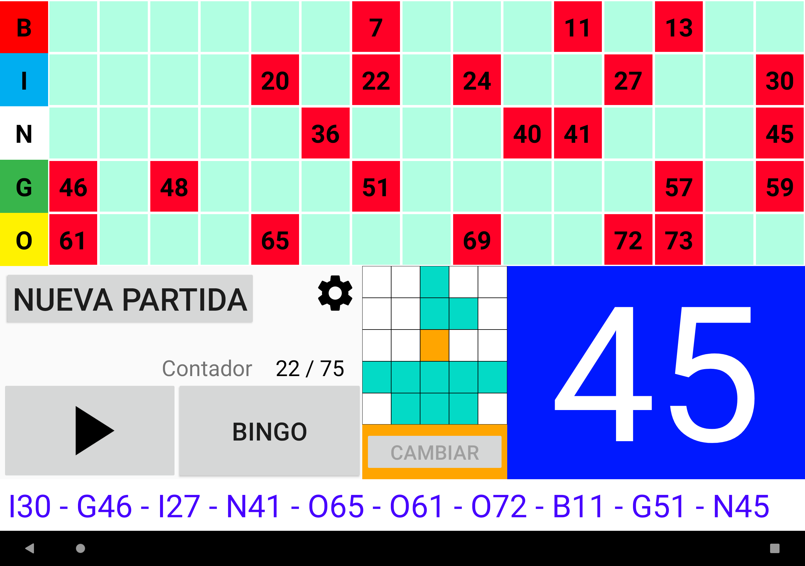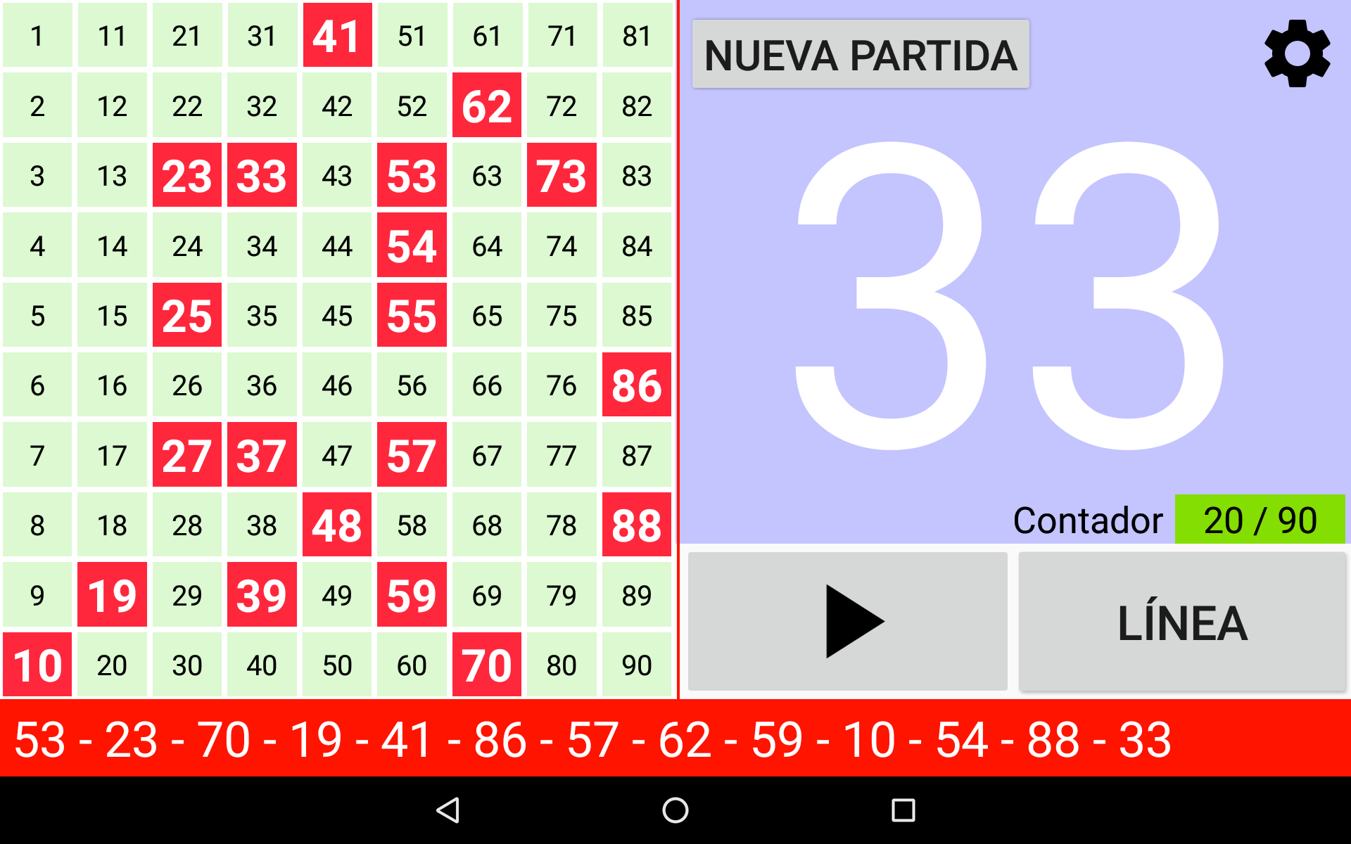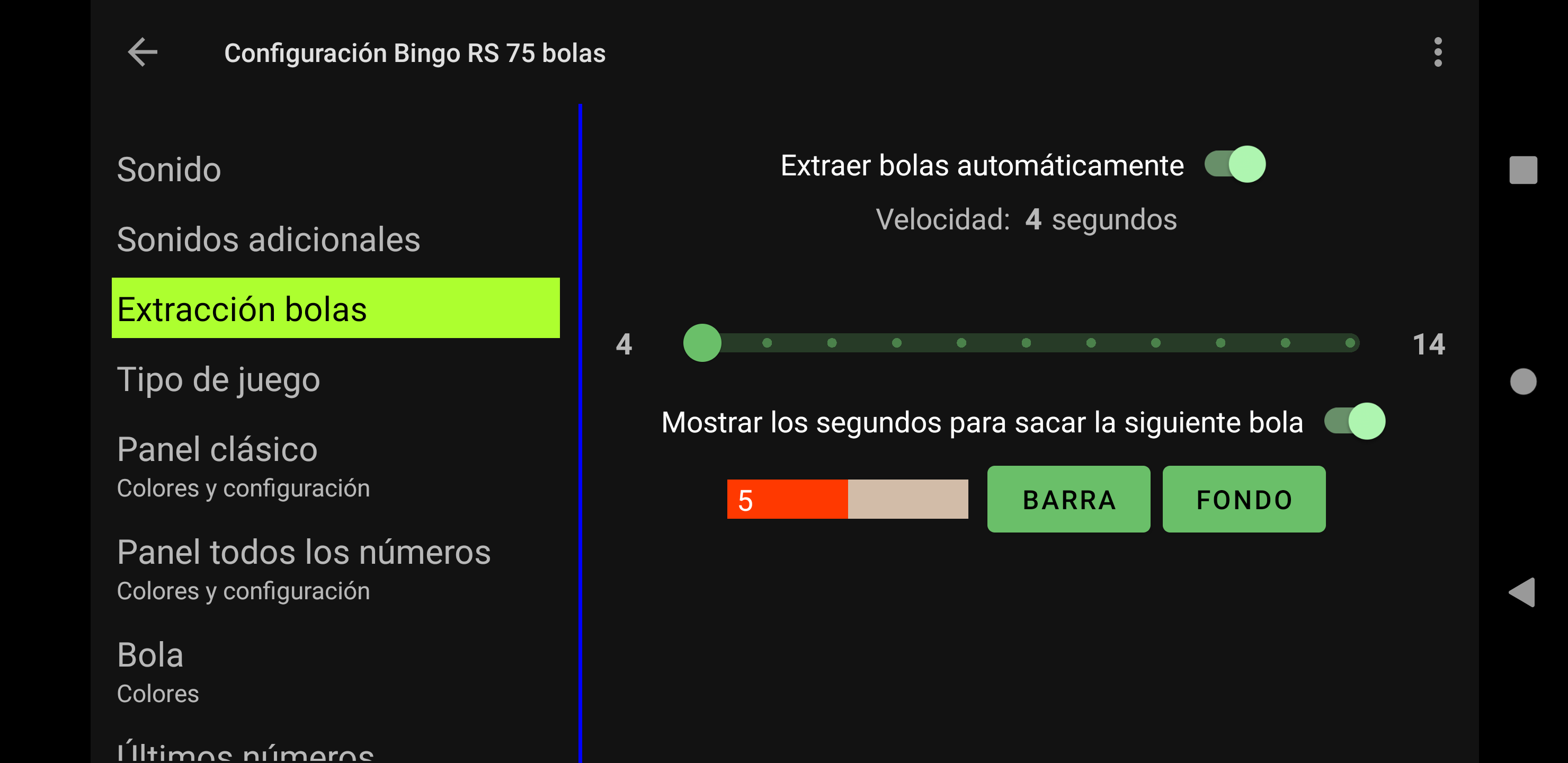Juego de Bingo Realmente Simple altamente configurable Cuatro modos de juego: Bingo de 90 bolas, Bingo de 80 bolas, Bingo de 75 bolas y Bingo de 30 bolas. Juega fácilmente con la familia o amigos. Funciona en tu Tablet o móvil. Tamaño de los números grande para facilitar la visualización. Imprime tus cartones o utiliza tu dispositivo como cartón con la App Cartones Bingo RS disponible en Google Play Store y ¡qué empiece la diversión! Características configurables: ►Se puede regular la velocidad de la extracción automática de las bolas, o bien extraer las bolas manualmente. ►Se puede activar y desactivar el que cante los números. ►Si se activa el que cante los números, se puede activar y desactivar el que cante los sonidos adicionales como cuando empieza el juego, o se reanuda el juego. ►En Bingo de 80 bolas, si se activa el que cante los números, se puede activar y desactivar que cante el color de la columna del número que ha salido. ►Si los sonidos adicionales están activados, se pueden personalizar todos los mensajes. ►Se puede configurar Bingo RS con tus colores favoritos. ¡Pruébalo! O bien se pueden utilizar los colores por defecto de Bingo RS. ►Se pueden configurar los efectos visuales de aparición de los números en el panel para una rápida localización: efecto visual del texto, y efecto visual del fondo del número que ha salido. ►Se puede elegir si se muestran todos los números en panel y se destaca el número que ha salido, o solo se muestran los números que han salido. ►Se puede elegir si el número que ha salido se destaca en negrita. ►En la configuración de Bingo de 75 bolas, además se pueden activar y desactivar los efectos visuales de las letras BINGO del panel: efecto visual de la letra y efecto visual del fondo de la letra correspondiente al número que ha salido. ►En la configuración de Bingo de 75 bolas, se pueden gestionar los patrones del juego: se pueden añadir patrones personalizados, editar y borrar. ►Se puede configurar si se muestran colores, o no, en el contador de números salidos. ►Se puede elegir el que el contador de números salidos sea creciente o decreciente. ►En Bingo de 75 bolas se puede ganar cantando Bingo, y opcionalmente cantando línea. ►En Bingo de 75 bolas se puede elegir entre jugar un patrón aleatorio, o elegir uno manualmente. ►En Bingo de 80 bolas se puede ganar cantando Bingo, y opcionalmente cantando 1 línea, 2 líneas, 3 líneas, las 4 esquinas o los 4 números del centro. ►En Bingo de 30 bolas se puede ganar cantando Bingo, y opcionalmente cantando línea, columna o diagonal. ►Opción de repetir el número cantado. ►Opción de cantar los números de dos cifras de uno en uno. Por ejemplo: 28 dos-ocho. ►En Bingo de 75 bolas si se elige cantar los números de dos cifras de uno en uno, se puede elegir entre cantar o no la letra de B-I-N-G-O delante de las dos cifras. ►Opción de mostrar la cuenta atrás en segundos para sacar la siguiente bola. Se muestra el tiempo numéricamente y gráficamente. Otras características: ►Se puede comprar la versión Premium sin anuncios. En cualquier juego ir a Configuración -> Menú de 3 puntos de la parte superior derecha -> Comprar Premium. ►Cuando el juego está en pausa, se puede desplazar el texto de últimos números hacia la izquierda y derecha, para poder comprobar el orden de salida de todos los números de la partida. ►Bingo RS utiliza el motor de síntesis de voz de Google. Si en el idioma del dispositivo están disponibles varias voces, elije tu voz favorita, y Bingo RS la utilizara. ►Se puede seleccionar una voz distinta a la del dispositivo. NOTA: No todas las voces están disponibles en todos los dispositivos y en todos los idiomas. ►Opción de escanear códigos QR para comprobar de manera rápida y fácil los números de los cartones. Solo funciona con los códigos QR generados por la App Cartones Bingo RS, disponible en Google Play Store. Para poder escanear los códigos QR es necesario conceder permiso de acceso a la cámara.