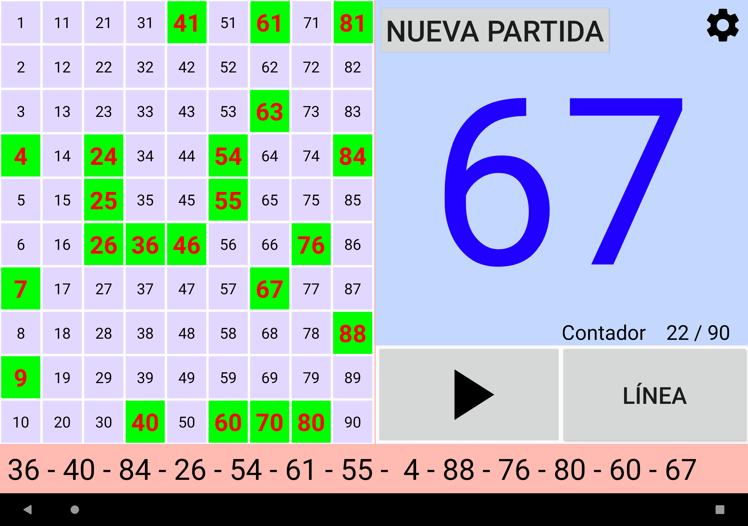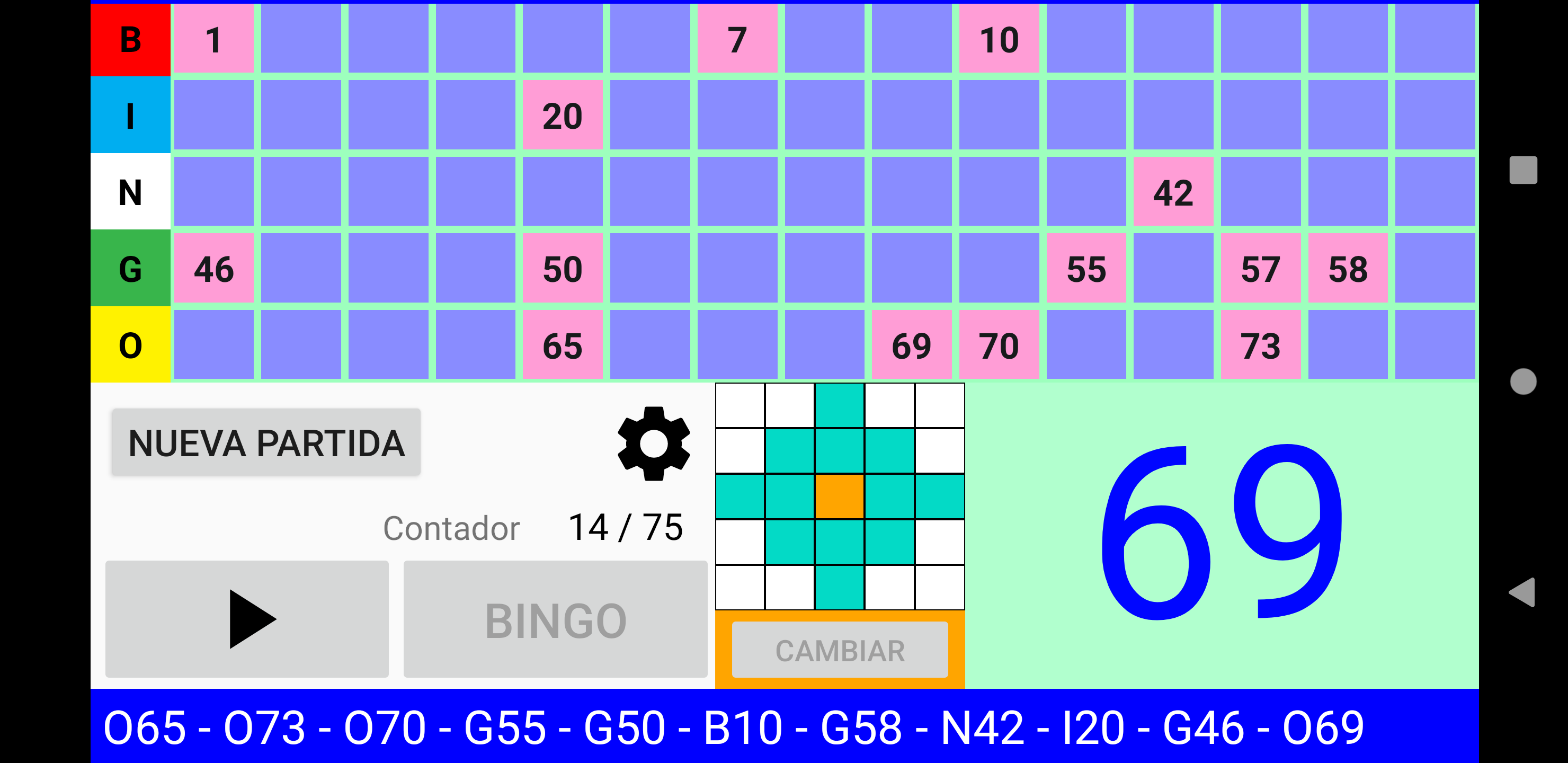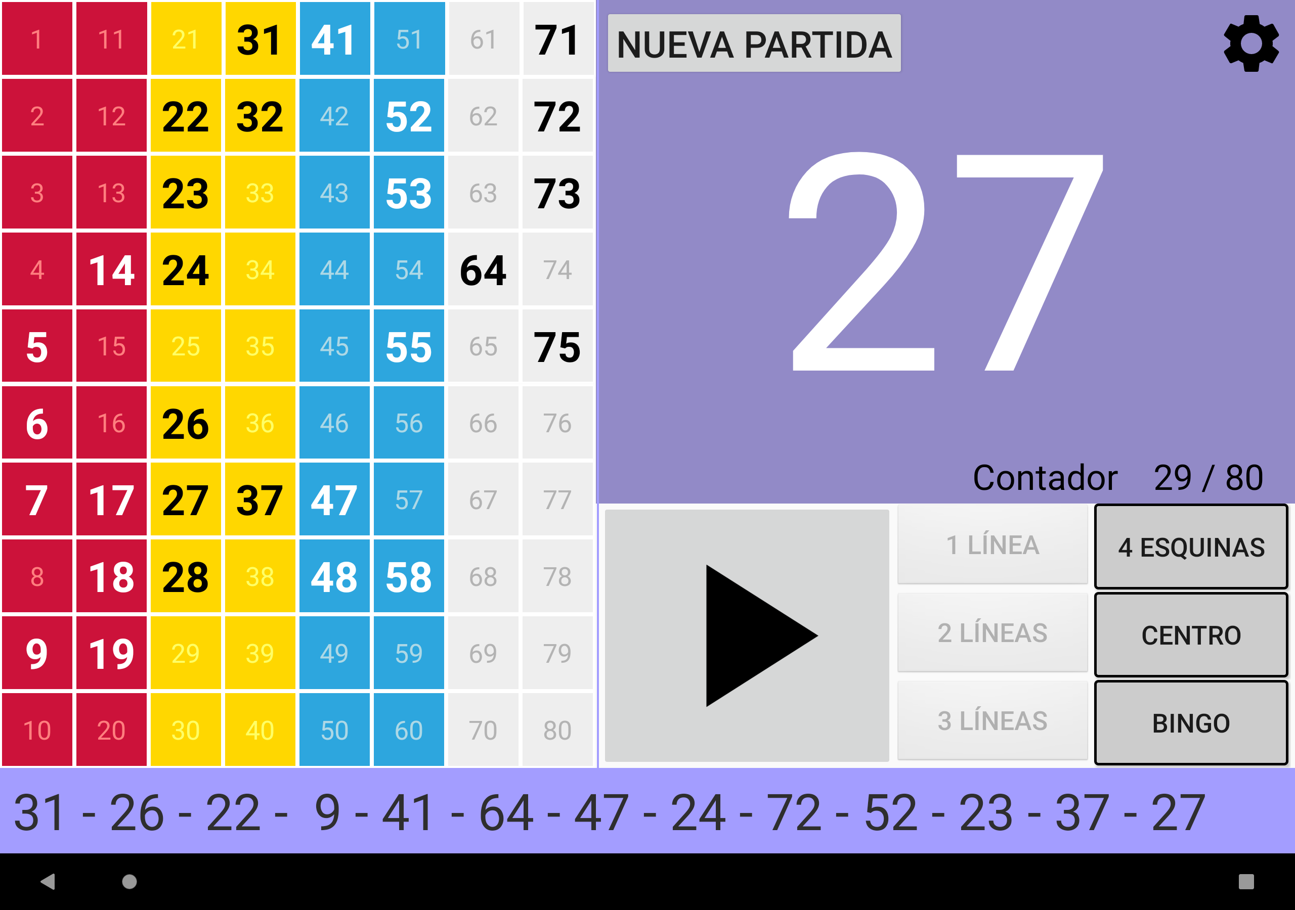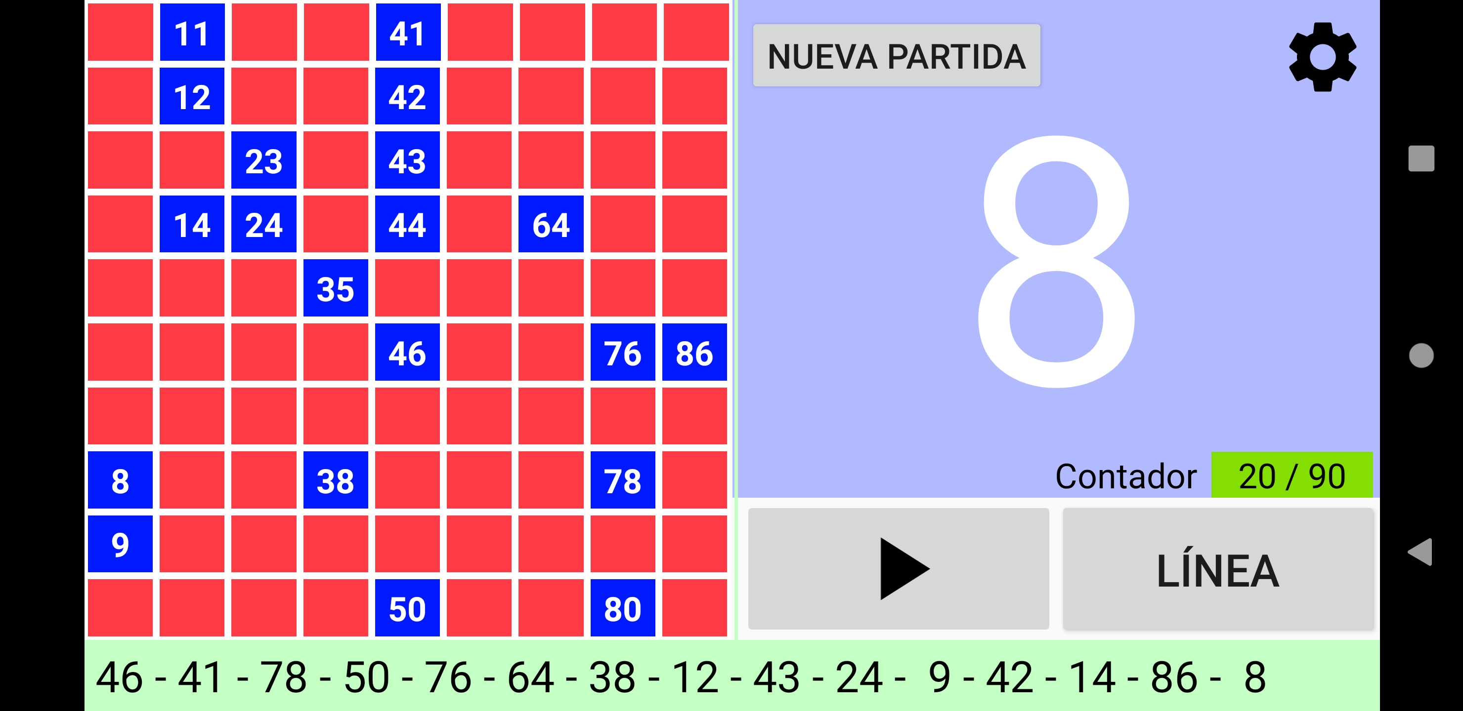 Juego de Bingo Realmente Simple altamente configurable Cuatro modos de juego: Bingo de 90 bolas, Bingo de 80 bolas, Bingo de 75 bolas y Bingo de 30 bolas. Juega fácilmente con la familia o amigos. Funciona en tu Tablet o móvil. Tamaño de los números grande para facilitar la visualización. Imprime tus cartones o utiliza tu dispositivo como cartón con la App Cartones Bingo RS disponible en Google Play Store y ¡qué empiece la diversión! Características configurables: ►Se puede regular la velocidad de la extracción automática de las bolas, o bien extraer las bolas manualmente. ►Se puede activar y desactivar el que cante los números. ►Si se activa el que cante los números, se puede activar y desactivar el que cante los sonidos adicionales como cuando empieza el juego, o se reanuda el juego. ►En Bingo de 80 bolas, si se activa el que cante los números, se puede activar y desactivar que cante el color de la columna del número que ha salido. ►Si los sonidos adicionales están activados, se pueden personalizar todos los mensajes. ►Se puede configurar Bingo RS con tus colores favoritos. ¡Pruébalo! O bien se pueden utilizar los colores por defecto de Bingo RS. ►Se pueden configurar los efectos visuales de aparición de los números en el panel para una rápida localización: efecto visual del texto, y efecto visual del fondo del número que ha salido. ►Se puede elegir si se muestran todos los números en panel y se destaca el número que ha salido, o solo se muestran los números que han salido. ►Se puede elegir si el número que ha salido se destaca en negrita. ►En la configuración de Bingo de 75 bolas, además se pueden activar y desactivar los efectos visuales de las letras BINGO del panel: efecto visual de la letra y efecto visual del fondo de la letra correspondiente al número que ha salido. ►En la configuración de Bingo de 75 bolas, se pueden gestionar los patrones del juego: se pueden añadir patrones personalizados, editar y borrar. ►Se puede configurar si se muestran colores, o no, en el contador de números salidos. ►Se puede elegir el que el contador de números salidos sea creciente o decreciente. ►En Bingo de 75 bolas se puede ganar cantando Bingo, y opcionalmente cantando línea. ►En Bingo de 75 bolas se puede elegir entre jugar un patrón aleatorio, o elegir uno manualmente. ►En Bingo de 80 bolas se puede ganar cantando Bingo, y opcionalmente cantando 1 línea, 2 líneas, 3 líneas, las 4 esquinas o los 4 números del centro. ►En Bingo de 30 bolas se puede ganar cantando Bingo, y opcionalmente cantando línea, columna o diagonal. ►Opción de repetir el número cantado. ►Opción de cantar los números de dos cifras de uno en uno. Por ejemplo: 28 dos-ocho. ►En Bingo de 75 bolas si se elige cantar los números de dos cifras de uno en uno, se puede elegir entre cantar o no la letra de B-I-N-G-O delante de las dos cifras. ►Opción de mostrar la cuenta atrás en segundos para sacar la siguiente bola. Se muestra el tiempo numéricamente y gráficamente. Otras características: ►Se puede comprar la versión Premium sin anuncios. En cualquier juego ir a Configuración -> Menú de 3 puntos de la parte superior derecha -> Comprar Premium. ►Cuando el juego está en pausa, se puede desplazar el texto de últimos números hacia la izquierda y derecha, para poder comprobar el orden de salida de todos los números de la partida. ►Bingo RS utiliza el motor de síntesis de voz de Google. Si en el idioma del dispositivo están disponibles varias voces, elije tu voz favorita, y Bingo RS la utilizara. ►Se puede seleccionar una voz distinta a la del dispositivo. NOTA: No todas las voces están disponibles en todos los dispositivos y en todos los idiomas. ►Opción de escanear códigos QR para comprobar de manera rápida y fácil los números de los cartones. Solo funciona con los códigos QR generados por la App Cartones Bingo RS, disponible en Google Play Store. Para poder escanear los códigos QR es necesario conceder permiso de acceso a la cámara.