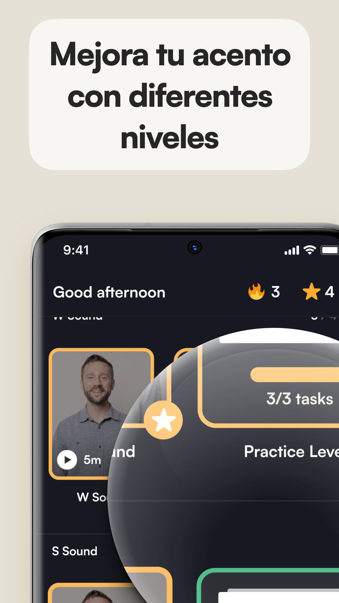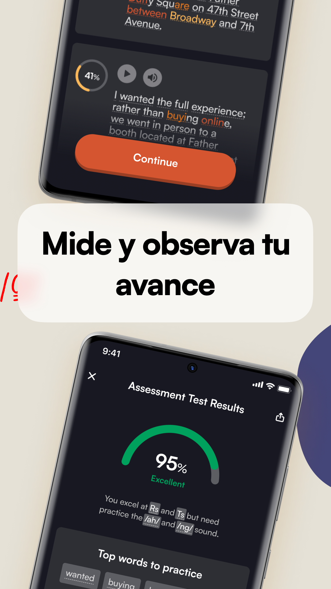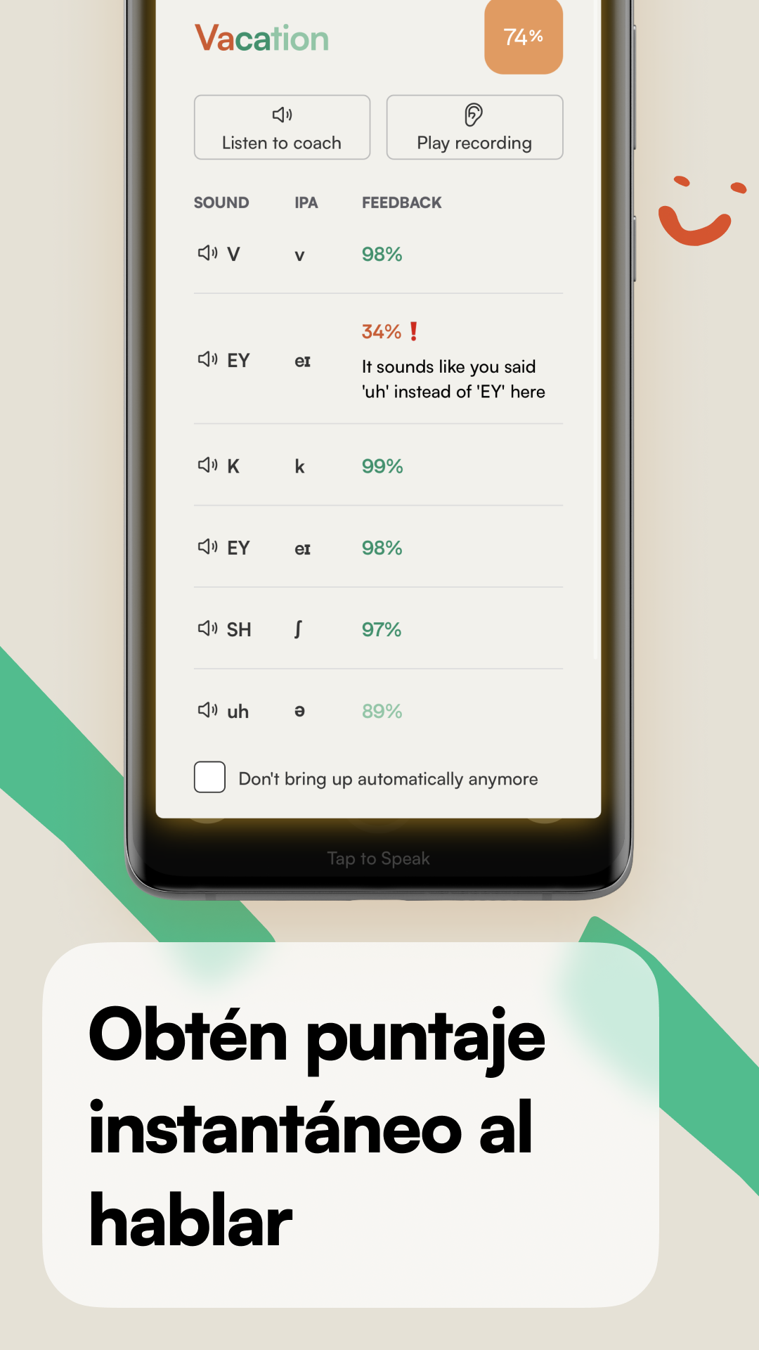 Graba tu voz y nuestra Inteligencia Artificial te puntuará y dará retroalimentación instantánea. Puedes escucharte a ti mismo y comparar tu propia voz con la grabación del coach para refinar aún más tu pronunciación.