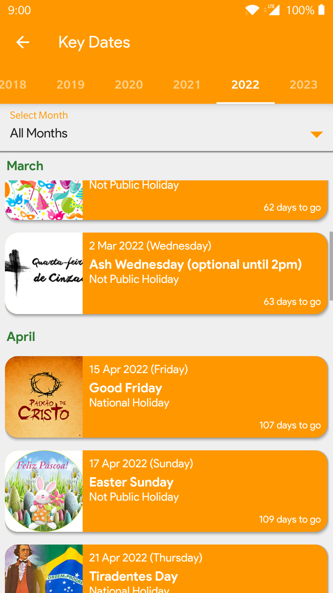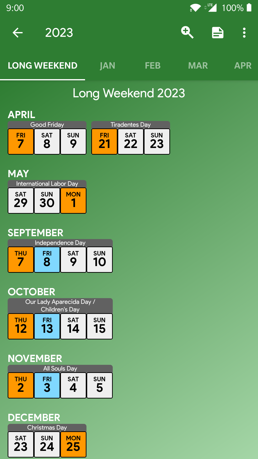 Brasil Calendario 2023 (2018 - 2024) se compone de todas las fechas importantes para los brasileños. Tiene todas las fechas de festivales y eventos culturales. Características: - Días festivos y festivales nacionales de Brasil - Función de recordatorio - Sincroniza con Google Calendar - Calculadora de fecha - Modo interactivo - Función de panorámica y zoom - Notas diarias - Fase lunar - Búsqueda de vuelos - Disponible para el año 2018, 2019, 2020, 2021, 2022, 2023 y 2024 Al instalar y usar esta aplicación, aceptará los Términos de uso (https://bit.ly/2DrbUzi) y la Política de privacidad (https://bit.ly/2qvu4Y1).