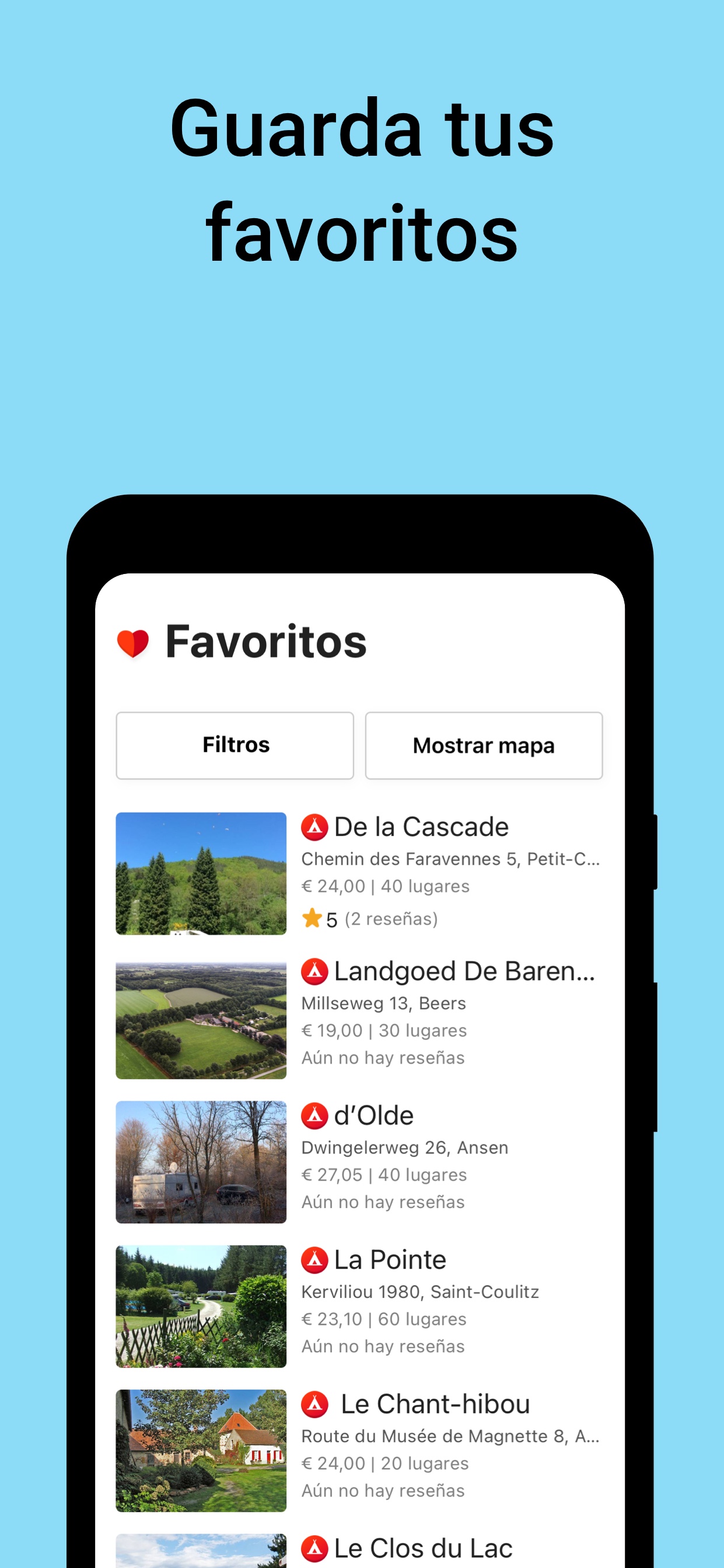 - Guarda lugares favoritos de acampada y planifica tu road trip