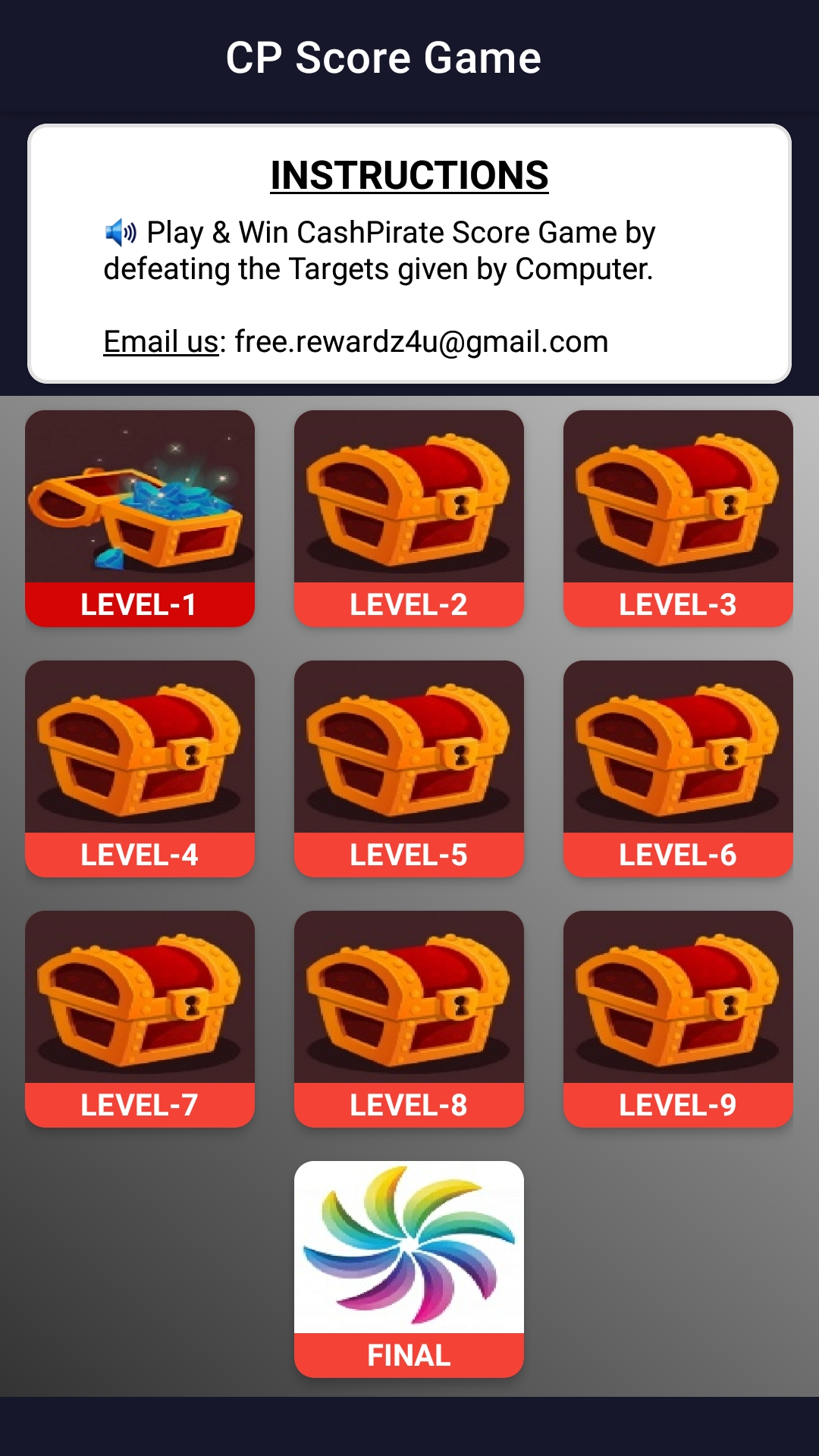Los usuarios de Cashpirate deben tener en cuenta que se trata de juegos gratuitos, una plataforma de cuestionarios y no brinda oportunidades para ganar efectivo de billetera, efectivo de paypal, efectivo de paytm, ganar dinero, ganar dinero, tarjetas de regalo gratis, efectivo gratis, recompensas, monedas de juego como diamantes, gemas, etc. o cualquier otra oportunidad de ganar dinero. Simplemente juegue y diviértase con la aplicación cashpirate, que no genera ganancias, pero es una aplicación de juegos divertida.