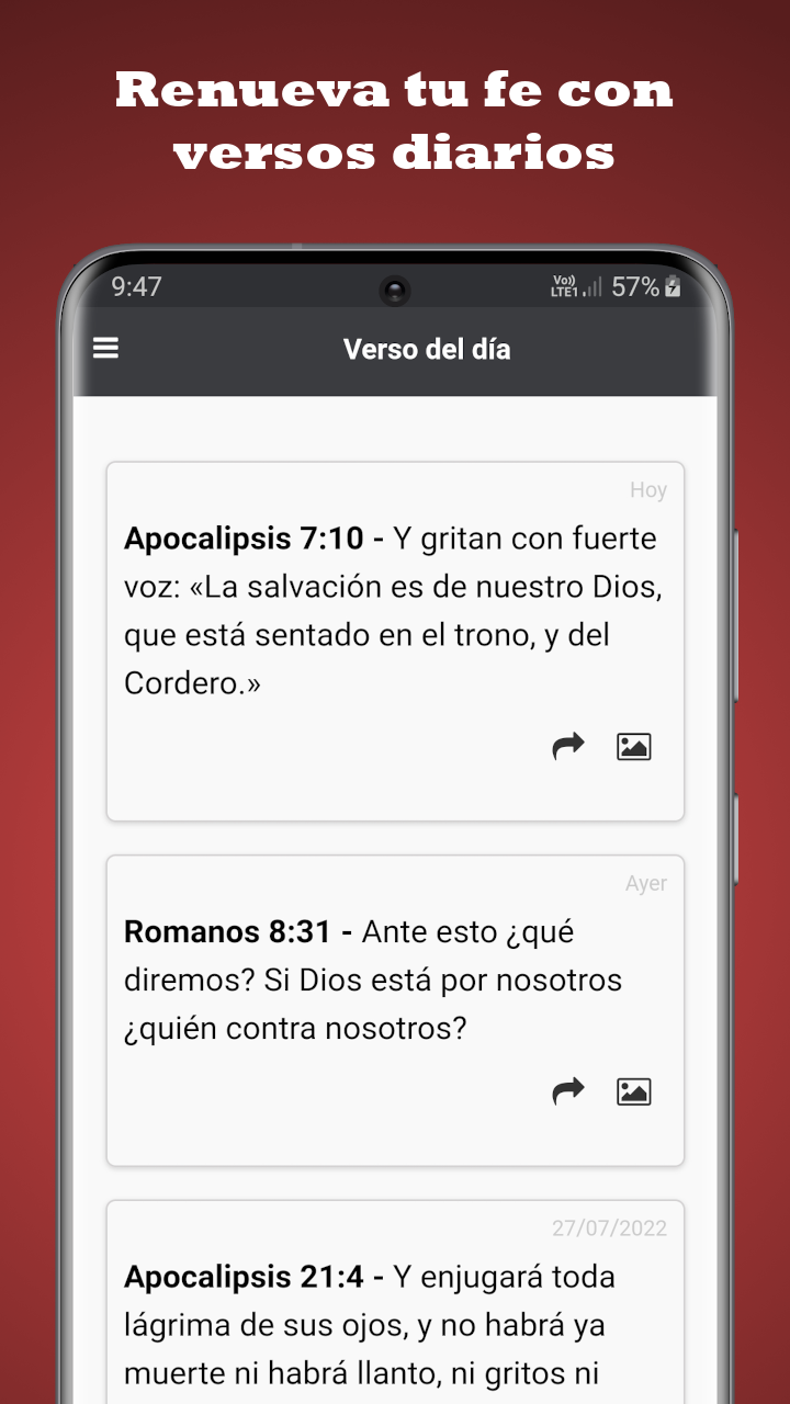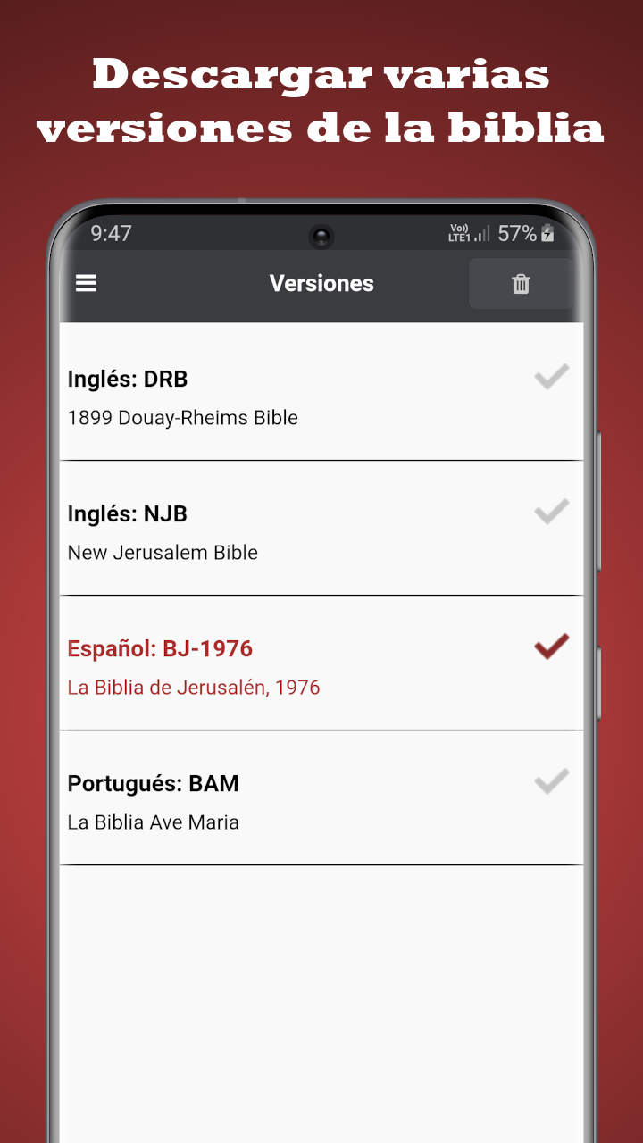 Con la Biblia Católica usted tiene acceso gratuito a la Biblia totalmente offline. Ver las características: - Varias versiones de la Biblia: inglés, español, portugués (New Jerusalem Bible, Biblia de Jerusalen - 1976, Bíblia Ave Maria)... - Versículo del día - Búsqueda de versículos - Versículos favoritos - Anotaciones Personales - Compartir los versículos en las redes sociales (Facebook, Whatsapp, Twitter ...) - Opción para cambiar el tamaño de fuente, color, poner modo nocturno y pantalla completa. - Antiguo y Nuevo Testamento - La Biblia con acceso completamente fuera de línea - ¡Es mucho más! La Biblia Católica es ideal para todo católico que desea llevar la palabra de Dios a todo lugar.