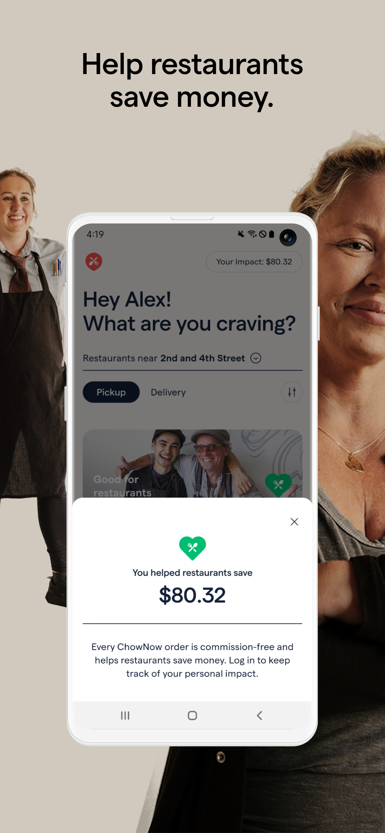ChowNow hace comida para llevar de manera diferente. No creemos en cobrar tarifas absurdas, a usted, a nuestros comensales o a nuestros socios de restaurantes. Otras aplicaciones de entrega golpean a los restaurantes con comisiones de hasta el 40% en cada pedido. No ChowNow: cuando haces un pedido con nosotros, todos ganan. Porque la comida para llevar justa sabe mejor.