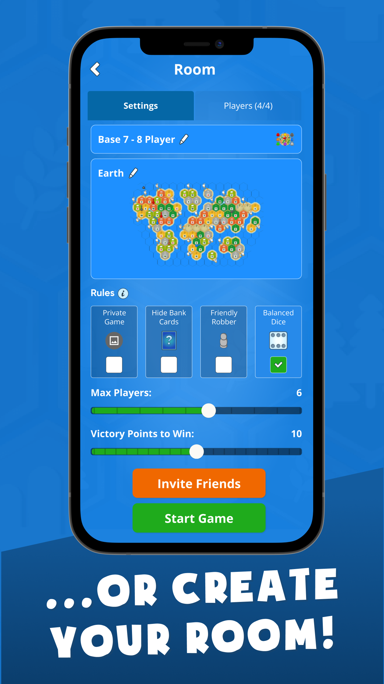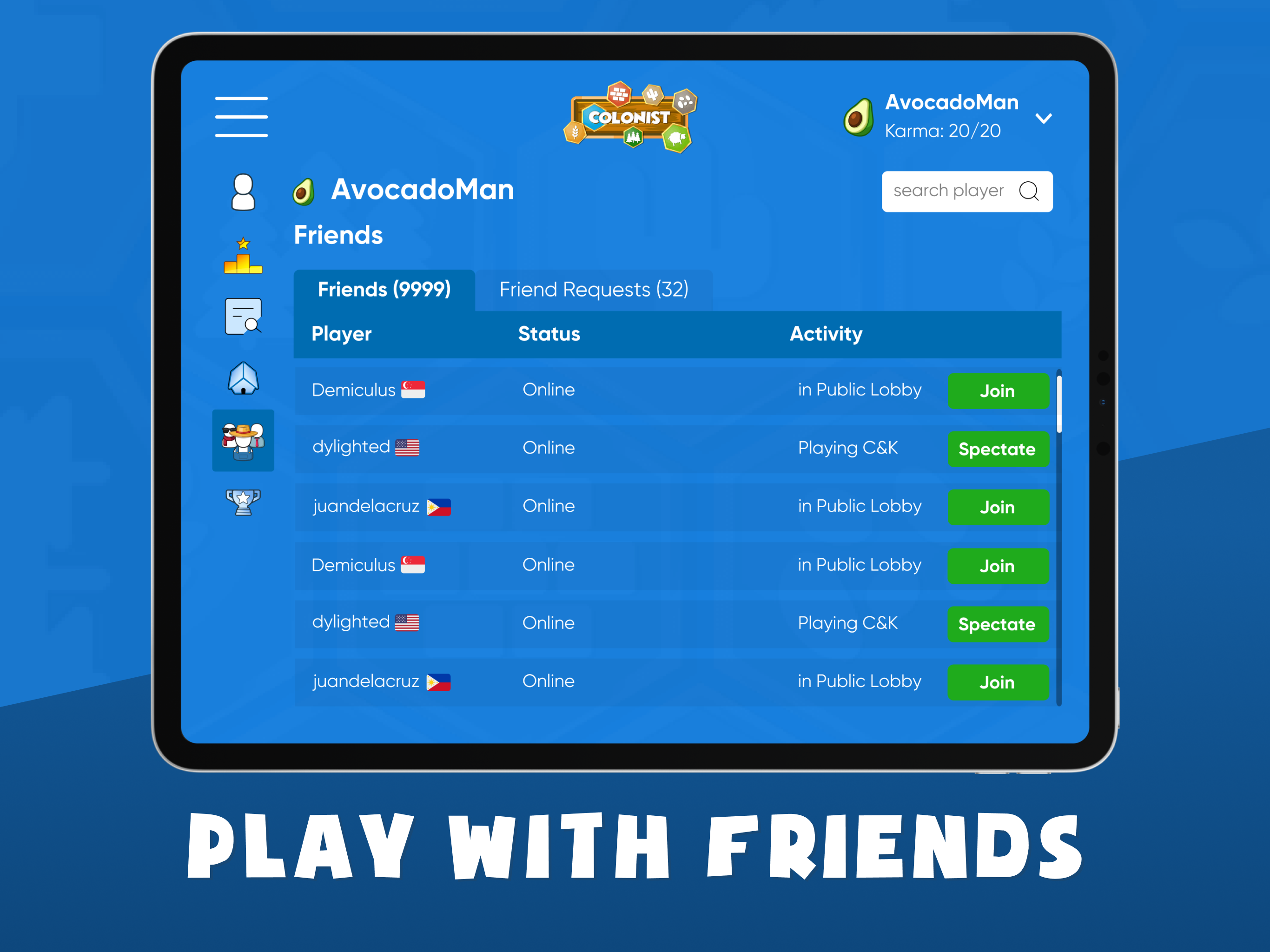 Colonist es una alternativa gratuita en línea al desafiante juego de mesa social y de estrategia Settlers of Catan. Asume el papel de un colono construyendo asentamientos y expandiendo su territorio. Colonist combina reglas extremadamente simples con un juego tremendamente profundo. Usa la estrategia, la planificación y la negociación astuta para ganar. ¡Puedes entrenar contra bots, jugar con amigos en línea e incluso competir en nuestro modo clasificado por un lugar en la tabla de posiciones! También ofrecemos una variedad de divertidos mapas personalizados para jugar, además de las expansiones tradicionales como Ciudades y Caballeros y Navegantes. Incluso puedes jugar con más de 4 amigos con nuestras expansiones para 5-6 y 7-8 jugadores. En la tienda, encontrarás una amplia gama de colores y avatares personalizados que te permiten personalizar tu perfil y presumir. ¡Elige una combinación única de color y avatar para infundir miedo en tus oponentes!
