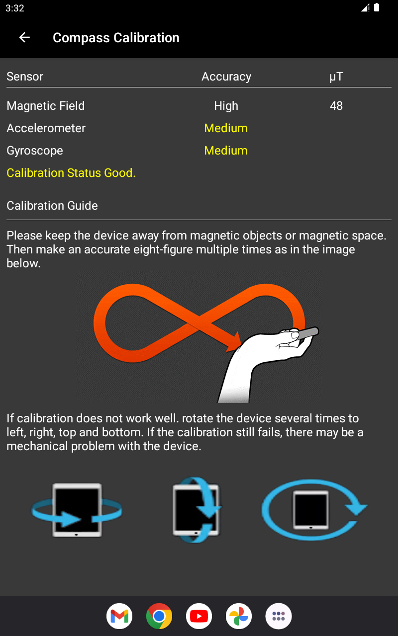 Esta brújula digital utiliza el giroscopio, el acelerador, el magnetómetro y los sensores de gravedad de su dispositivo. Asegúrese de que su dispositivo tenga al menos los sensores del acelerador y del magnetómetro para el correcto funcionamiento de la brújula.