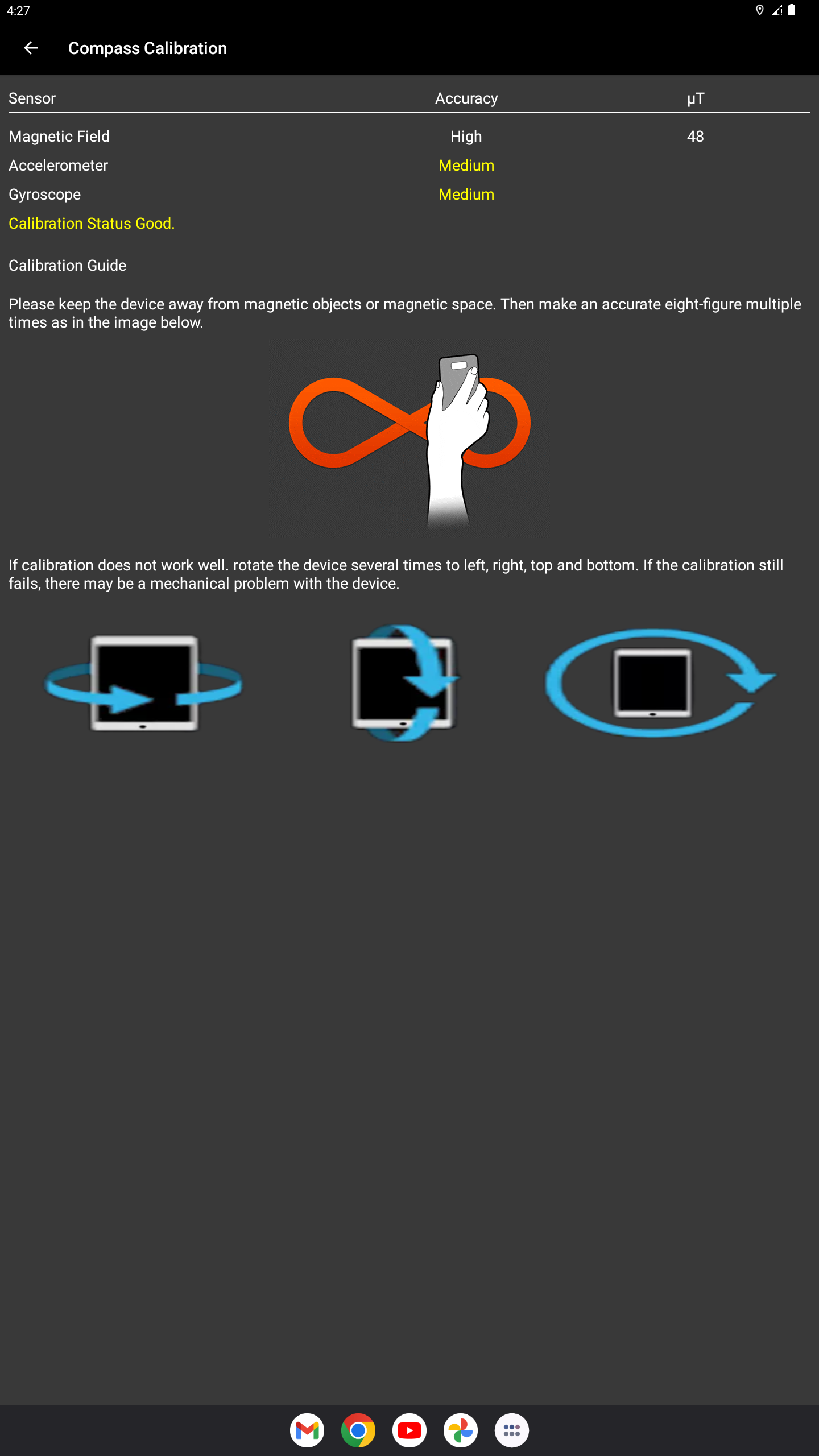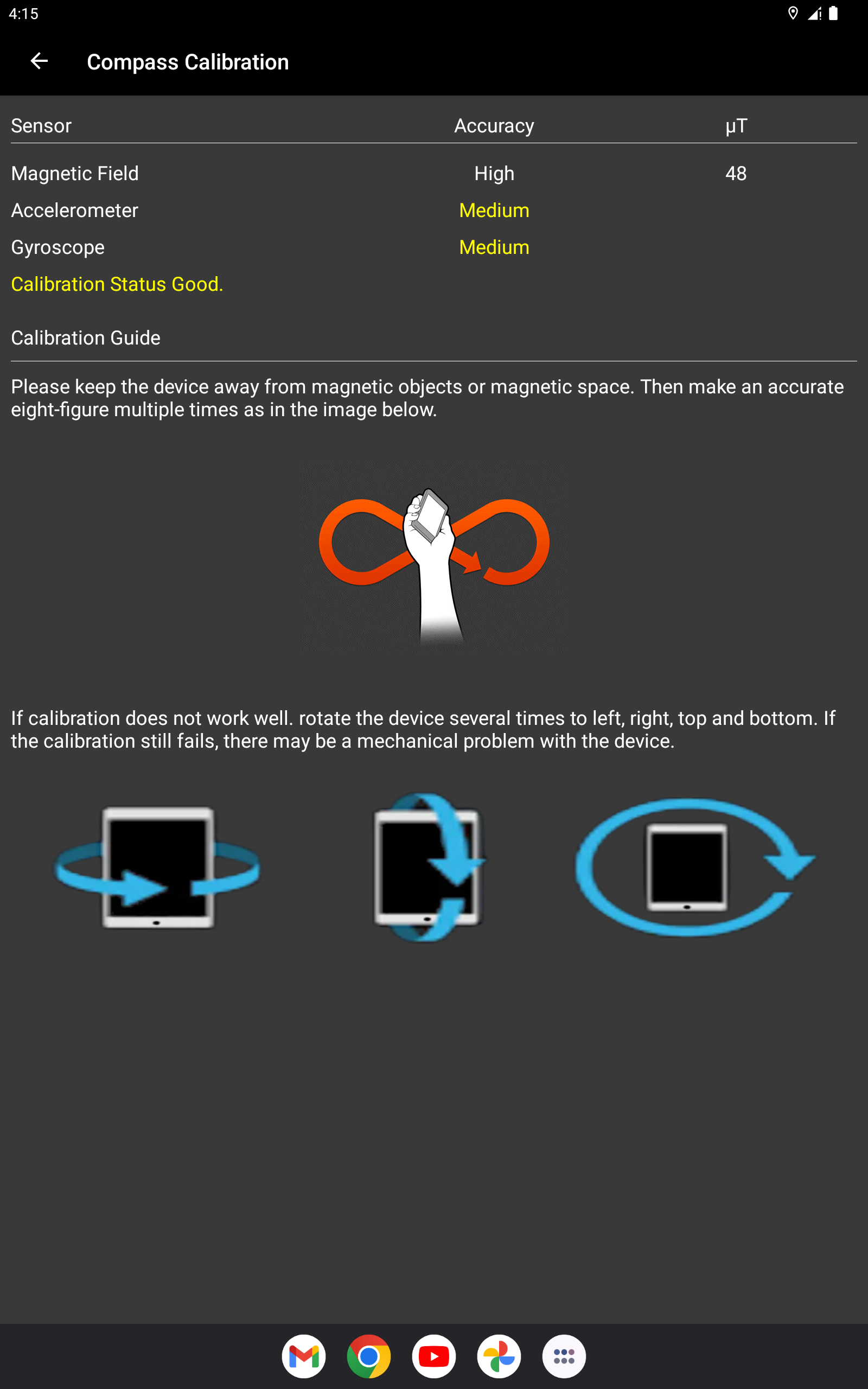* Si encuentra errores de dirección, calibre su teléfono agitándolo en forma de 8, dos o tres veces o calibre el dispositivo volteando y moviendo el teléfono hacia atrás