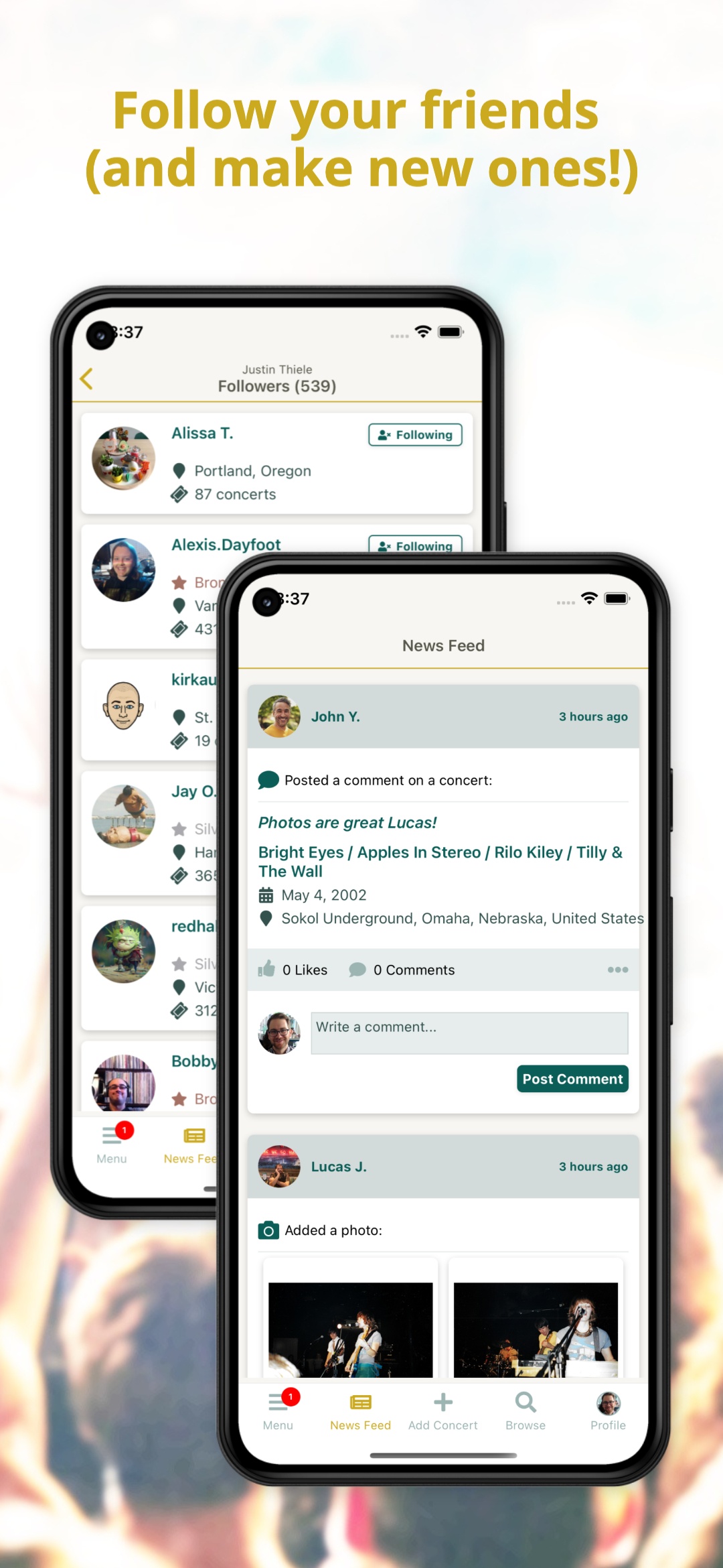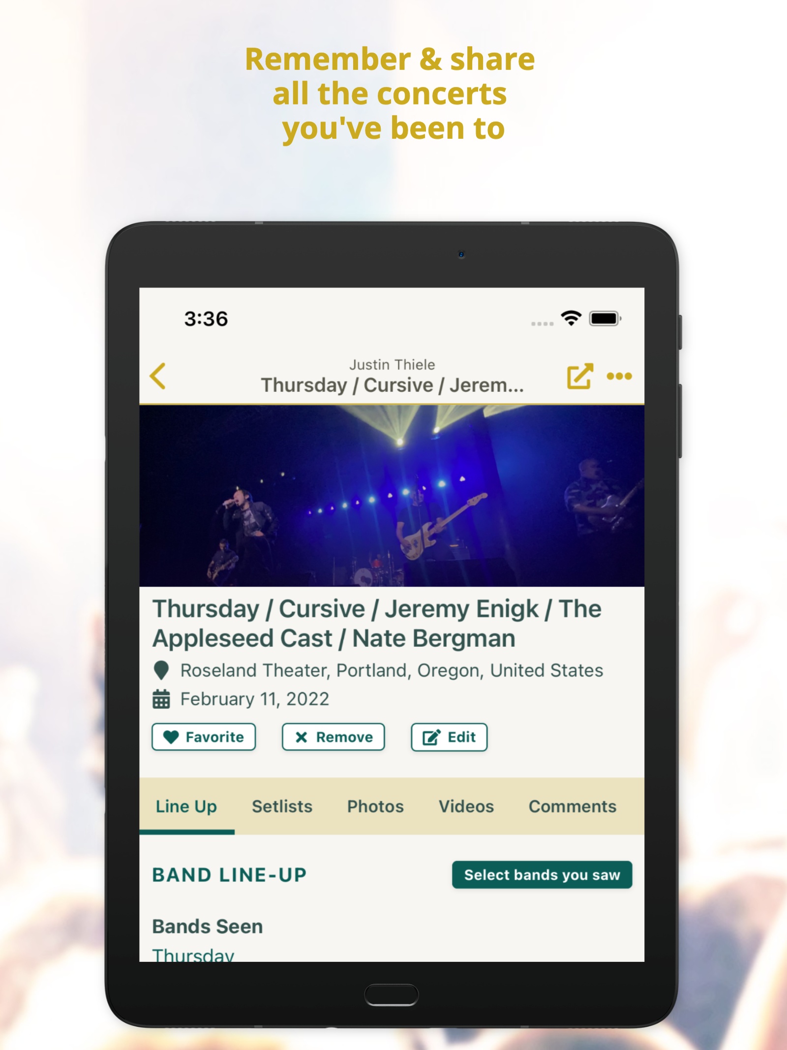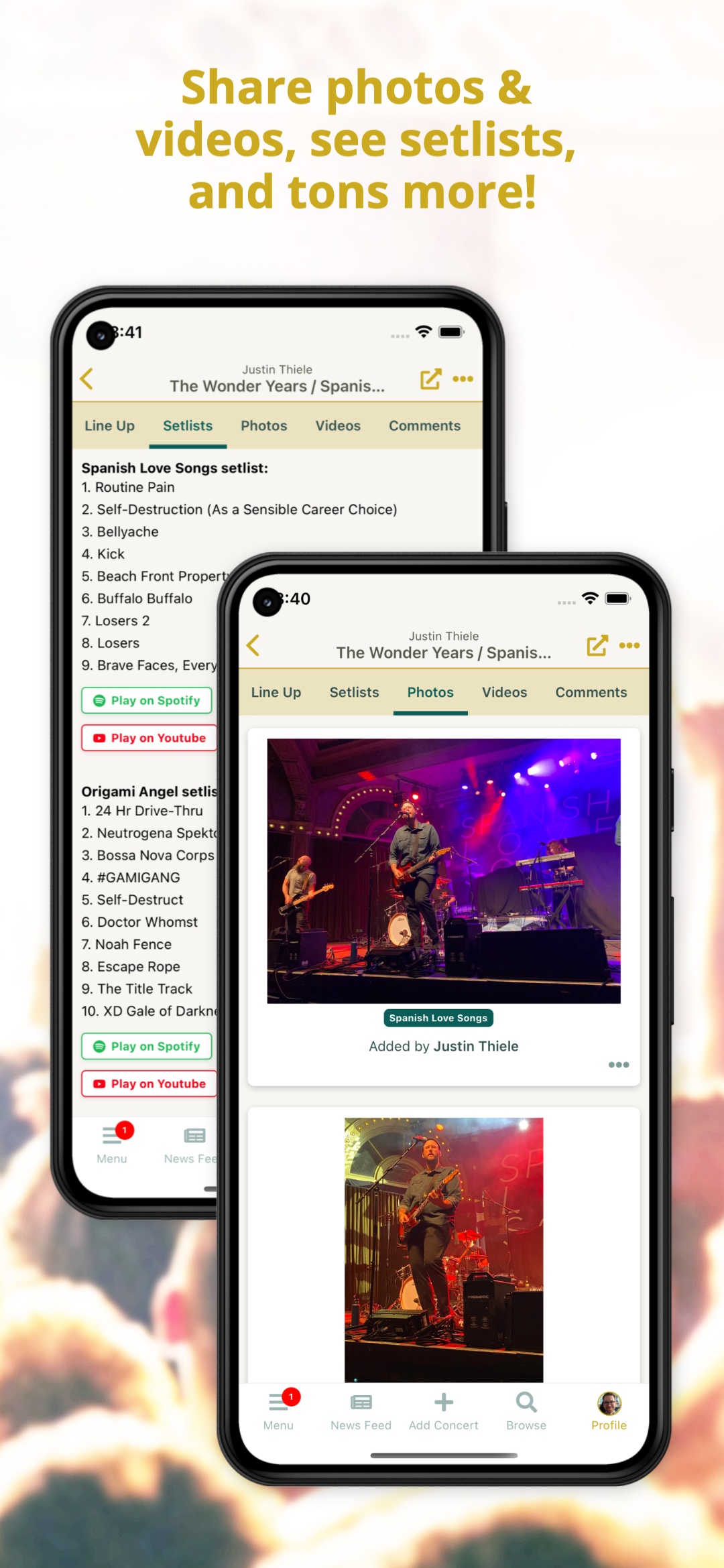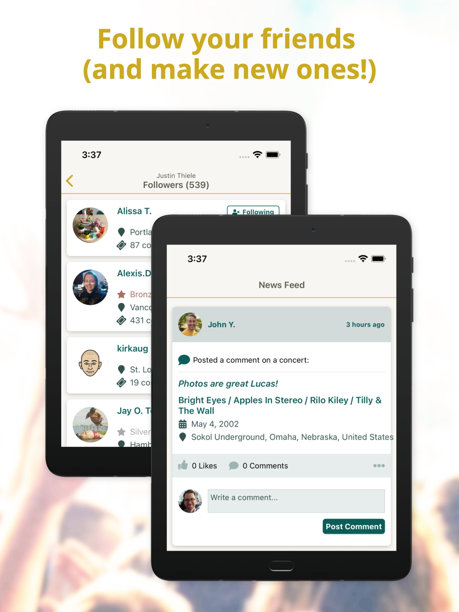 Concert Archives es la red social y el diario para los amantes de los conciertos. Es la base de datos de referencia para recordar y compartir todos los conciertos en los que has estado. • Tu agenda de conciertos: añade todos los conciertos y festivales en los que has estado. Cargue fotos/videos, guarde notas, realice un seguimiento de sus favoritos y cree una futura lista de deseos. • Comparte la experiencia: mira fotos y videos de otras personas en el concierto y comparte los tuyos. Incluso ver las listas de canciones que tocaron las bandas. • Seguir amigos (¡y crear nuevos!) Ver su historial de conciertos, fotos/videos, conciertos favoritos, lista de deseos y más. • Obtenga notificaciones de flashback: reciba pequeños recordatorios sobre sus conciertos anteriores ("Hace 3 años que vio...") • Y mucho más... ¡Estás en buena compañía! A los fanáticos de la música les encanta Concert Archives desde que lanzamos en 2013 y hemos aparecido en Alternative Press, Stereogum, Glamour, Mic, Bustle y muchos más. ¿Errores o comentarios? Envíenos un correo electrónico: [email protected]