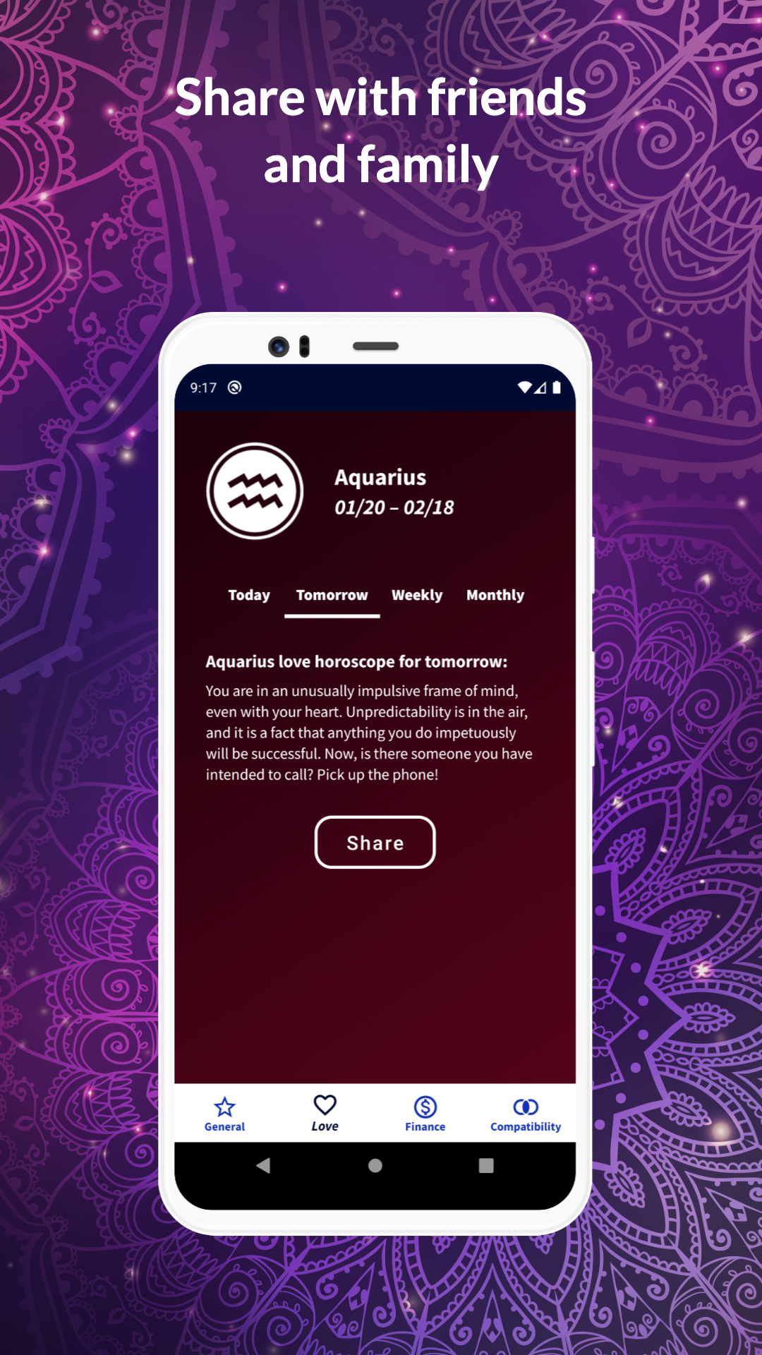 ★ Comparta las predicciones del horóscopo y los resultados de compatibilidad de los signos del zodíaco en Facebook, WhatsApp, Messenger, Instagram, Telegram y más.