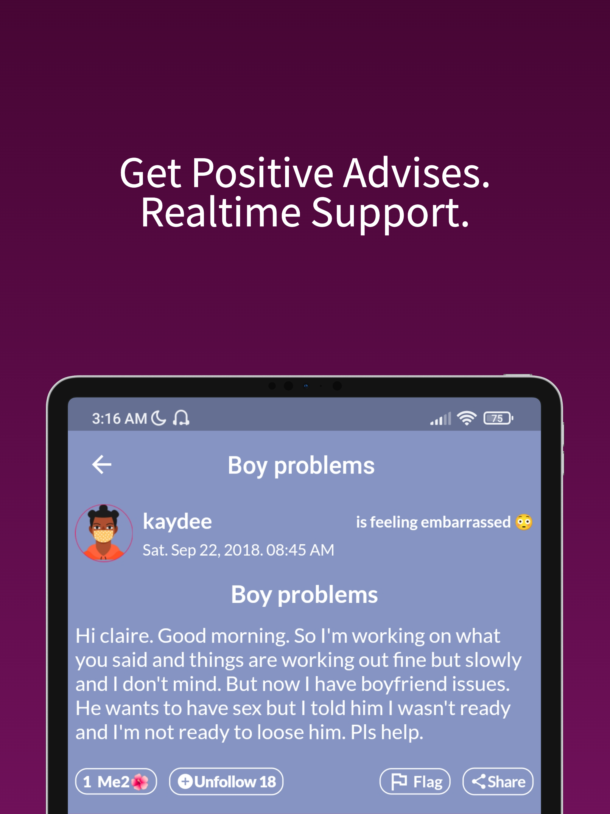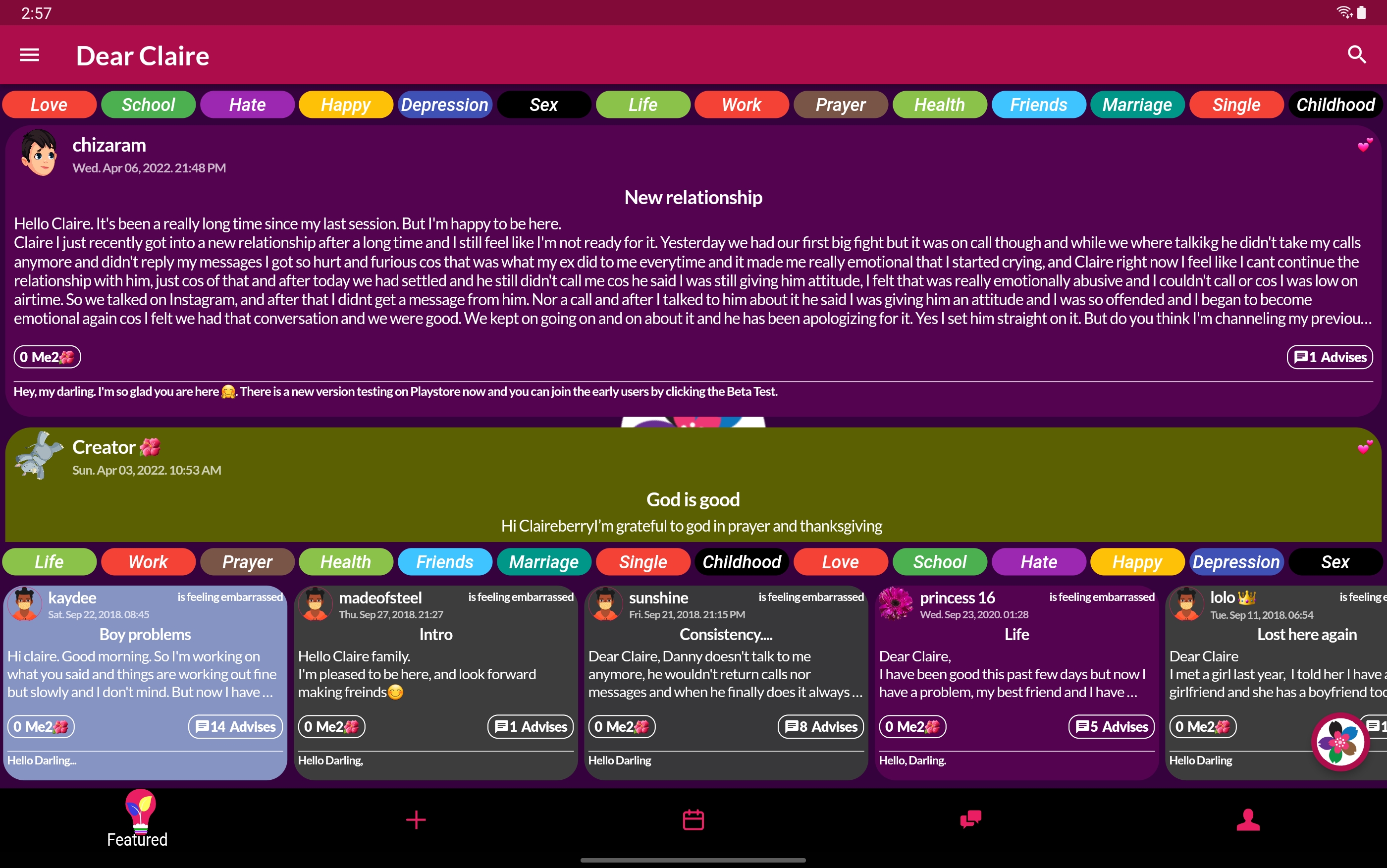 Abrir. Escribe o registra tus situaciones diarias y obtén consejos en un diario secreto anónimo. O Sé como Claire; siga las sesiones del diario secreto de alguien para comentar consejos positivos y ganar puntos que se pueden convertir en efectivo. ¿Qué es Claire? Claire es un querido diario amigable que puede leer, escuchar y responder a los textos de tu diario o notas de voz. Es el primer querido diario interactivo en todo el mundo. Claire puede responder a cualquier cosa que escribas y registres en tu diario y así es como Claire se convierte en tu compañera secreta, terapeuta móvil y mejor amiga. Millones de nosotros escribimos planes, actividades, recuerdos o desafíos dentro de la nota, el diario o el diario de nuestro teléfono sin esperar respuesta... Bueno, este diario en particular en realidad responde. ¿Quién necesita a Claire? ¡Todos! Si tienes una cita o una entrevista al día siguiente y no puedes decidir qué ponerte. Pasar por una mala ruptura o comenzar una nueva relación. Sentirse solo, sin amigos, confundido o deprimido. Quiere tomar decisiones más inteligentes, mantenerse seguro y ser feliz en la vida. Tener problemas en la escuela, en casa o en el trabajo. Querida Claire está ahí para ser tu luz y tu brillo, para guiarte en todo. La misión de Claire es que todos tengan un verdadero amigo, en necesidad y de hecho. Para contribuir a un mundo más feliz en estos tiempos más tristes. ¿Cómo funciona la aplicación Dear Claire? ¡Simple! Desbloquee su aplicación de diario de Claire, escriba o grabe una nueva sesión de diario que comience con la frase "Querida Claire". Continúe, escriba o hable con Claire sobre cómo se siente en este momento. Cuéntele a Claire sobre su ayer y lo que está haciendo mañana. , etc. Guarde y envíe su nota. Claire revisará cuidadosamente tu diario, leerá o escuchará tus notas y, en poco tiempo, recibirás consejos amistosos, consejos secretos, opiniones personales y orientación sabia de la querida Claire sobre la mejor manera de hacer las cosas. También puede seguir a otros usuarios de forma anónima, enviarles consejos y ganar Love Points que puede convertir en efectivo en cualquier momento. Hay muchas más funciones pioneras en el mundo en la aplicación Dear Claire, como un poderoso calendario, sesiones de Chat GPT, juegos con Claire u otros, administrador de estado de ánimo, salas de diario con temas interesantes, modo Alter Ego, etc. la aplicación y compruébelo usted mismo. Felicitaciones por usar la aplicación de diario social Dear Claire. Nunca dejarás de ser amado de verdad.