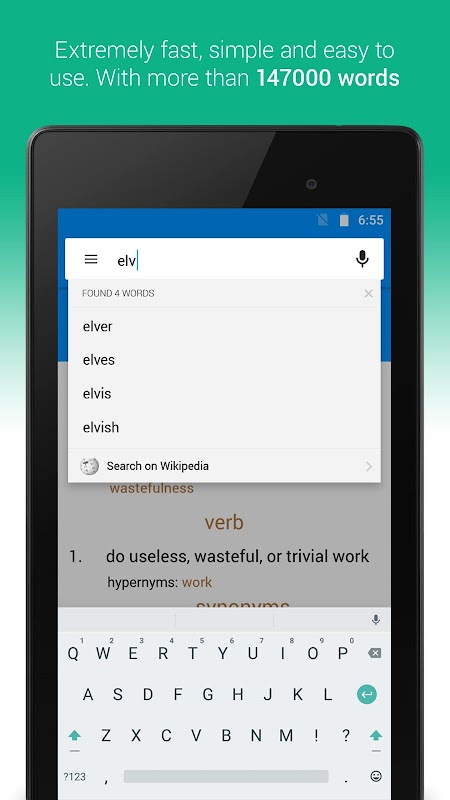 Se encontró con una nueva palabra fascinante al leer un clásico Inglés? Escribir un artículo y buscar un sinónimo más sofisticada para una palabra bastante simple? Pegado a su crucigrama? Diccionario + está aquí con todas las respuestas! Diccionario + es su libre Inglés diccionario y tesauro derecho en el dispositivo Android. Este diccionario offline / tesauro le ofrece el significado de las palabras en inglés, junto con sus sinónimos, antónimos, ejemplos de uso, sugerencias de ortografía y más! Todas estas características hacen Diccionario + una herramienta muy útil para una referencia rápida, mirando definiciones, ortografía, palabras similares y relacionados y ayudan a mejorar su vocabulario Inglés. Características del diccionario: + • extremadamente rápida, simple y fácil de usar • Más de 147 mil palabras • Este diccionario / tesauro funciona sin conexión a Internet (sin conexión) • Utilice este tesauro para buscar sinónimos, antónimos, hiperónimos (les específica), hipónimos (más específico), merónimos (parte de) y mucho más! • Oraciones de ejemplo para ayudarle a entender el significado contextual de una palabra en particular • Una entrada de palabra inteligente que sugiere posibles palabras y la ortografía correcta a medida que escribe • Utilice el? comodín para cualquier carácter o * para un grupo de personajes en la búsqueda • Buscar la página de Wikipedia de una palabra y la búsqueda de los artículos de Wikipedia relacionados sobre palabras directamente desde la aplicación. • Guarde sus nuevas palabras más usadas o interesantes como marcadores • Lleve un registro de las palabras más recientes que he admirado en el actual período de sesiones, con la opción de la historia reciente • Con base en el Proyecto de la Universidad de Princeton WordNet. Tanto si eres un escritor, profesor, estudiante o simplemente alguien con una pasión por el idioma Inglés, de este Diccionario offline aplicación gratuita es un diccionario de sinónimos de bolsillo que le encantaría poseer! Obtener esta offline gratis Diccionario Inglés y Tesauro ahora y aprender nuevas palabras, las definiciones y la ortografía on-the-go! Este diccionario Inglés en línea gratuito y tesauro cuenta con más de 147.000 palabras con sus sinónimos, antónimos, definiciones y más. Este diccionario Inglés y tesauro es una gran herramienta para la referencia, la educación y la construcción de vocabulario. La entrada de palabra inteligente sugiere posibles ortografía correcta a medida que escribe, así como una lista otras palabras posibles. Lleve un registro de las palabras más recientes que he admirado en el actual período de sesiones, con la opción de la historia reciente. Simplemente haga clic en las flechas izquierda o derecha y la definición del diccionario para sus previamente PALABRAS se muestran. Aprender nuevas palabras, la ortografía, definiciones y mejorar su vocabulario Inglés con esta offline gratis Diccionario Inglés y Tesauro. La integración Wikipedia hace que sea fácil de buscar definiciones e información detallada acerca de la palabra Inglés o frase. También puede realizar un seguimiento de sus palabras favoritas o nuevas palabras interesantes por bookmarking ellos. Ahora usted no tiene que llevar un diccionario de bolsillo o abrir su navegador de Internet cada vez que necesite un sinónimo de una palabra en Inglés. Sólo tiene que abrir esta offline gratis diccionario y tesauro y buscar sinónimos, antónimos, definiciones y más en cualquier momento y en cualquier lugar. Opiniones de usuarios sobre Diccionario +: "Vale la pena el dinero, muy detallado y un vocabulario amplio distancia. Gran trabajo ".