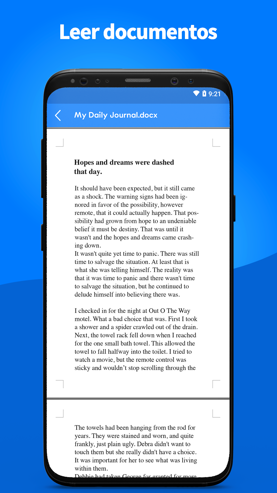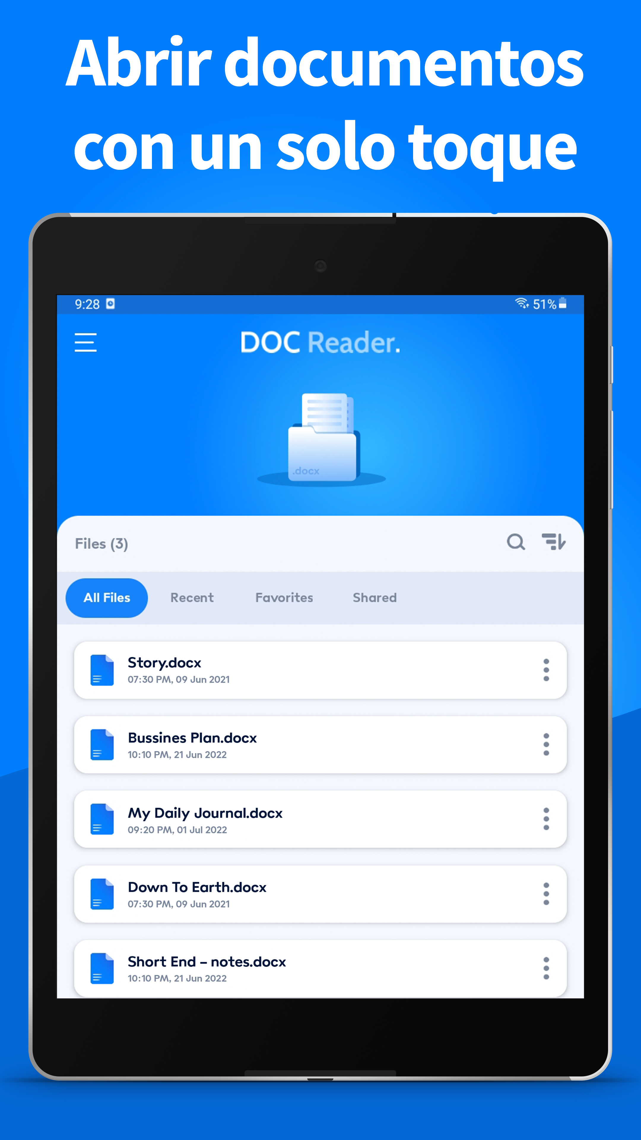 Doc Reader es una poderosa herramienta para leer diferentes documentos de oficina como word, doc, docx y muchos más. Es una aplicación de visualización de archivos sencilla, rápida y ligera con muchas opciones. Gestiona tus documentos con un solo toque, incluso sin conexión a Internet directamente en tu dispositivo móvil. Nuestra aplicación está diseñada para ser una solución universal que funciona con todo tipo de documentos: Docx, Word, Excel, PDF, PPT, TXT, etc. Nos preguntamos: "¿qué debe hacer la aplicación universal y qué funciones debe tener?". No queremos que tengas que ir saltando de pestaña en pestaña para leer o ver archivos en una aplicación separada de "apertura de archivos XLSX o docx". Queremos ofrecerte la comodidad de leer cualquier documento sin tener que resolver los rompecabezas de cómo debes hacerlo en tu dispositivo. ¿Necesitas leer archivos de MS Word o PDF? Aquí tienes. ¿Necesitas abrir una tabla de Excel? No hay problema, ¡sólo tiene que encontrarla y editarla! ¡Lo tenemos todo empaquetado en un solo producto! Así pues, veamos la versión resumida de nuestras ventajas: • Una aplicación que tiene todo lo que necesitas con respecto a los archivos de MS Office • Funciona con docx, pdf, ppt, pptx, xlsx, txt y muchos más • Lector de archivos Doc y PDF • Visor de Excel y Word • Busca rápidamente tus archivos docx • Evita la necesidad de cambiar de aplicación • Te permite trabajar con documentos de MS más rápidamente • Comparte documentos con tus amigos y colegas • Todas las opciones necesarias como renombrar, borrar, compartir, etc. • Puedes utilizarlo para trabajar con documentos sin conexión Si quieres olvidarte de trabajar con decenas de aplicaciones simultáneamente sólo para leer y trabajar con diferentes archivos, entonces descarga esta aplicación. Con nuestra aplicación, ¡será sencillo para ti! Rápido, cómodo y con todas las funciones que quieras, ¿qué más necesitamos? Esta aplicación de visor de archivos es totalmente compatible con los archivos de Word Office, incluyendo archivos de Word, Excel y Docx. Formatos de documentos compatibles: • Documento de Word: DOC, DOCX, DOCS • Documento de Excel: XLS, XLSX • Documento de presentación / diapositiva: PPT, PPTX, PPS, PPSX • Otros lectores y archivos de Word Office: TXT