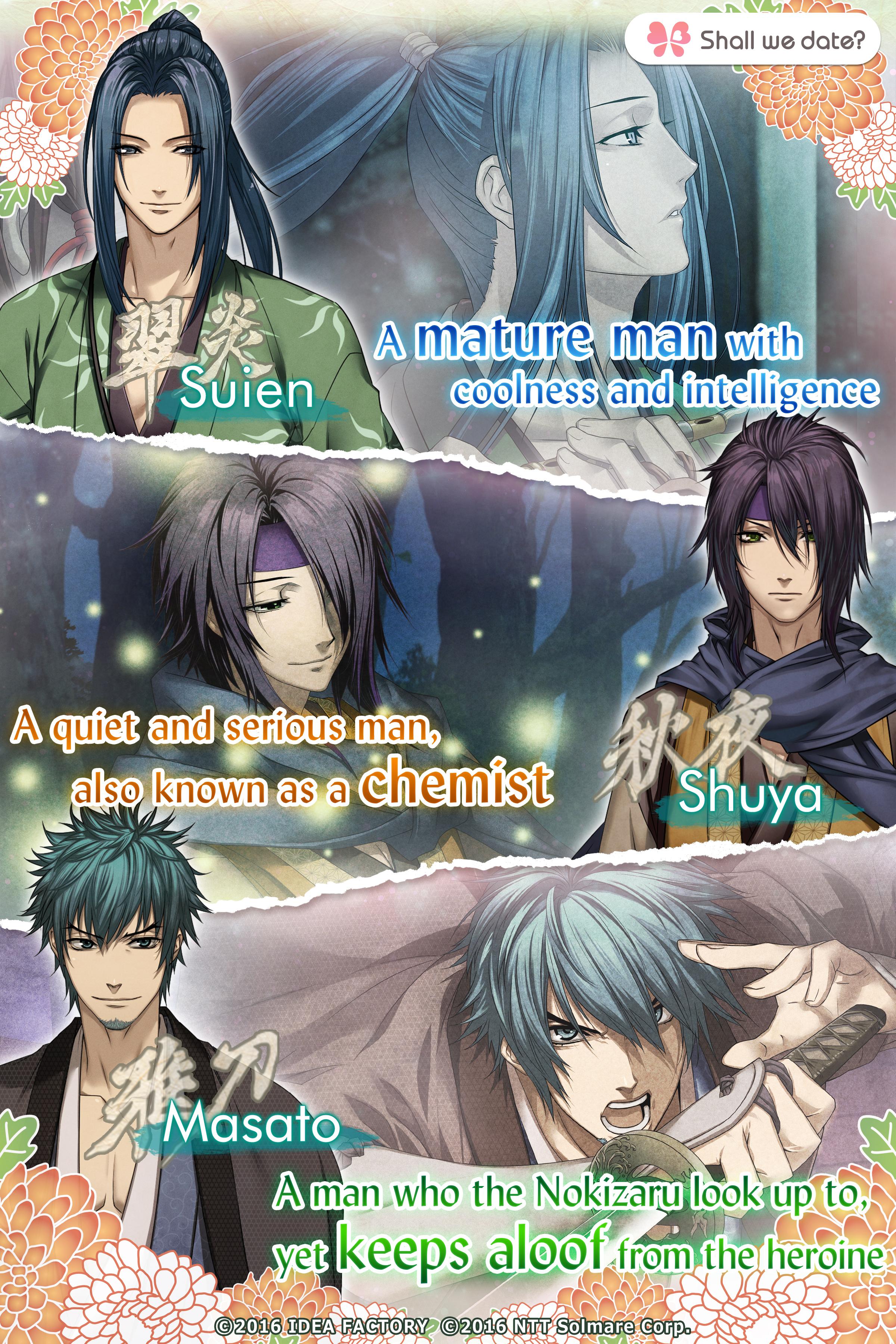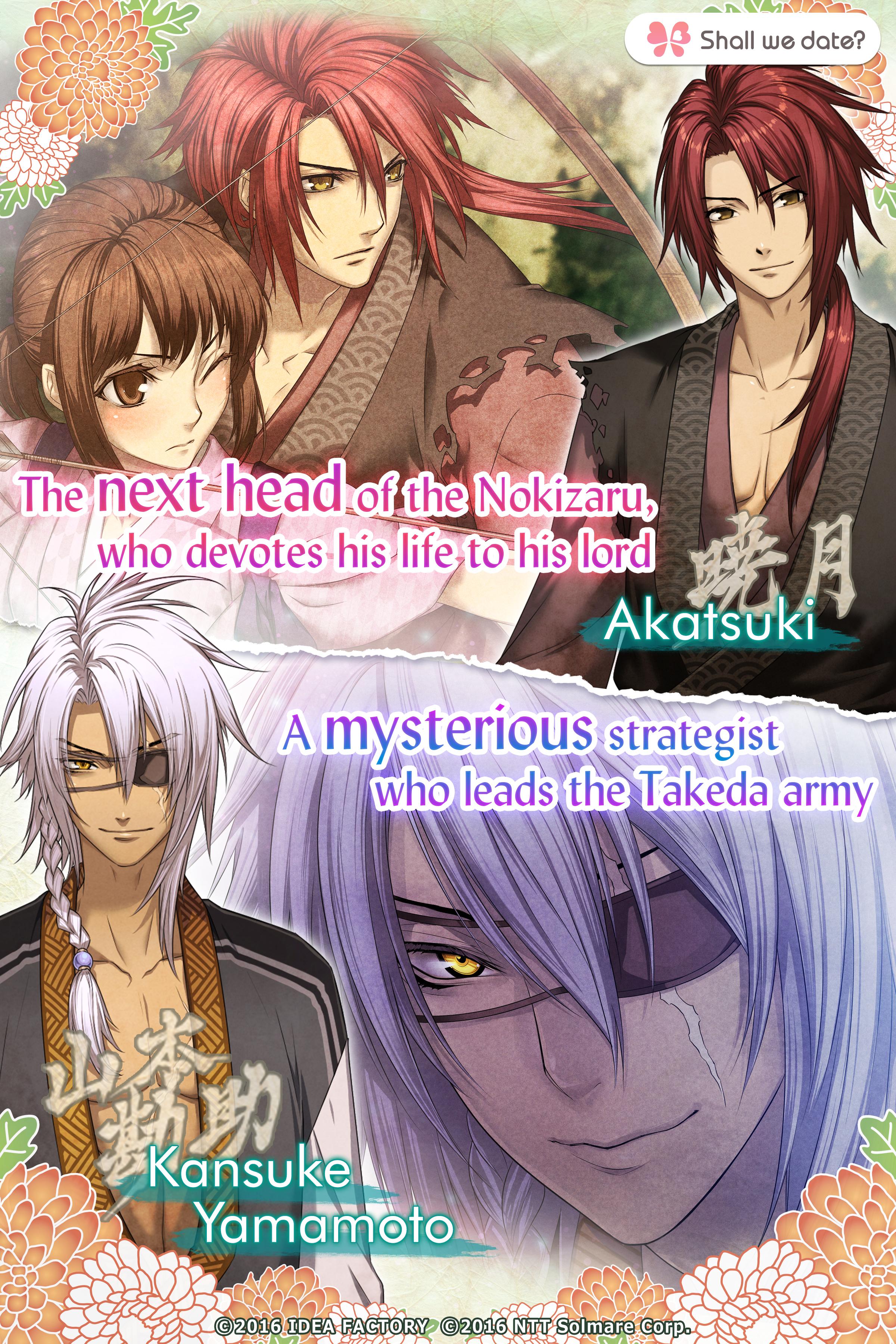 Dear Android Q Users, This application asks a permission to access your device storage when you first open the app, as this is the way to save your progress and data. We would never use your personal data for any purposes. The heroine is an ordinary student. One day, she finds herself got thrown back in time to an old era, about 500 years before, known as the “Warring States” period. She meets ninjas who are fighting and risking their lives in major battles. A bitter-sweet story of love beyond time found between the heroine and the ninjas is now about to begin!! 1. Story Introduction The heroine of this story is an average student and a member of her school’s archery club. In a sudden twist of fate, she finds herself leaving her uneventful life behind, being thrown headlong through time to medieval Japan. In this time, known as the “Warring States” period, continued civil war ravages with no end in sight. She appears in this time right at the feet of Masatora Uesugi, later known as Kenshin Uesugi. Masatora takes an interest in her bizarre clothes and way of talking, brings her back to Kasugayama Castle and places her under guard of the “Nokizaru”, a unit of ninjas. Although life in this war-torn era is not something she has ever expected up until now, she does her best to stay positive. She finds a place for herself by connecting with the people around her, eventually understanding and feeling the importance of the bond with them. 2. Characters *Akatsuki (Nokizaru): The prospective head of the Nokizaru. He sounds overbearing, yet is straightforward and considerate in nature. He cares about his comrades, and once he trusts someone, he takes care of him or her for life. *Suien (Nokizaru): A man with a laid-back personality who is kind to anyone. He loves playing the flute, and teaches his knowledge to children. *Shuya (Nokizaru): A man of few words. With a dead-serious personality, he places orders before all else, yet takes good care of the younger ones. He also plays an important part as a chemist. *Masato (Nokizaru): He is a strong and skilled man above all, and is acknowledged by others. Ever since he first met the heroine, he somehow places a distance between himself and her. *Yataro Kojima (Captain of the foot guard of the Echigo Army): A massive man who serves Masatora from a young age. He is friendly and watches over the heroine along with his younger sister, Princess Aya. *Kanehisa Togi (The former master of Nokizaru): A man with a very strict personality. Only partially retired, he continues to assist the young Nokizaru. All of them stand in awe and respect him. *Kansuke Yamamoto (A strategist of the Takeda Army): A man of mystery. Although he serves Shingen Takeda for many years, he looks ageless. He takes an interest in the heroine and tries to approach her. *Rurimaru (Nokizaru): A bright and energetic boy, loved by everyone. He is not skilled enough yet, and is treated like a younger brother by others. He gets along well with the heroine like brother and sister. 3.FOLLOW US facebook.com/ShallWeDate.NTTSolmare (Don’t forget to LIKE us if you enjoy our games!) youtube.com/user/ShallWeDate 4.ABOUT US Thank you very much for your interest and downloading our games! NTT Solmare is a game company especially focusing on bringing Japanese visual novels and Otome games to the world! We sincerely hope you enjoy our games and give us feedback!