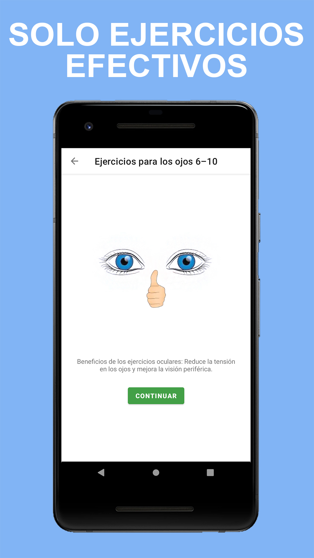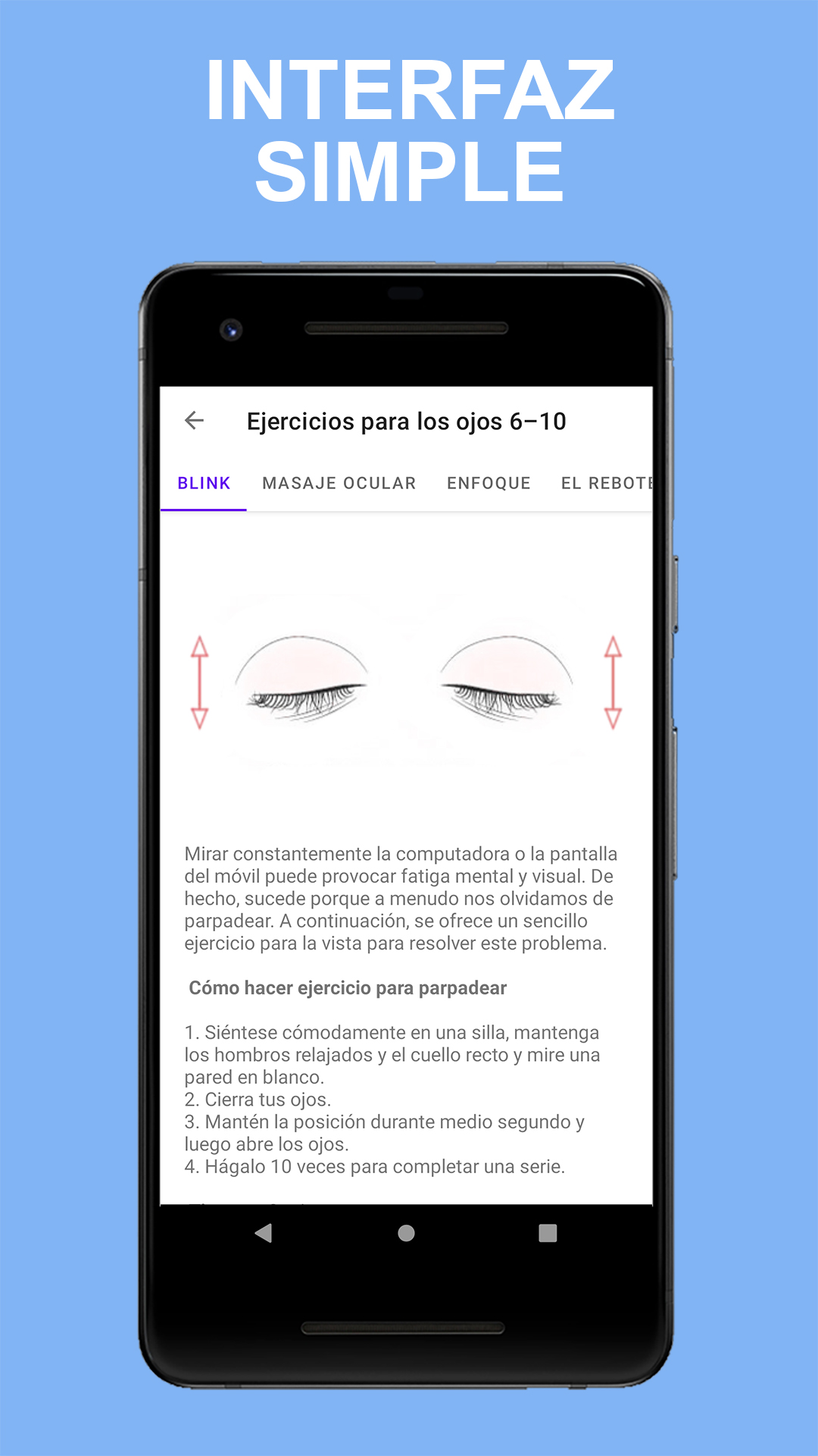 Ejercitar los ojos es como ejercitar los brazos y las piernas. Sus músculos se fortalecerán, tendrá más resistencia y será menos probable que desarrolle una mayor discapacidad visual debido a la fatiga visual. Nuestros ojos también necesitan ejercicio regular al igual que el resto de nuestro cuerpo. Sabemos que ejercitar nuestros músculos es bueno para nuestra salud. ¿Qué pasa con los ejercicios oculares para mejorar la vista? Si bien no existen ejercicios oculares efectivos para el astigmatismo, la miopía o la hipermetropía, también conocidos como errores de refracción, los ejercicios oculares pueden ayudar a optimizar las habilidades visuales. Se ha demostrado que la terapia de la vista, un tipo de fisioterapia para los ojos, mejora ciertas condiciones relacionadas con la alineación y el enfoque de los ojos. Durante la terapia de la vista, al paciente se le prescribe una serie de ejercicios oculares para el ojo vago, entre otras afecciones. Si bien estar bajo el cuidado de un oculista puede brindar más orientación sobre cómo utilizar los ejercicios oculares, existen algunos ejercicios para los músculos oculares que se pueden hacer en casa. Si bien no esperaría que estos ejercicios oculares mejoren la visión rápidamente, con diligencia pueden ayudar gradualmente con los problemas de enfoque y la fatiga visual. Beneficios de los ejercicios para los ojos El ejercicio para los ojos, tradicionalmente en forma de terapia visual, puede ayudar a garantizar que los dos ojos funcionen juntos de manera eficaz. Hay síntomas comunes que pueden indicar que los ejercicios de fortalecimiento de los ojos pueden ser útiles. Estos incluyen saltarse líneas o palabras al leer, cerrar los ojos, fatiga visual y dolor de cabeza. La terapia de la vista puede abordar problemas con el giro de los ojos (estrabismo) y el ojo vago (ambliopía), seguimiento ocular (disfunción sacádica) y formación de equipos de ojos (insuficiencia de convergencia). Se ha demostrado que los ejercicios para el ojo vago son particularmente útiles para corregir esta afección, especialmente cuando se detecta temprano. La aplicación contiene 15 ejercicios oculares que puede hacer en casa a diario: ✓ El rollo de ojos ✓ El frotamiento ✓ El dedo en movimiento ✓ The Eye Press ✓ Flexión ✓ Parpadeo ✓ Masaje de ojos ✓ Enfoque ✓ El rebote de los ojos ✓ Palmeo ✓ Trace-An-Eight ✓ La mirada de reojo ✓ Escribir mensajes ✓ El doble pulgar hacia arriba ✓ Trate los párpados Vivimos en una era en la que miramos el texto y las imágenes en las pantallas de las computadoras, televisores y teléfonos móviles, lo que provoca fatiga visual y posibles trastornos oculares relacionados con la edad. Los ejercicios oculares regulares pueden ayudarlo a mejorar la vista y prevenir enfermedades oculares como la miopía y la hipermetropía. Solo toman un par de minutos, se pueden hacer en cualquier lugar y en cualquier momento, y también pueden ayudarlo a concentrarse mejor cuando trabaja en su computadora. Nota: si tiene visión borrosa o doble, más dolores de cabeza de lo habitual o si ha pasado más de un año desde su última consulta oftalmológica, visite a su optometrista.