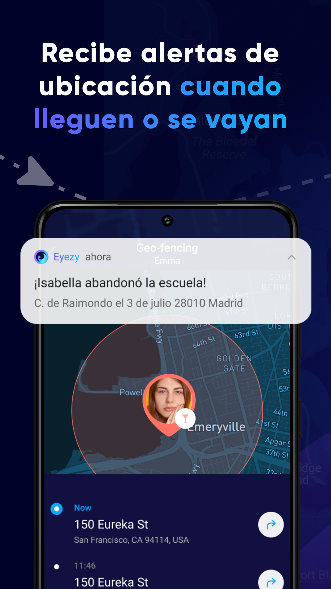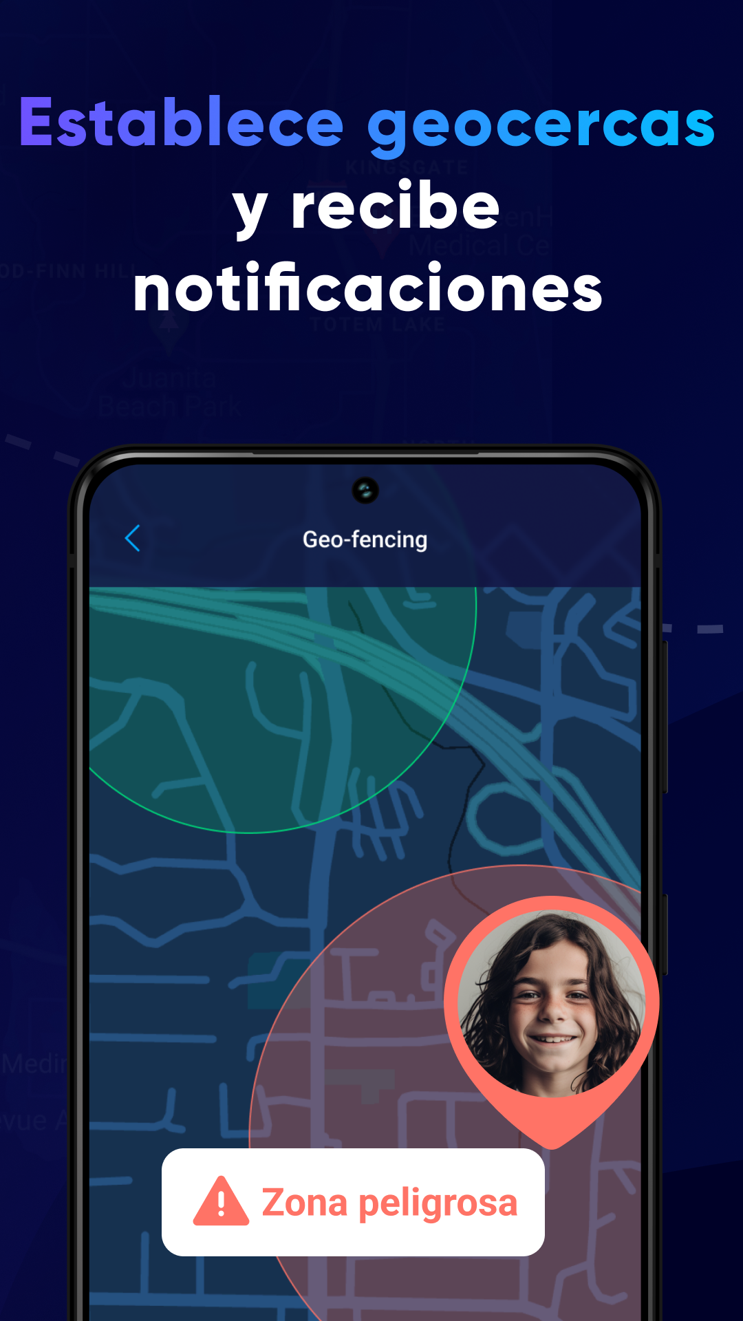Establezca ubicaciones permitidas y prohibidas para recibir alertas sobre sus movimientos. El rastreador GPS detecta cuando sus hijos ingresan a áreas que ha marcado como inapropiadas y le informa al respecto y comparte la ubicación del niño con los padres.