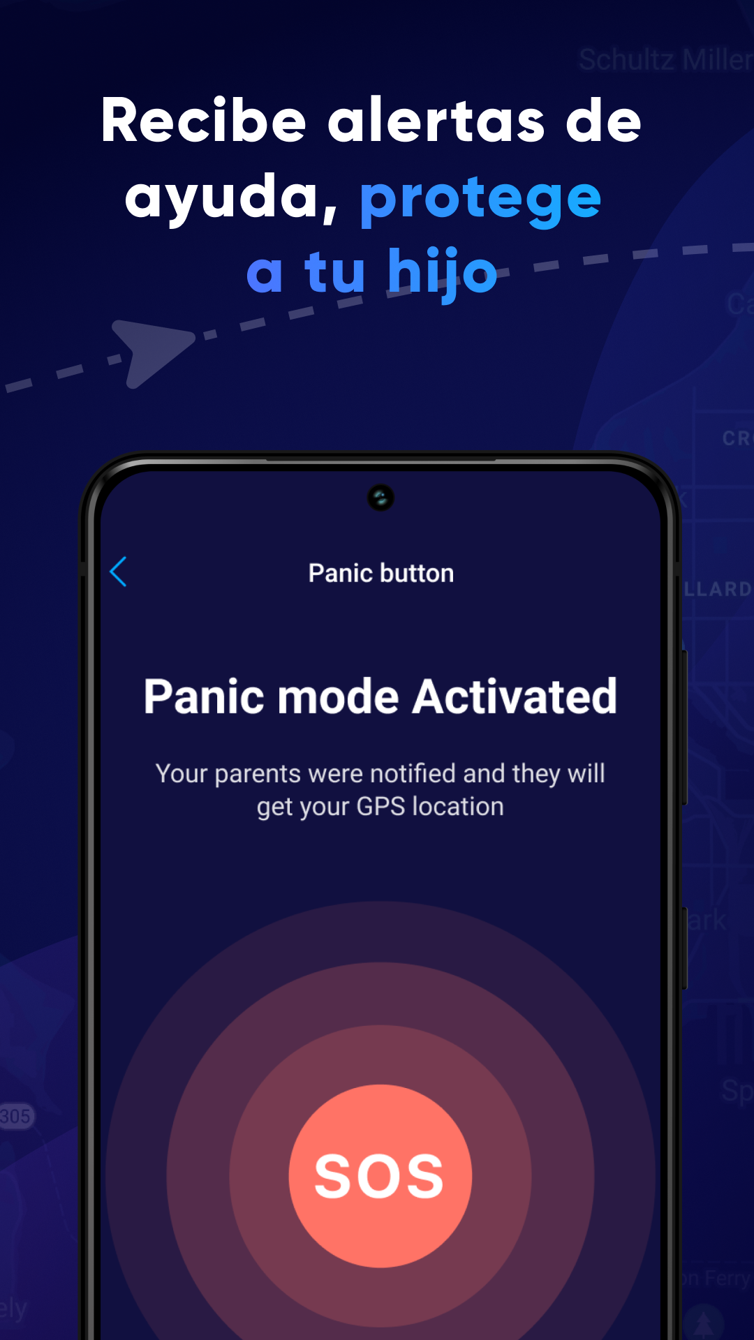 Rastreador de ubicación de teléfono equipado con un botón de pánico. Si su hijo necesita su ayuda o está en peligro, puede presionar el botón de pánico para pedirle que "me busque o encuentre mi dispositivo". Recibirá una notificación de que el niño está en peligro. Nuestra aplicación de seguimiento le mostrará la geolocalización de su hijo y le ayudará a llegar al rescate a tiempo.